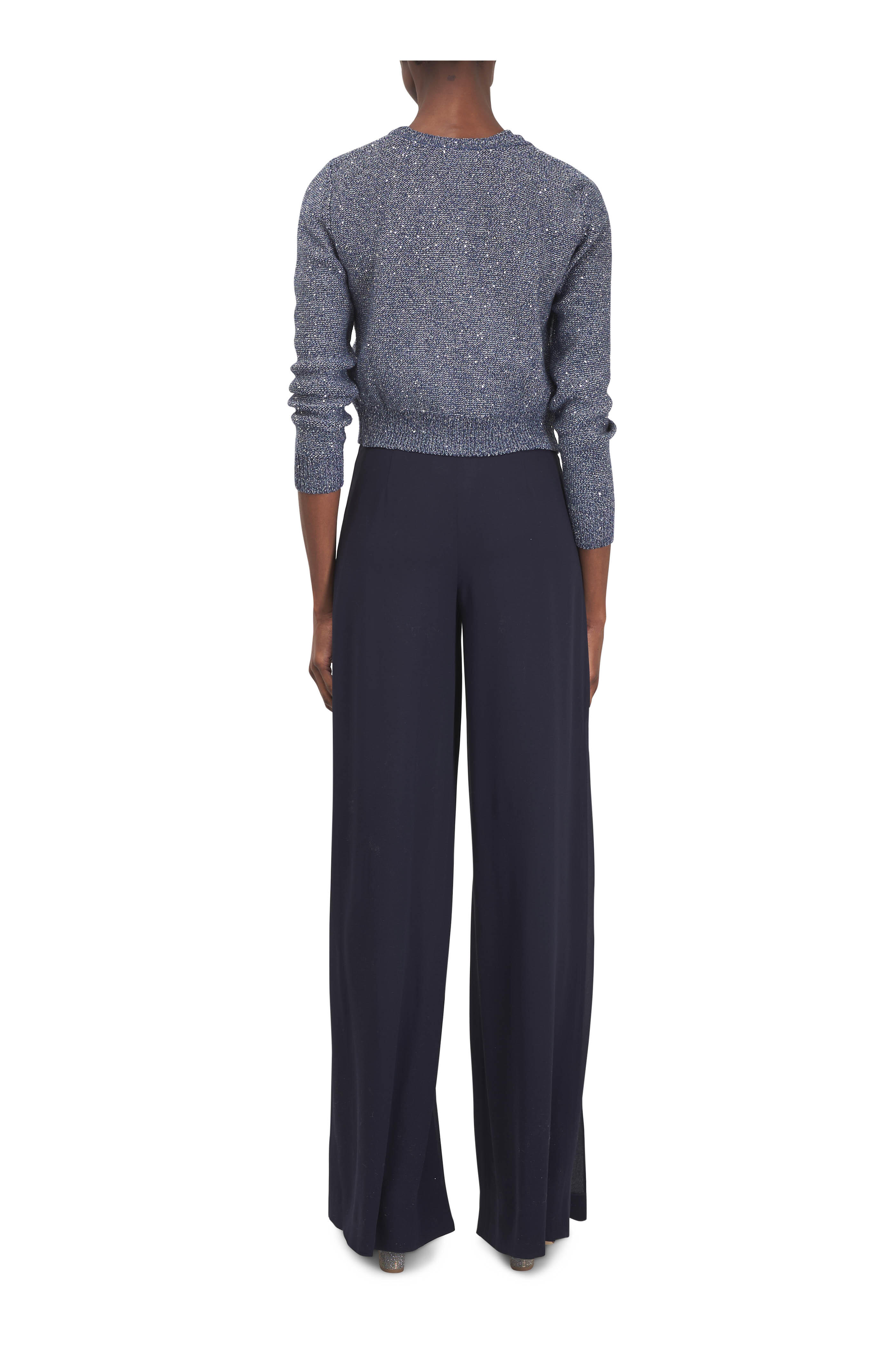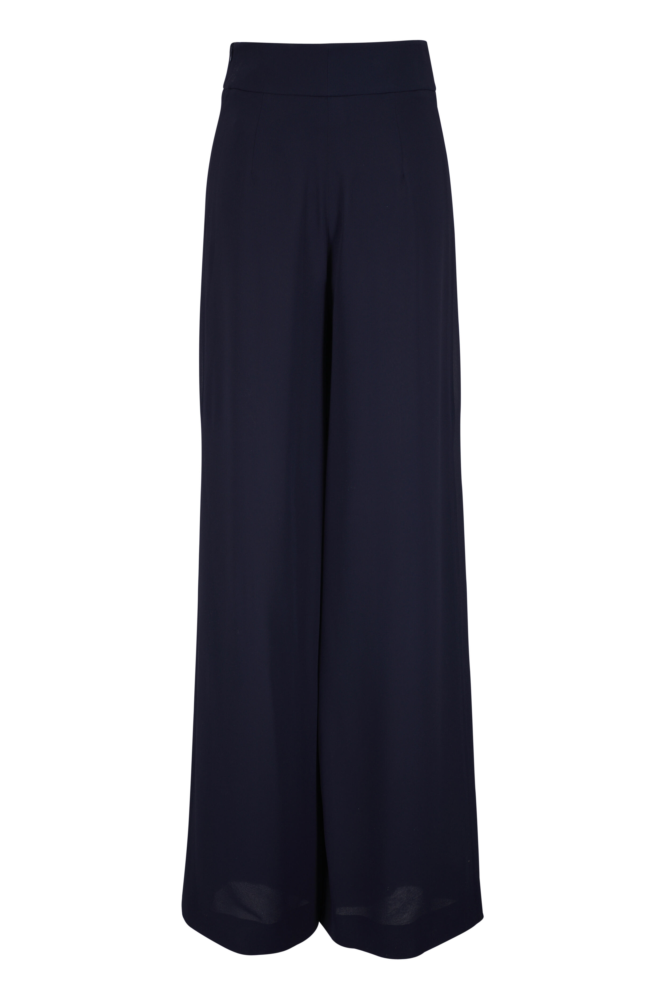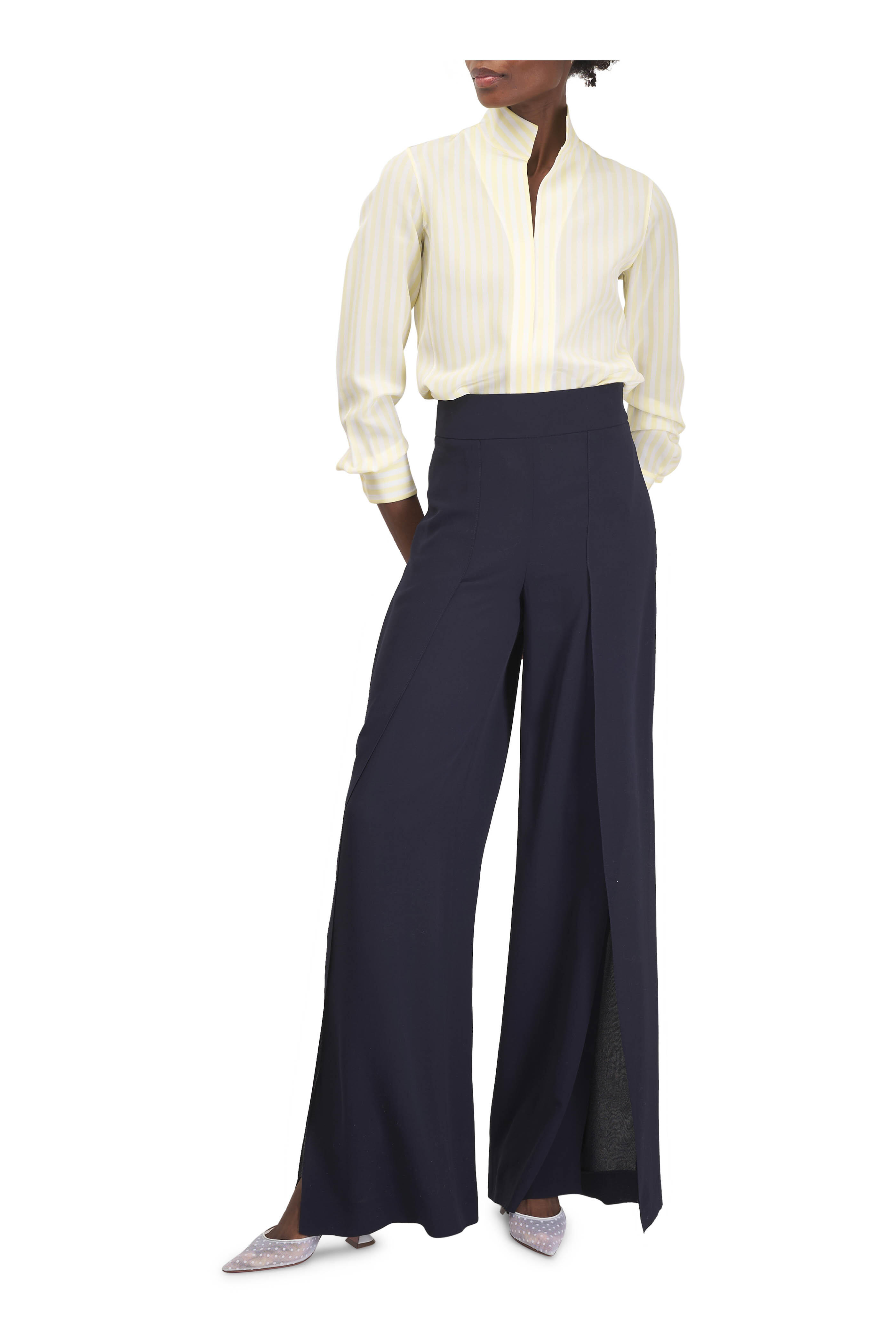 Concealed side zip. Banded waist. Front slits with flowing silk. Fabric from Italy. Inseam: 37". 100% silk. Dry clean.