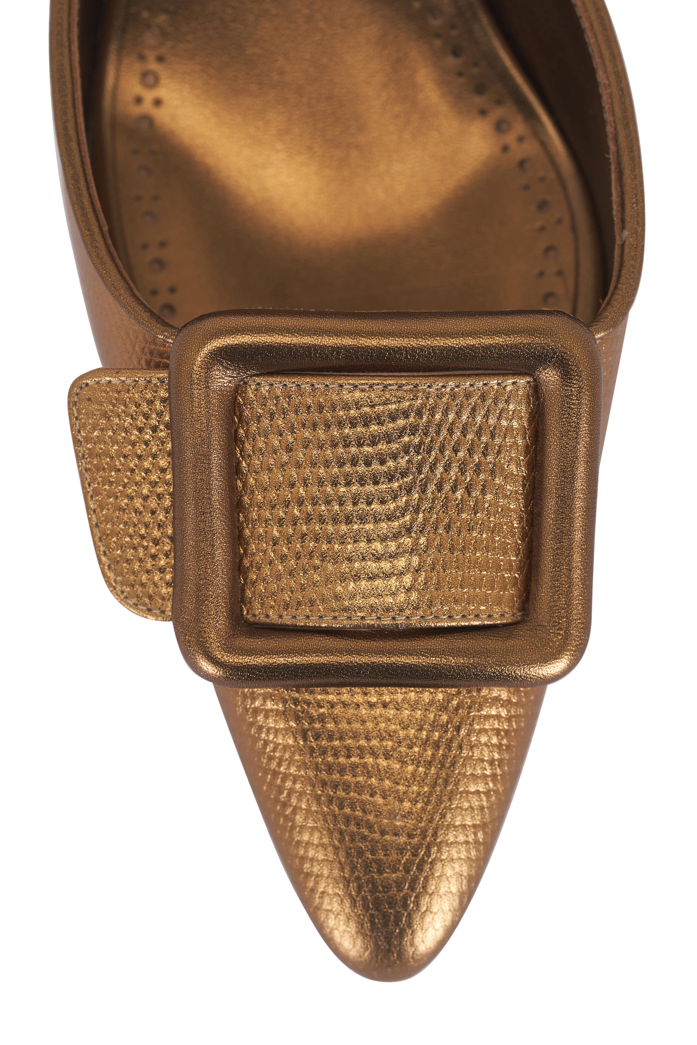 Embossed leather upper. Pointed toe. Slip-on style. Leather lining and insole. Leather sole. Low stiletto heel. Decorative buckle design. Made in Italy. Heel height: 50mm.