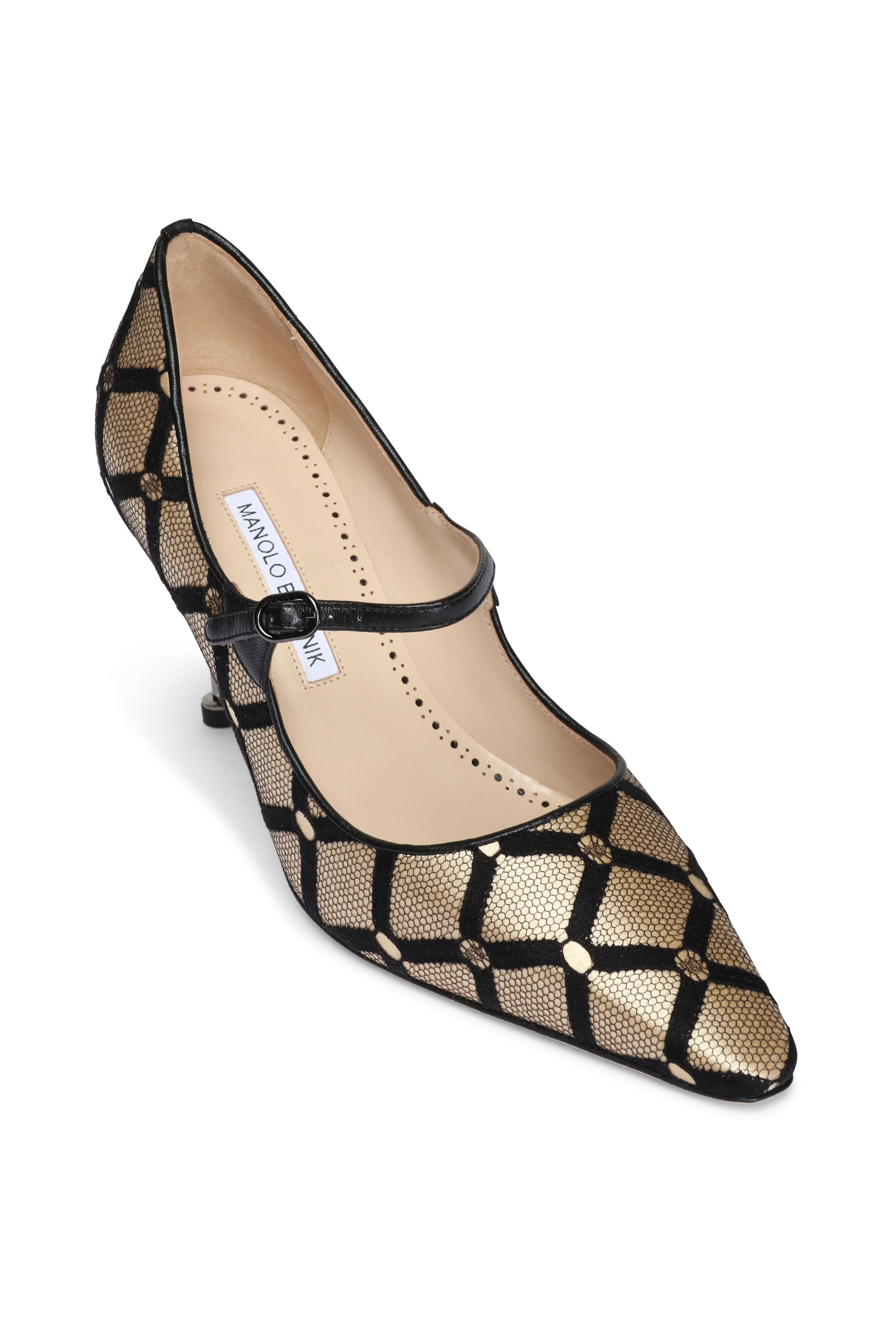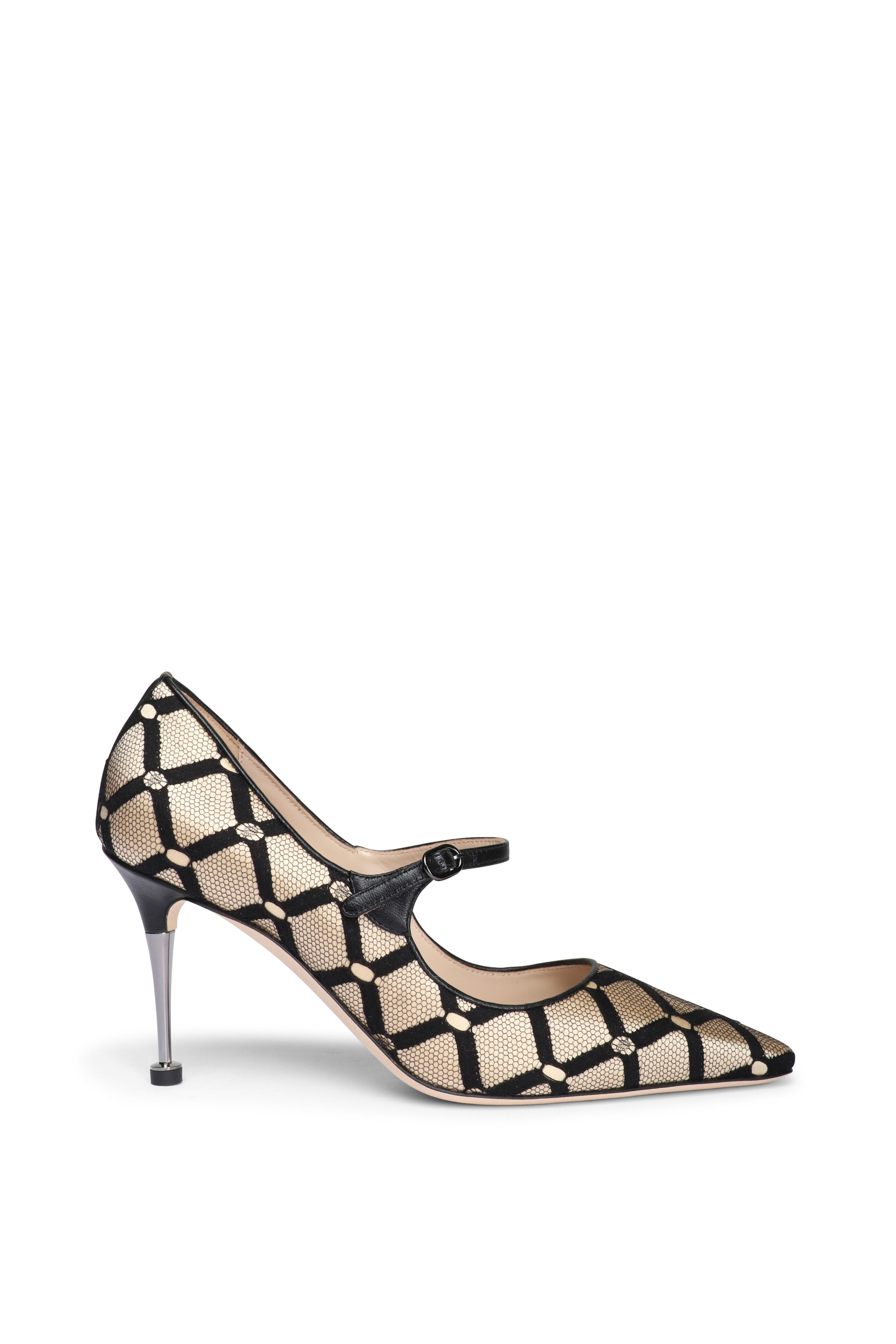 Satin upper. Leather lining and sole. Pointed toe. Adjustable buckle vamp. Netting design. Slip-on. Stiletto heel. Made in Italy. Heel measurement: 90mm.