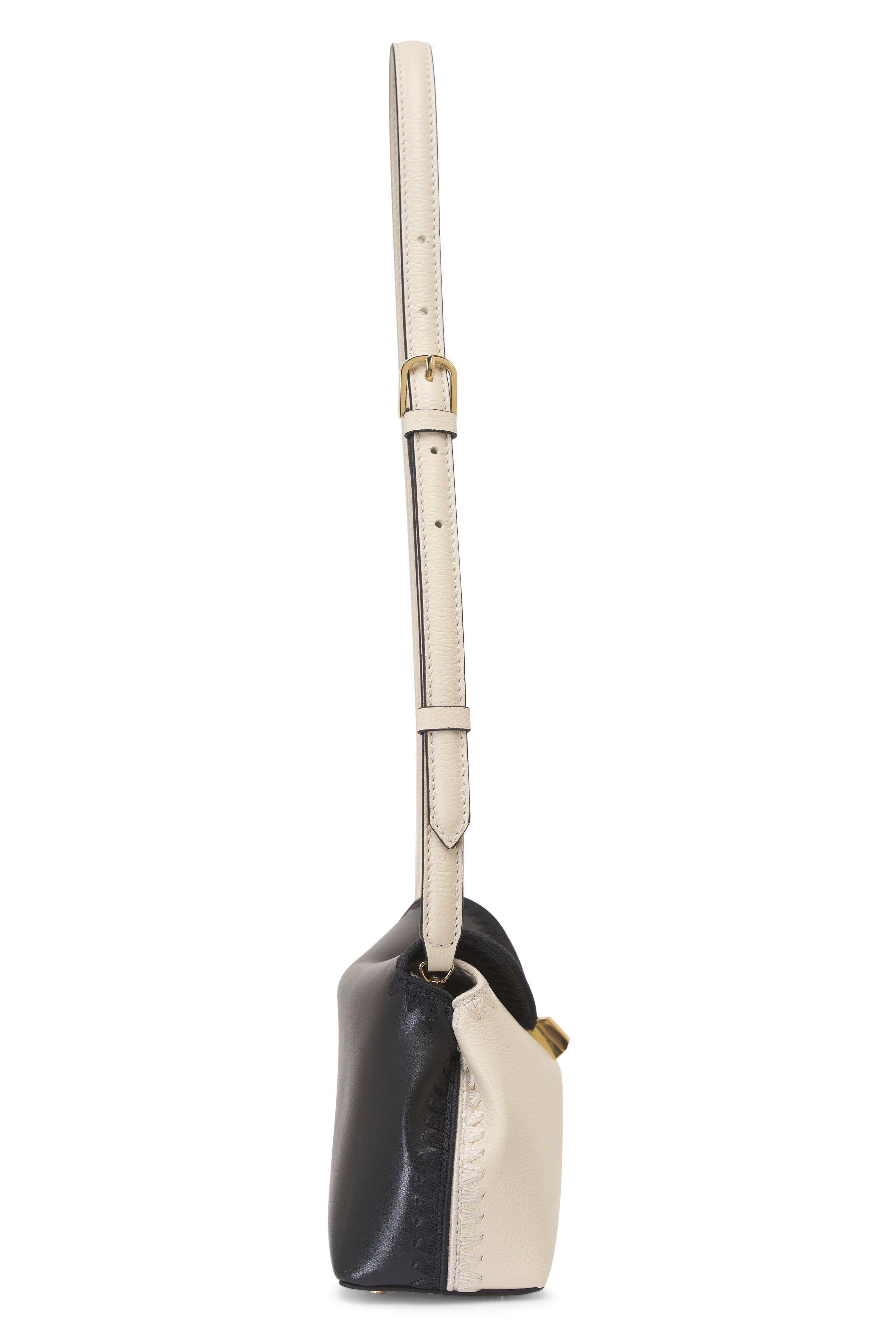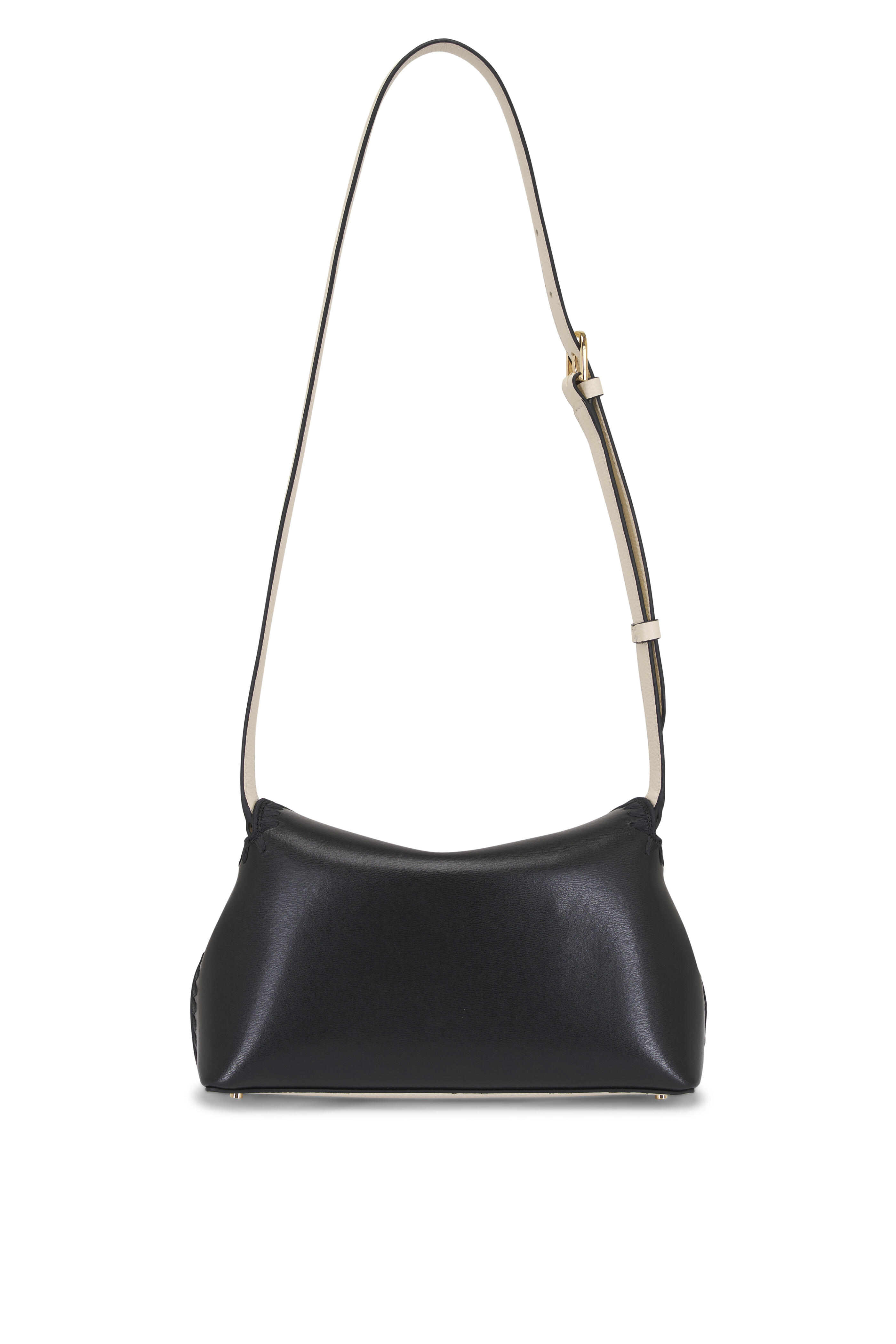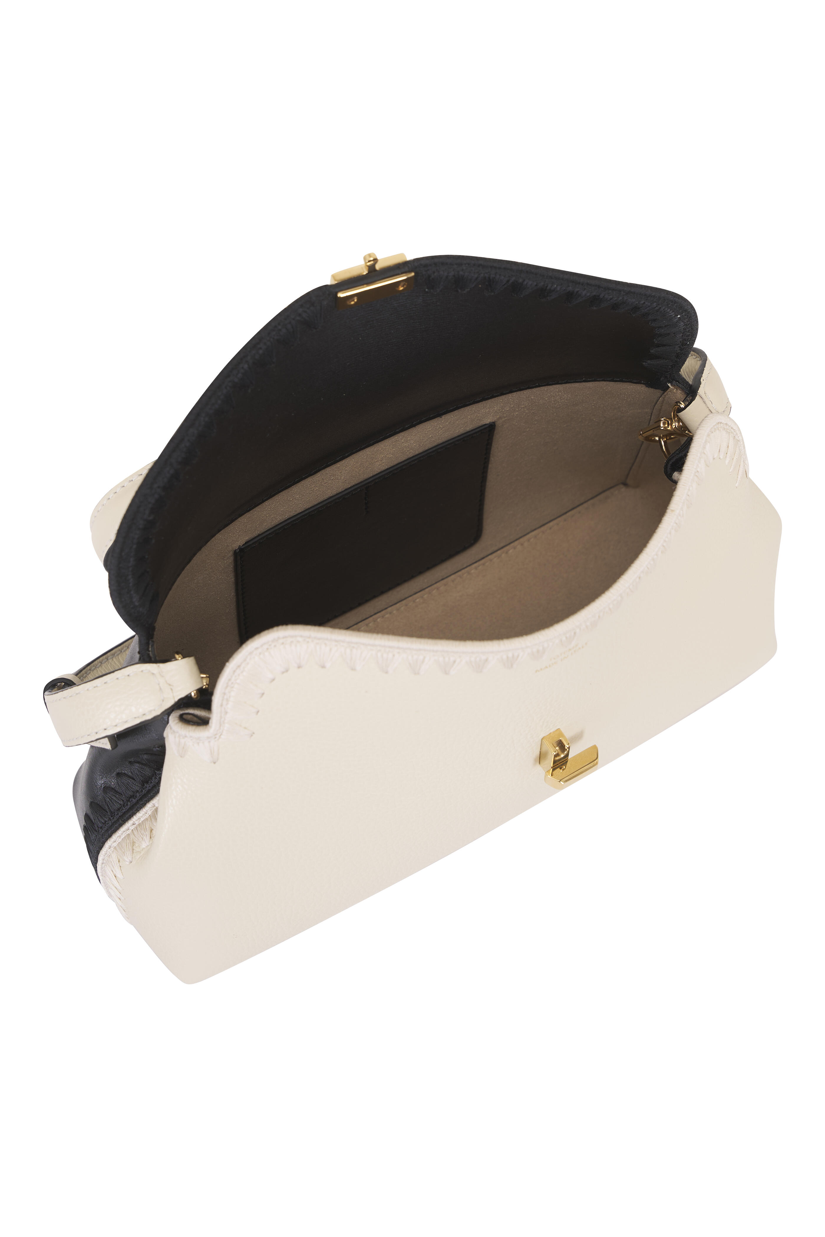 Grained and smooth leather. Adjustable and removable leather shoulder strap. Front flap; t-lock closure. Interior card slot. Suede lining. Protective metal feet. Made in Italy. 10" width. 5.5" height. Approx. 4" depth. 18" adjustable strap drop.