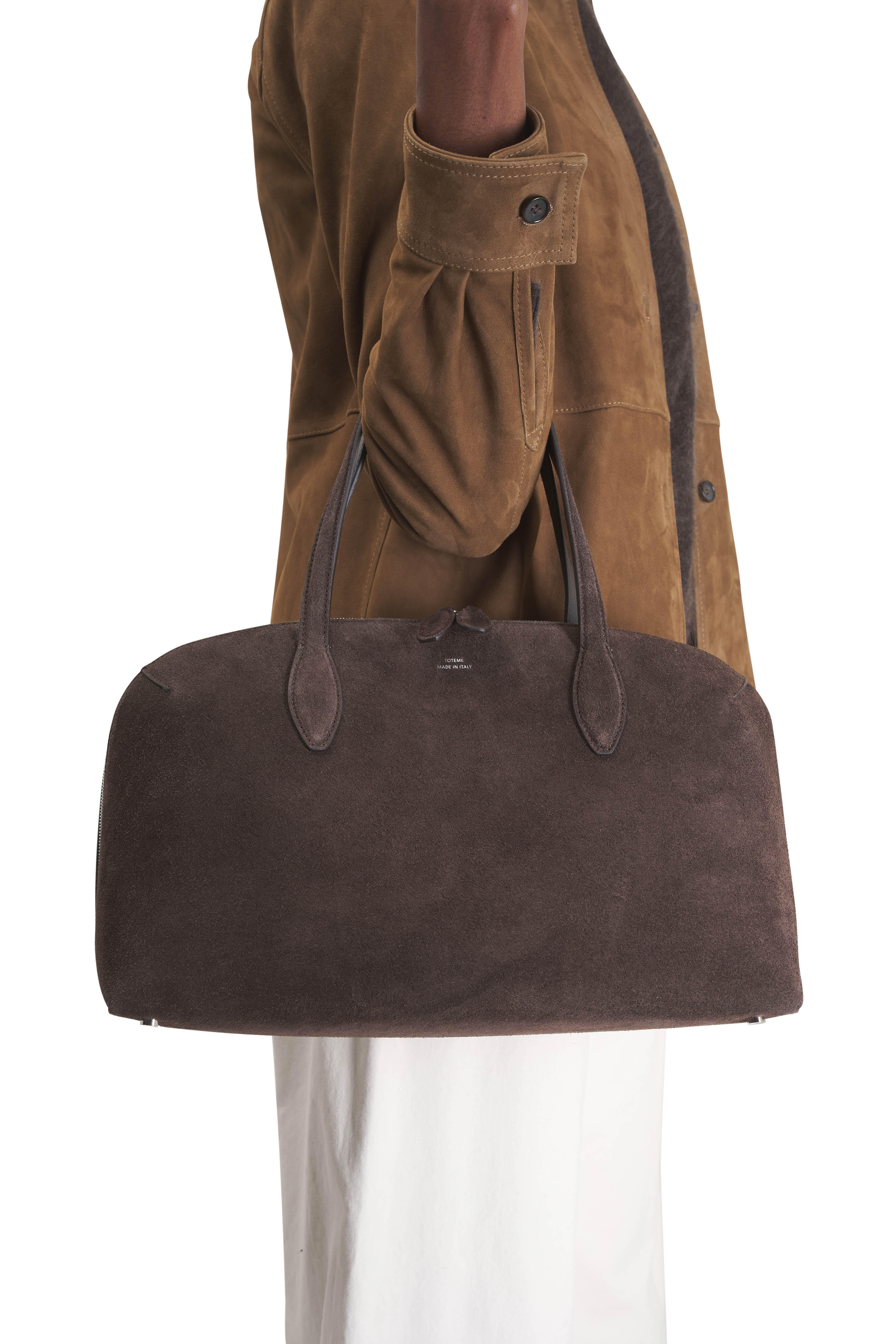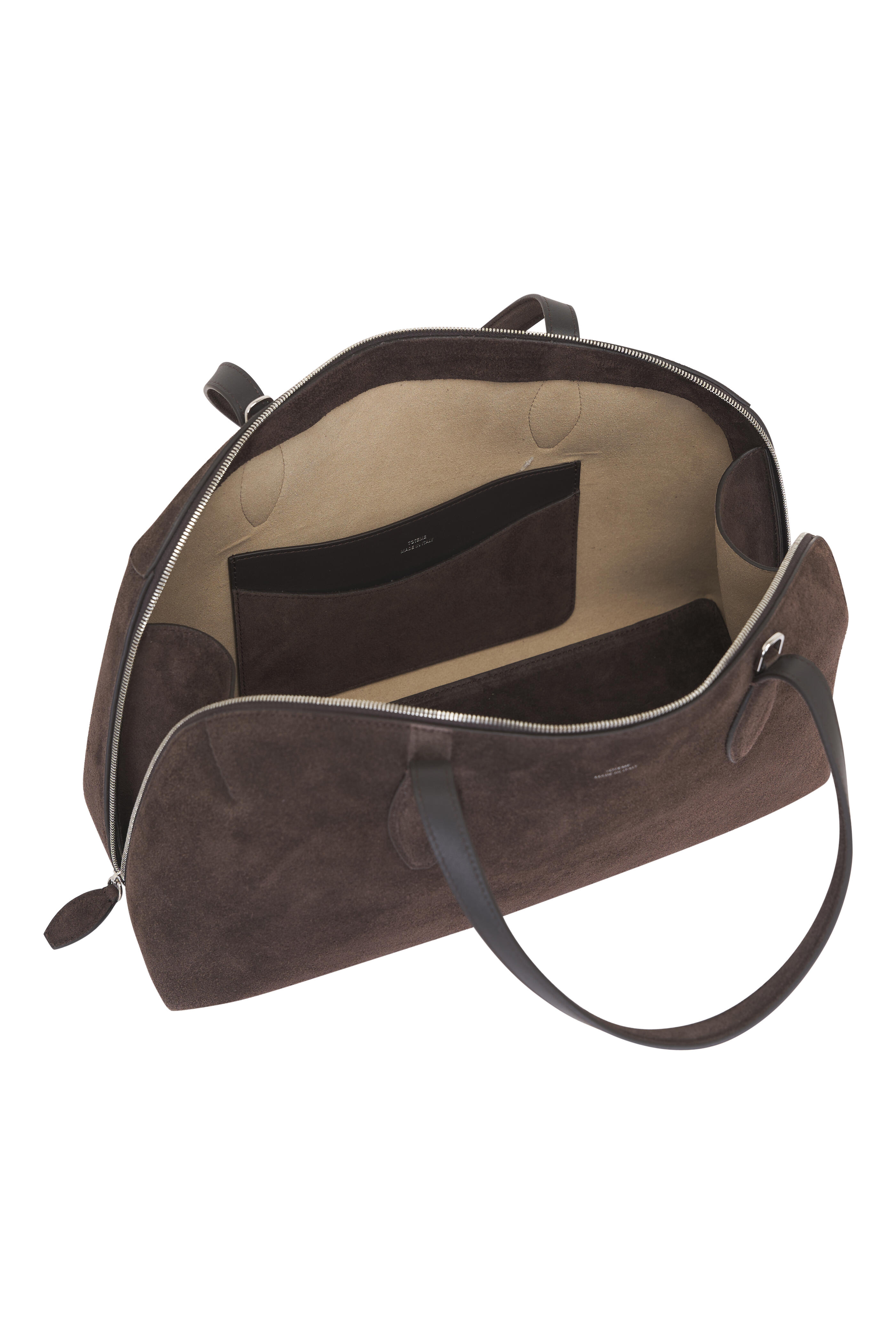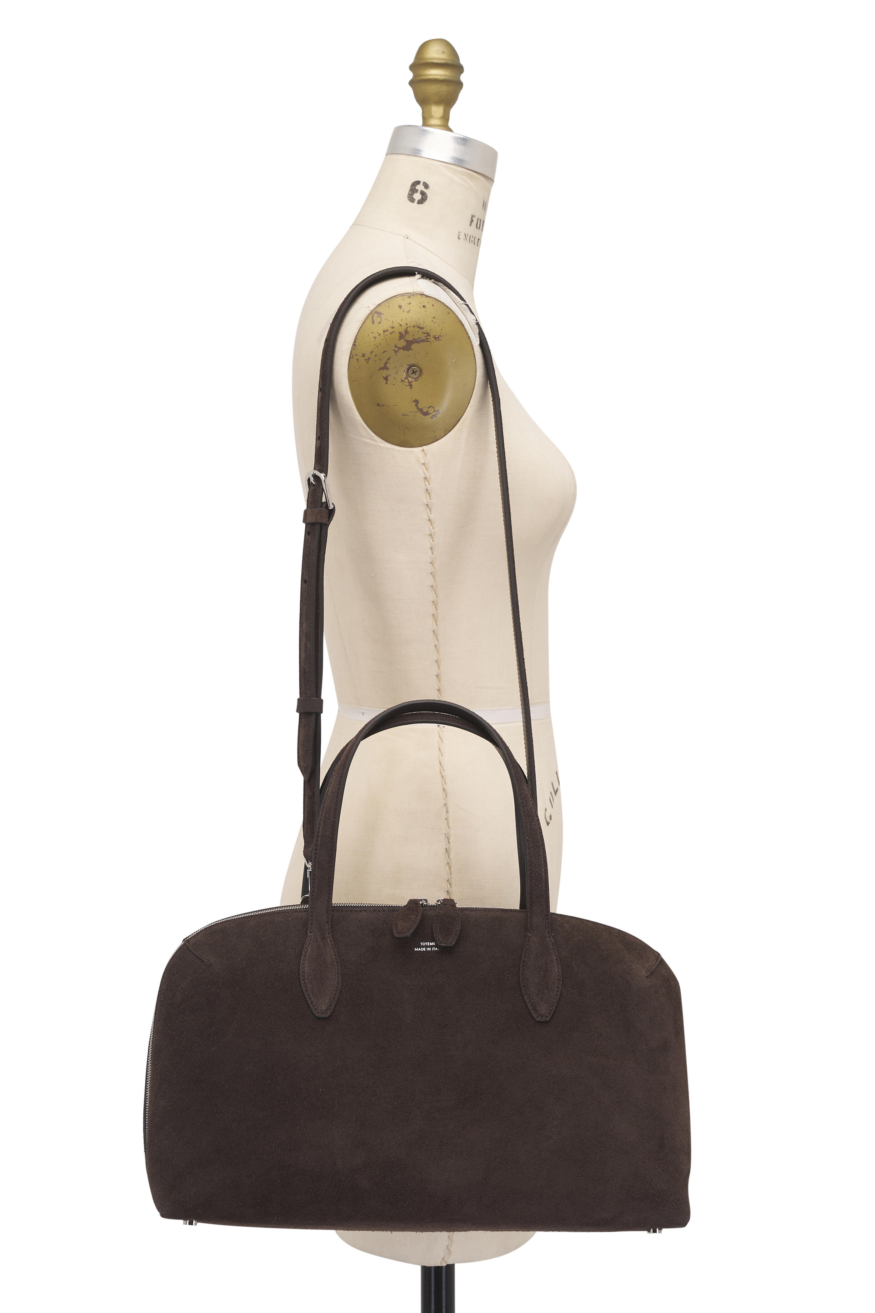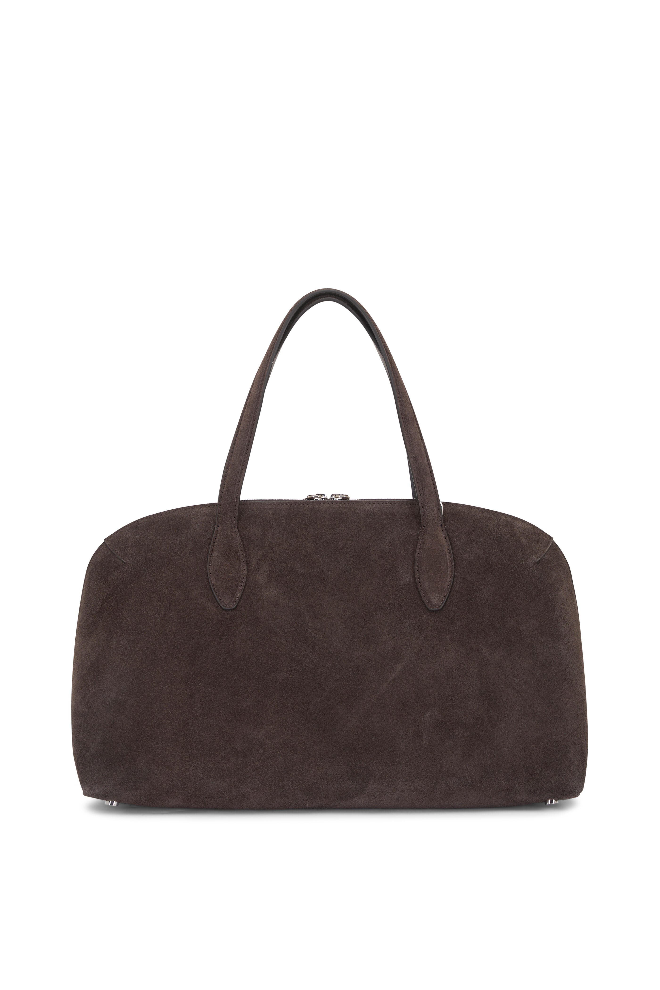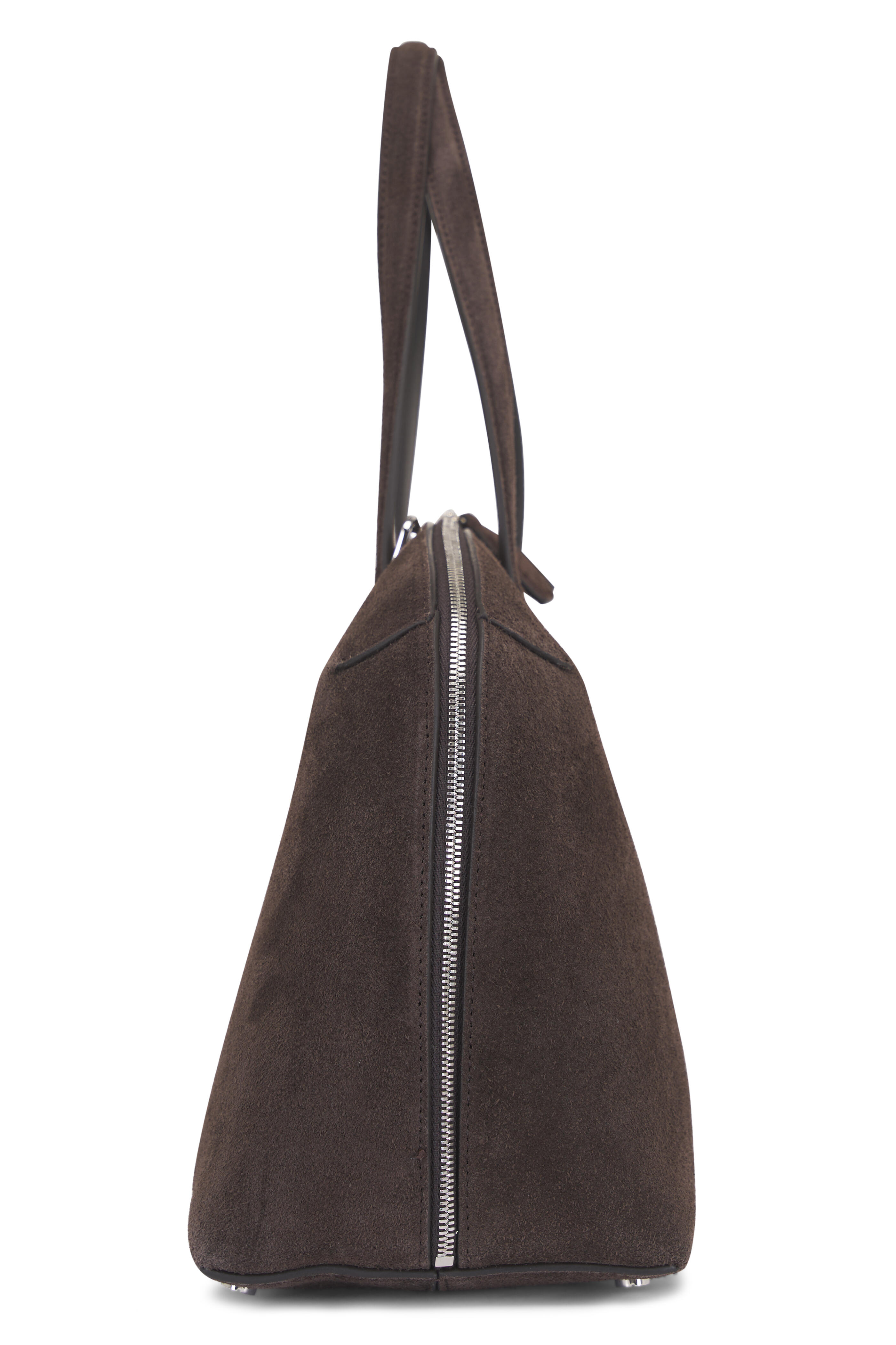 Suede. Dual top handles; removable and adjustable shoulder strap. Silver-tone metal zipper. Interior slip pocket. Microsuede lining. Protective metal feet. Made in Italy. Top handle 14cm/5.5". Height 23cm/9". Width 36cm/14". Depth 14cm/5.5".