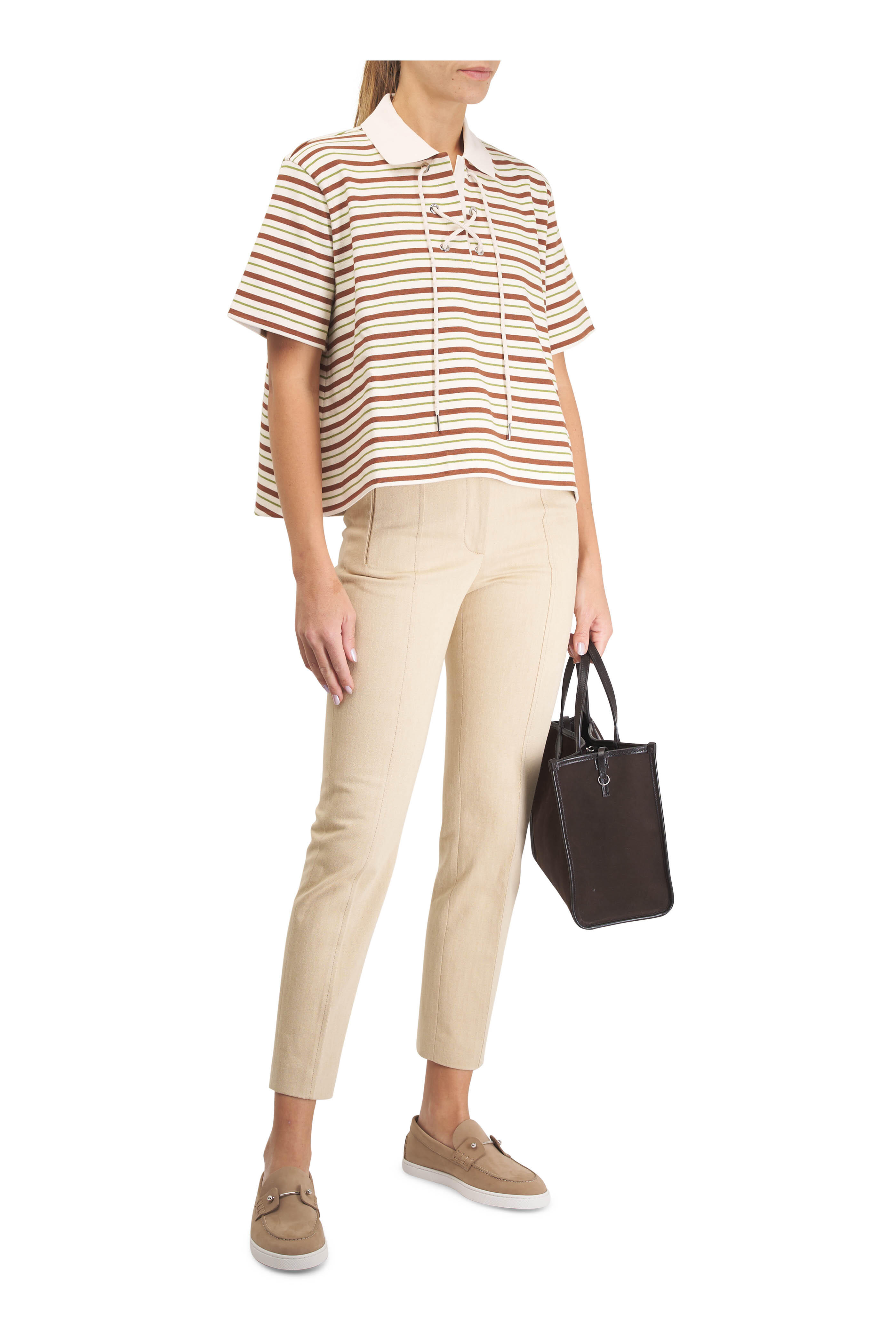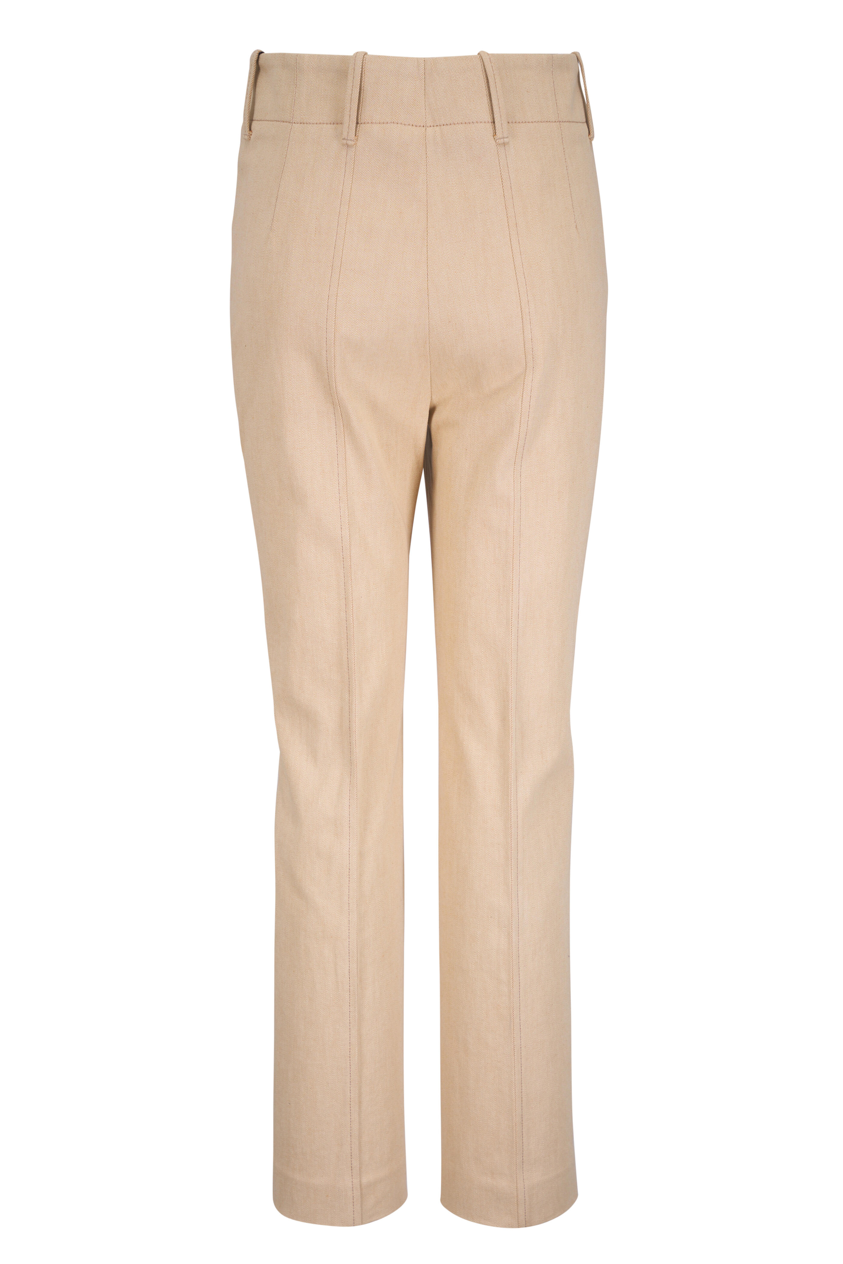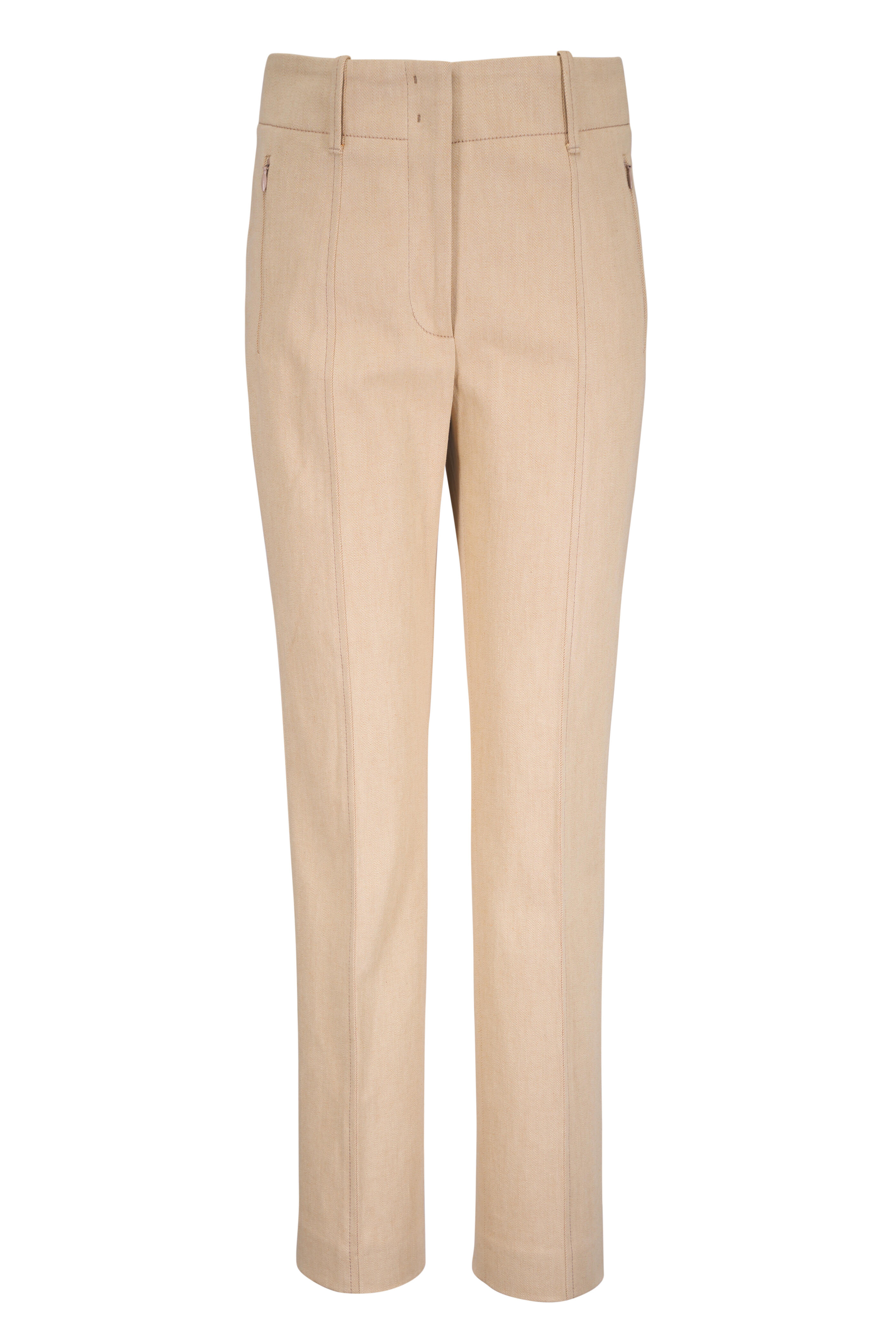 Zip fly; hook closure; elasticized waist. Side zip pockets. Pleated front. Straight hem. Made in Italy. 28" inseam. 95% cotton, 5% polyurethane. Dry clean.