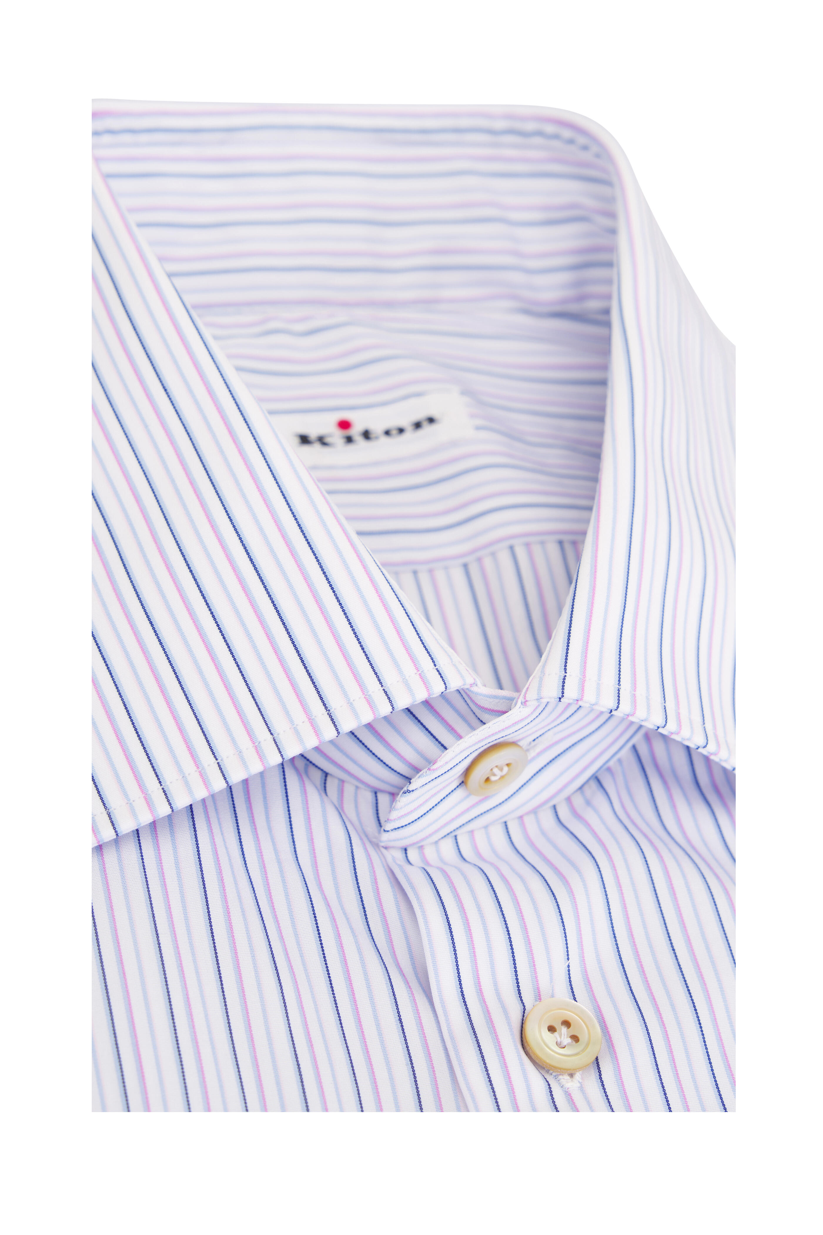 Spread collar. French front button placket. Single button barrel cuffs. Made in Italy. 100% cotton. Dry clean.