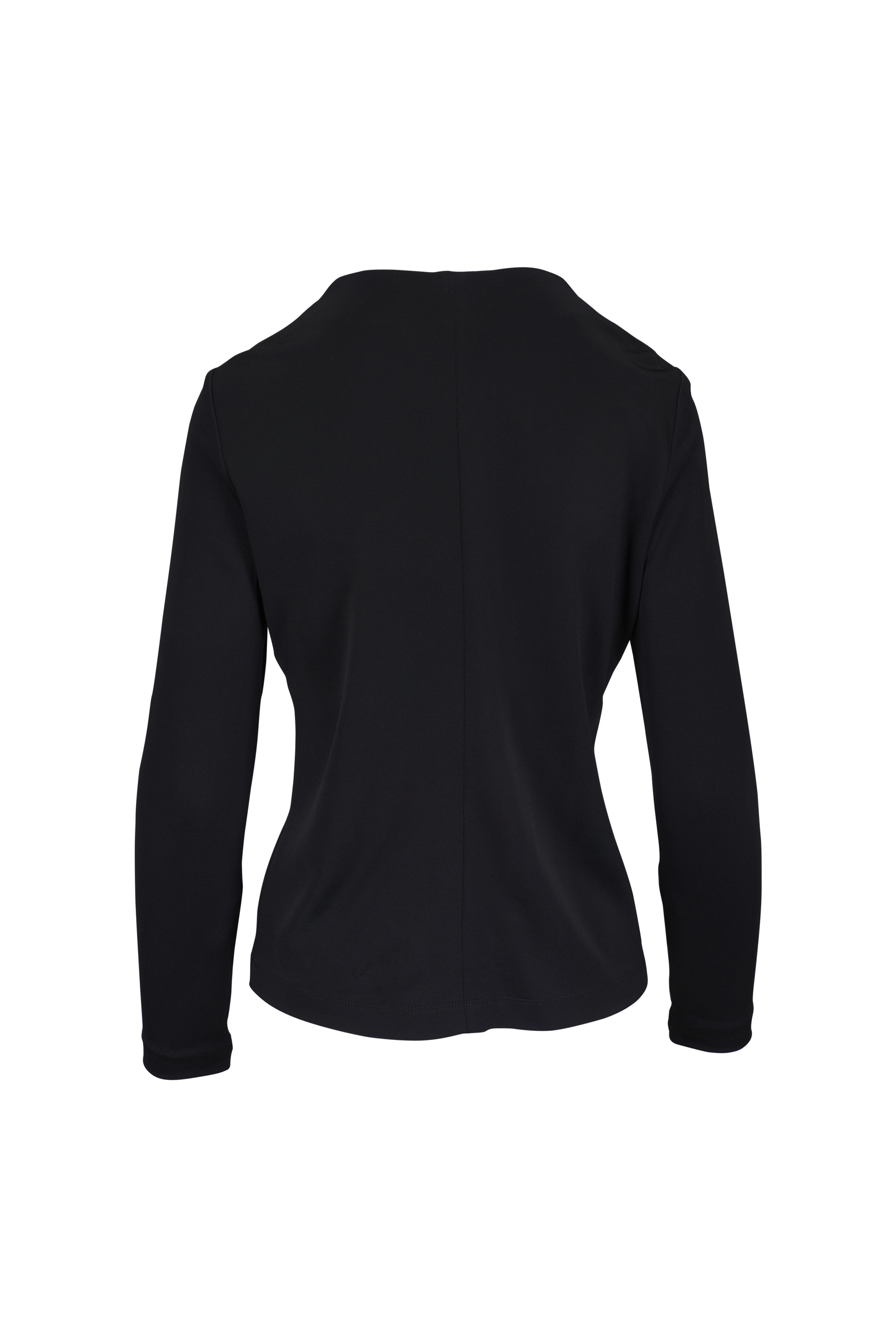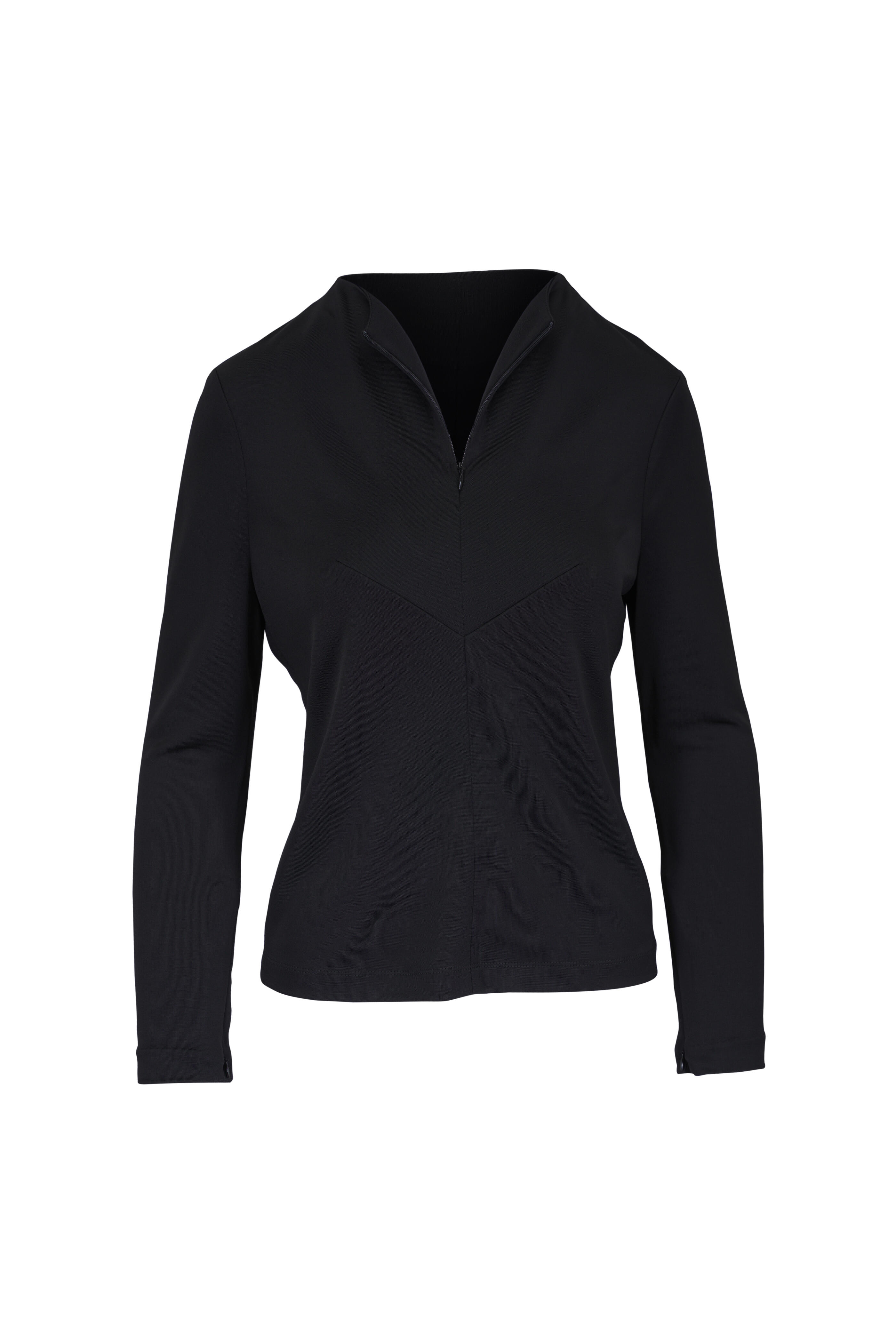 Adjustable neckline with center front zipper. Darts at bust. Adjustable cuffs with hidden zippers. Made in the USA. Approximately 24" shoulder to hem (measurements taken from size S). 89% viscose, 11% polyamide. Dry clean.