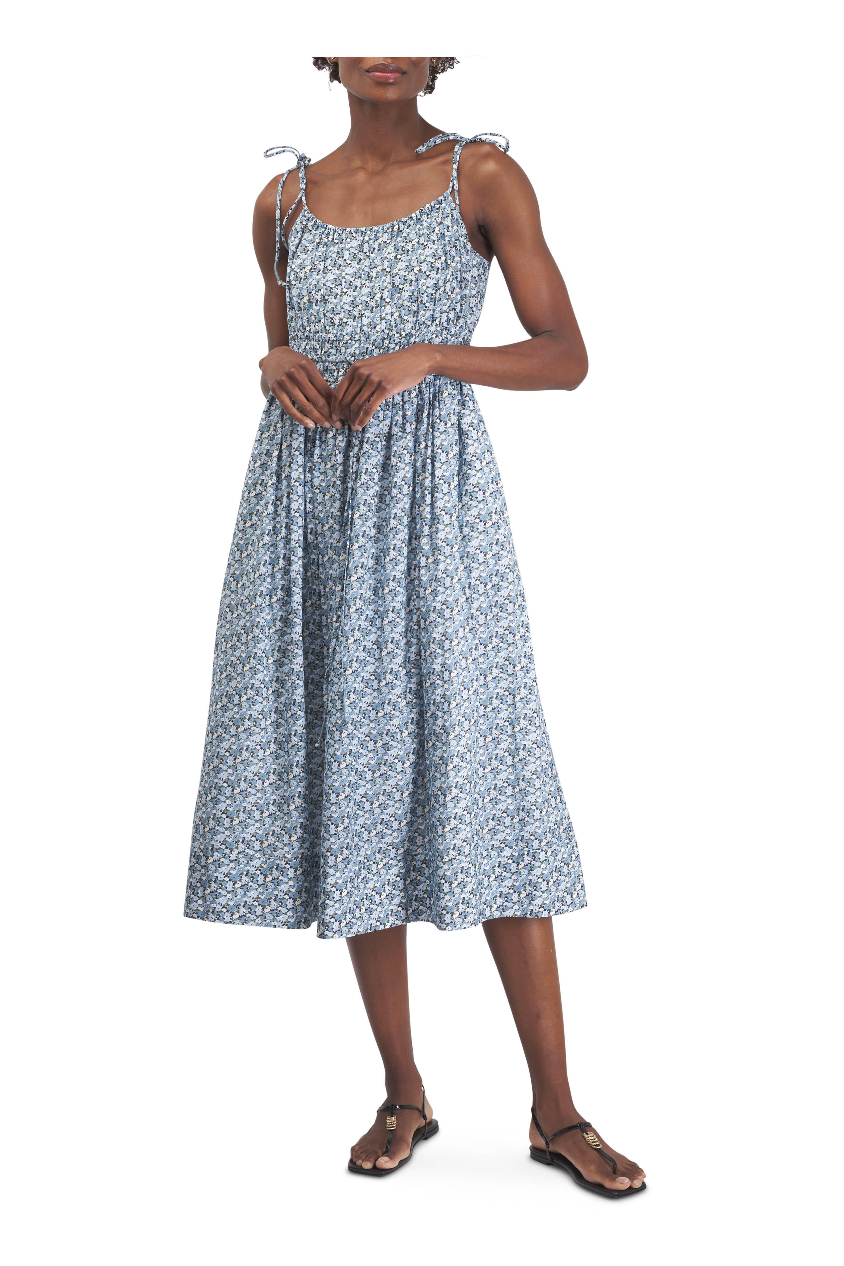 Scoop neckline. Slip-on style. Thin, self-tie sash at waist. Shirred waist. Adjustable spaghetti straps. Imported. Approximately 48 ¾" shoulder to hem (measurements taken from size S). 58% cotton, 42% viscose; lining: 100% cotton. Dry clean.