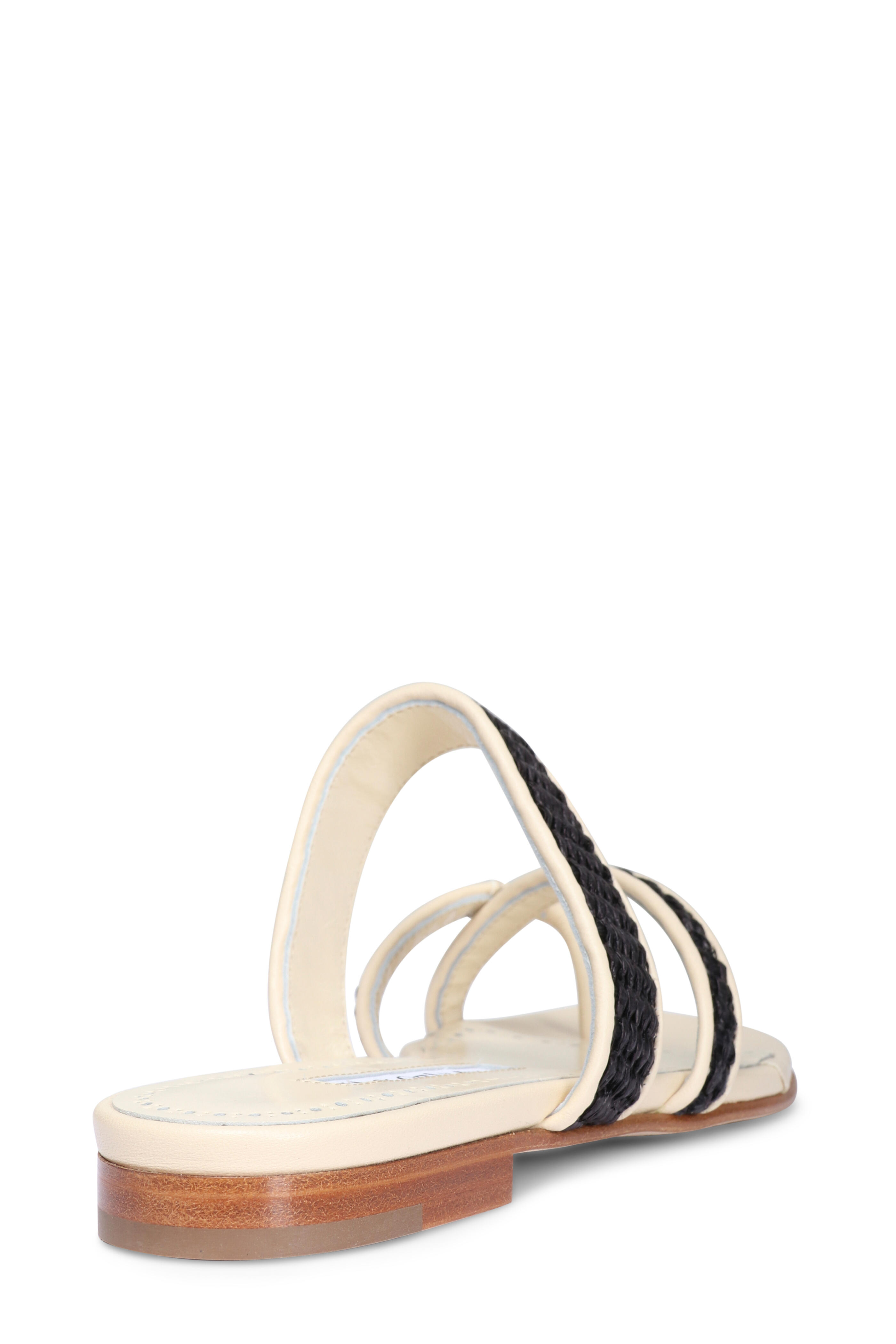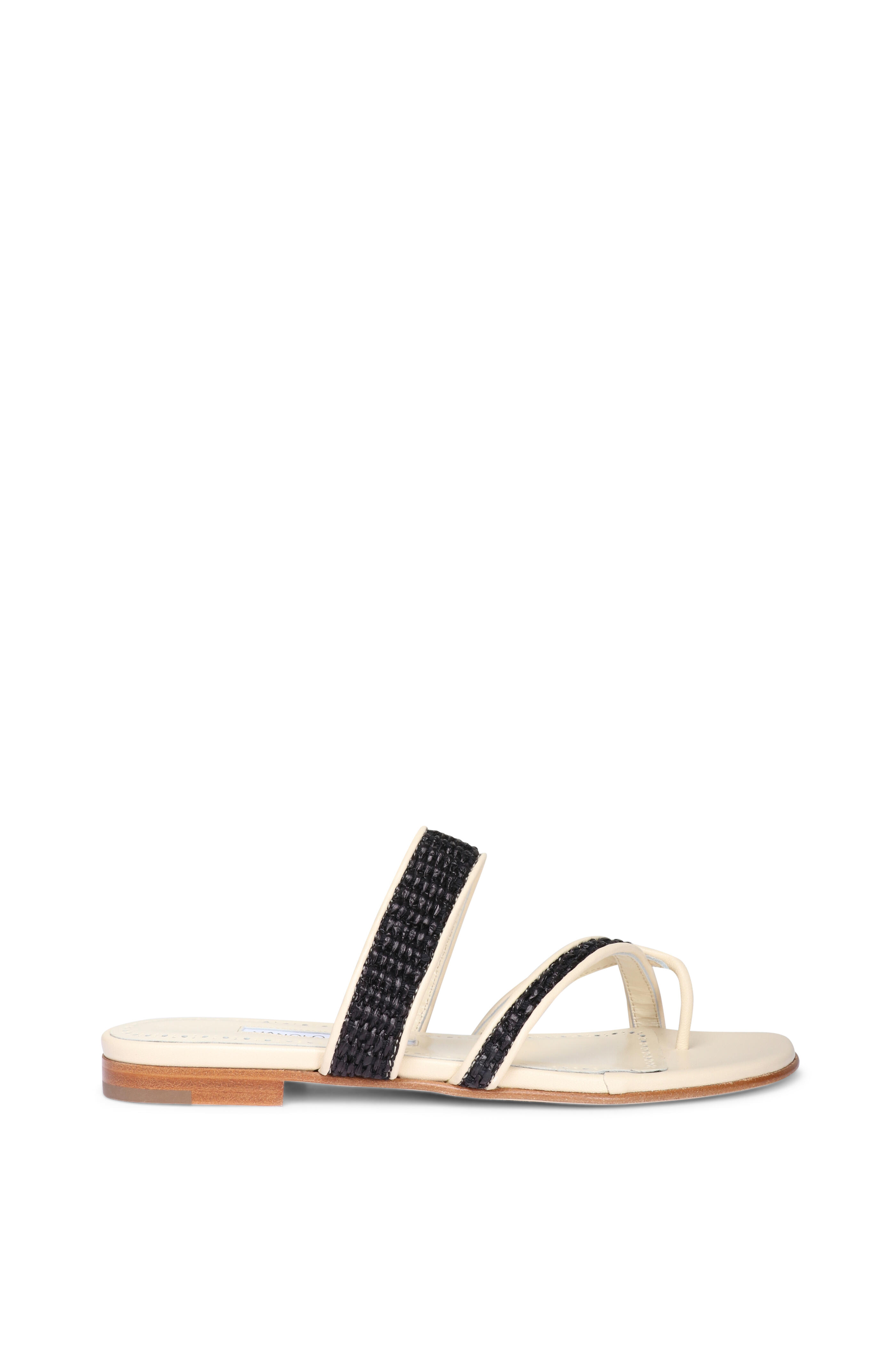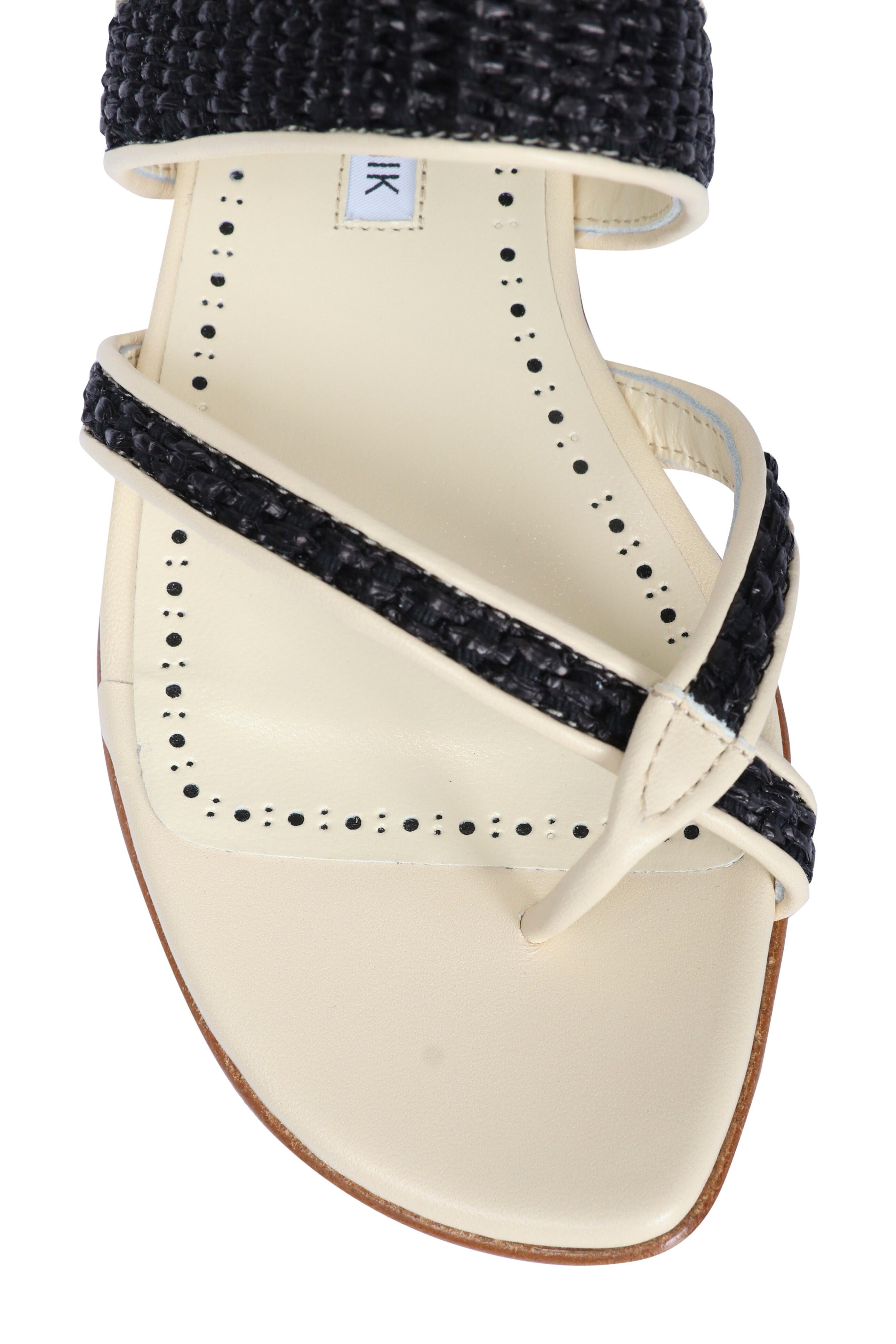 Leather and cotton upper. Leather lining and sole. Open toe. Crisscross toe. Strap. Crossover mid-vamp strap. Woven cotton design. Slip-on style. Made in Italy. Heel measurement: 10mm.