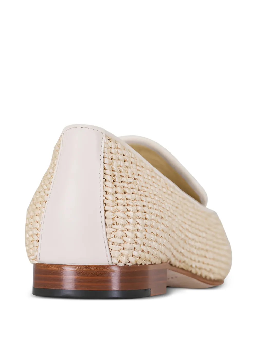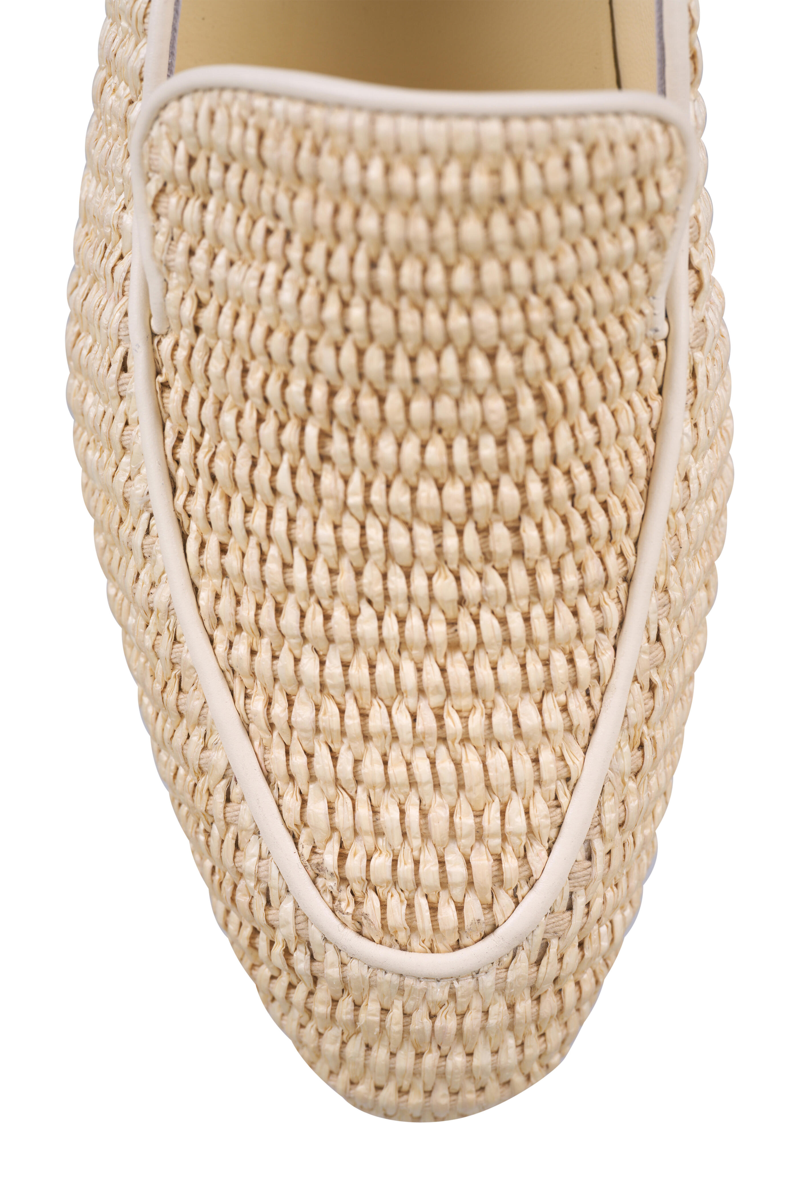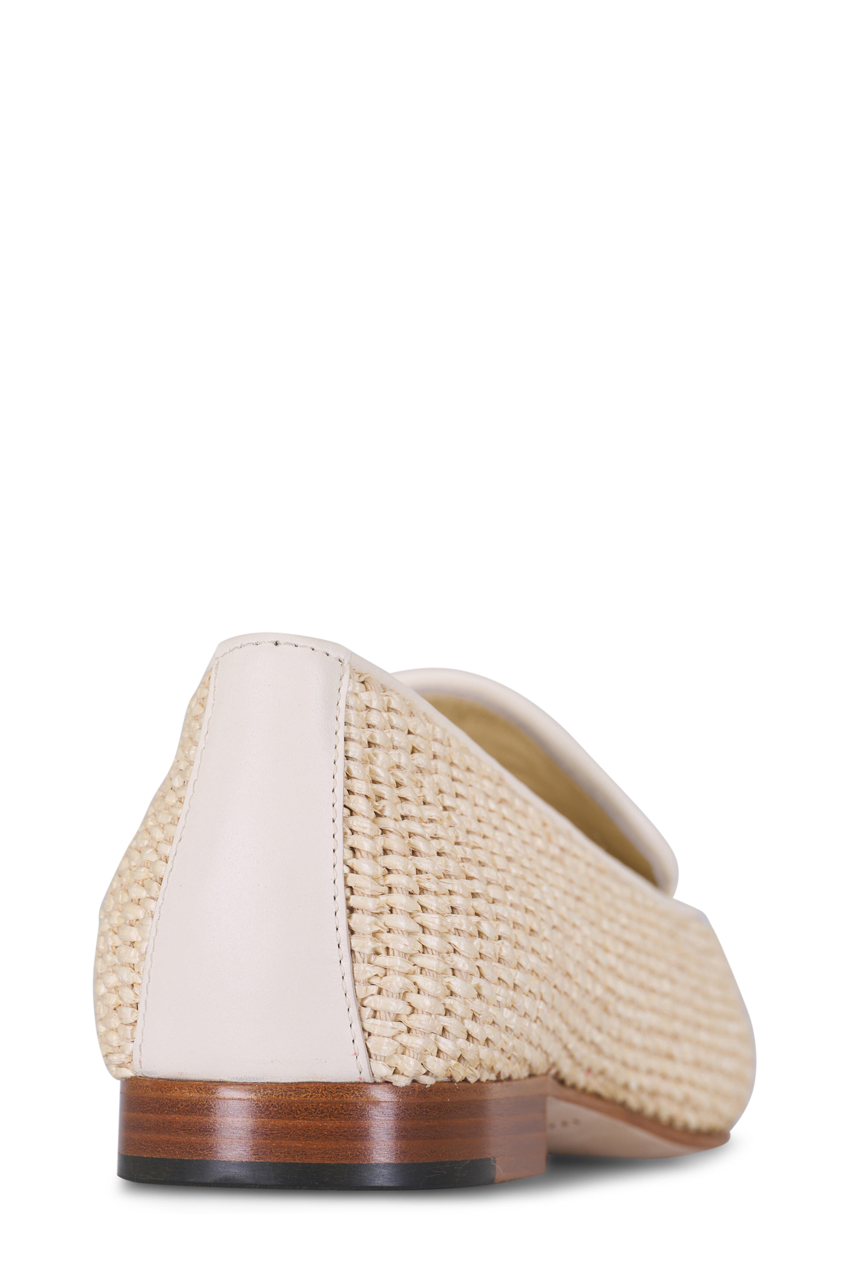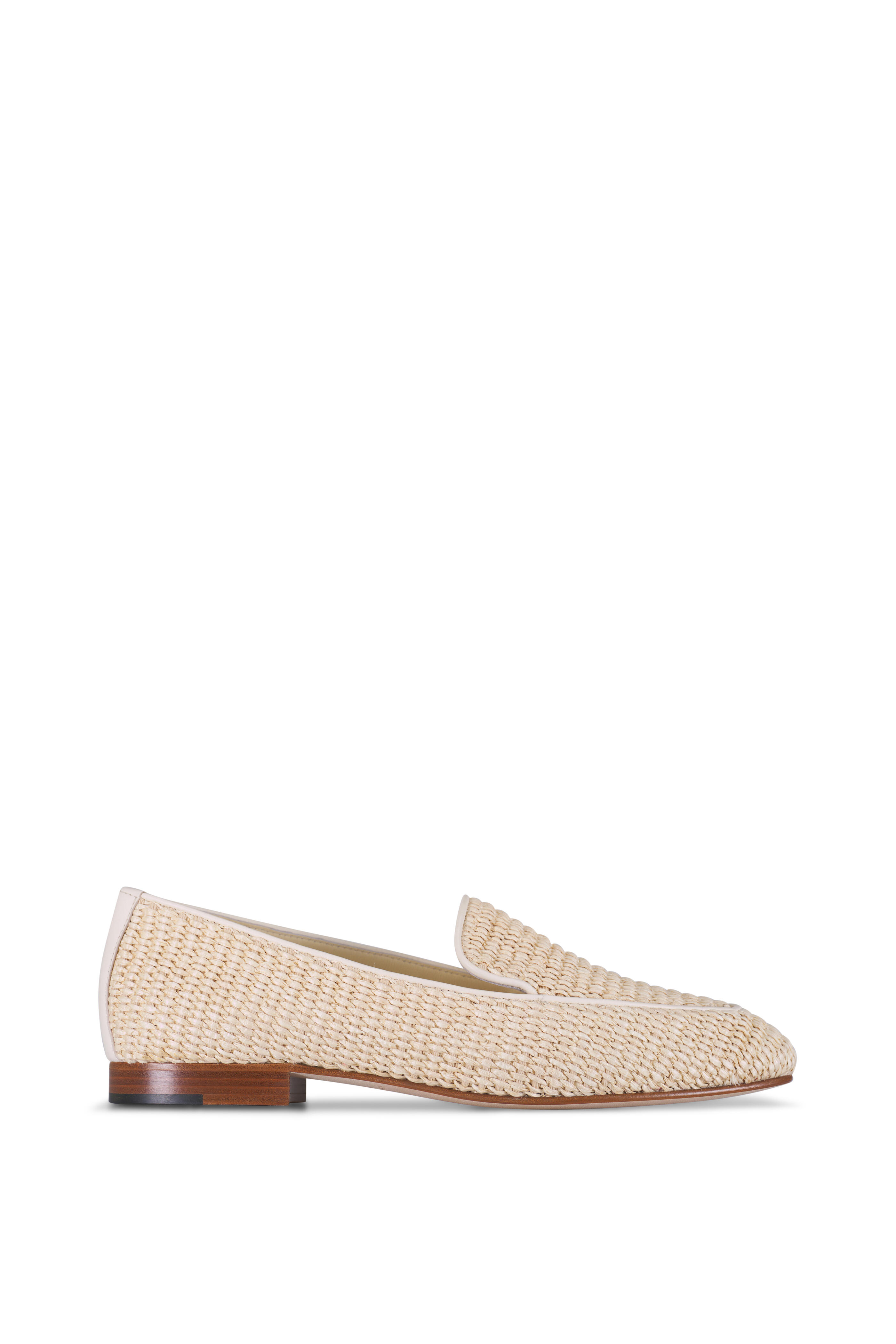 Woven raffia upper. Moc toe. Slip on style. Leather trim. Leather lining and insole. Leather sole. Made in Italy.