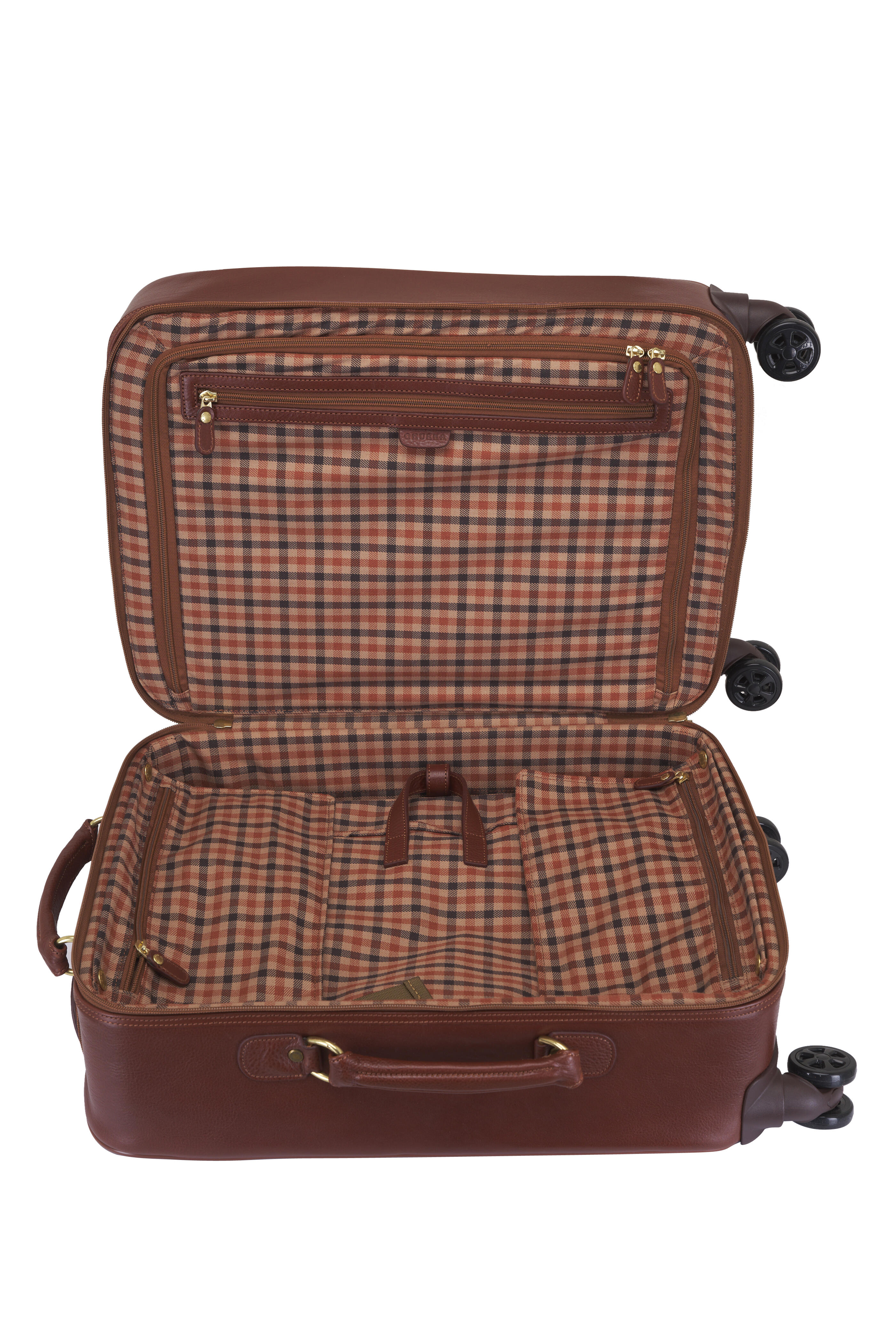 Italian vegetable-tanned, tumbled leather. Ghurka Check cotton twill lining. Brass hardware. Interior zip pocket, 13.75” L. Exterior zip pocket with two accessory pockets and one card holder. Two removable interior zip pockets, 10" L. Trifold garment sleeve and luggage tag included. Handcrafted in the Dominican Republic. 14”L x 22”H x 9”W (12.3 lb). Approved cabin size. 2.5”H wheels.