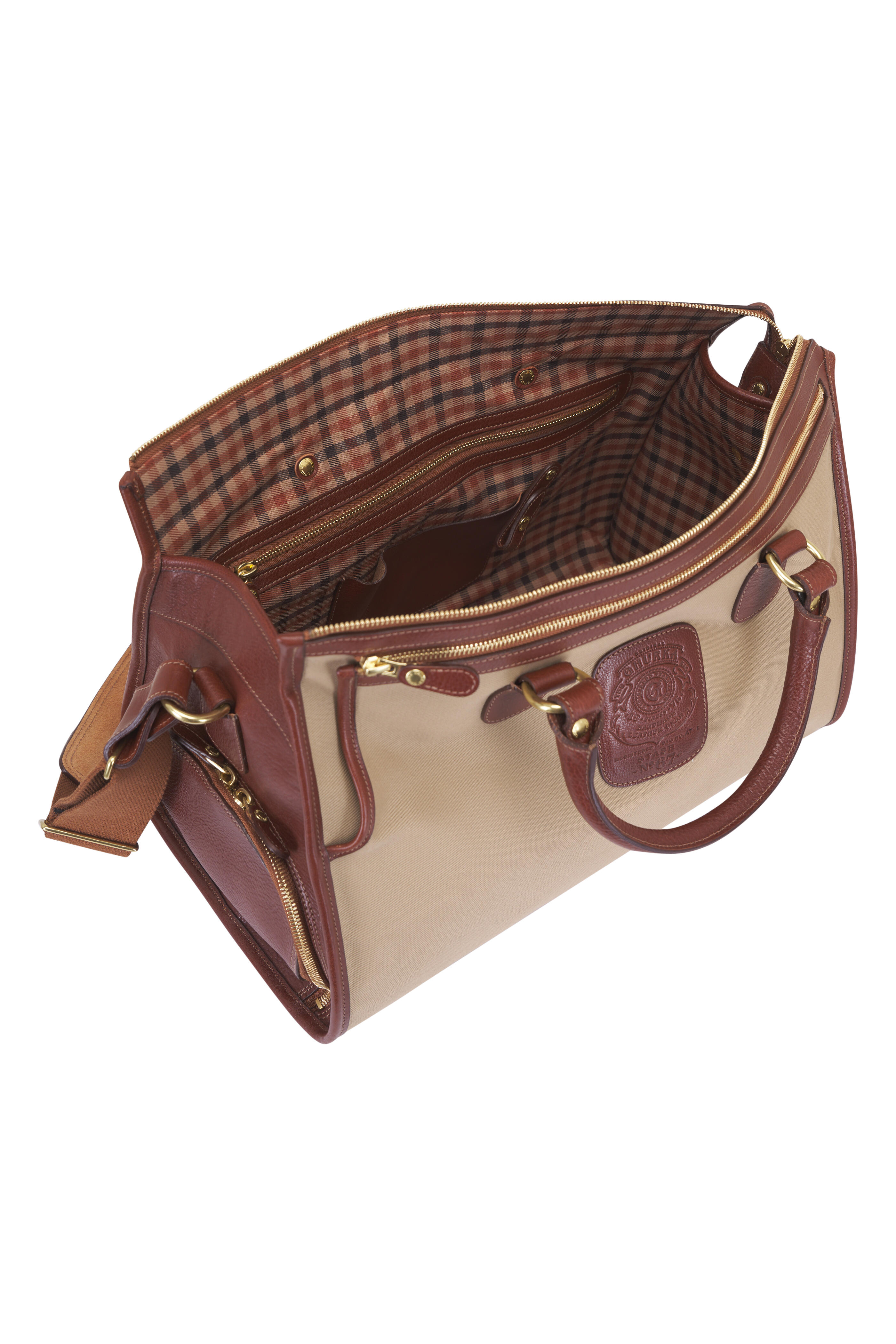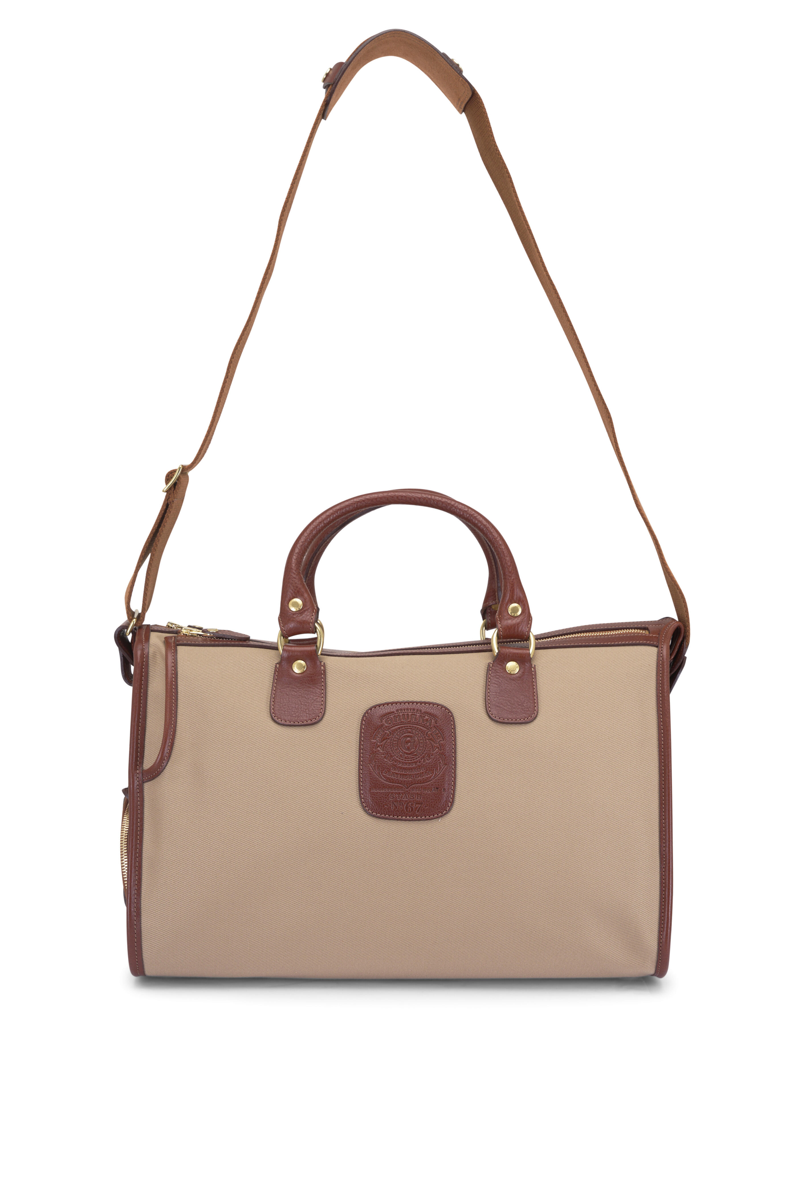 18 oz. water-repellent cotton twill. Italian vegetable-tanned, tumbled leather. Ghurka Check cotton twill lining. Brass hardware. Dual top handles. Detachable and adjustable shoulder strap. Interior zip pocket, 12" L. Exterior zip pocket, 15" L. Exterior side pocket with zip closure, 7.5" L x 5" H x 1.6" D. Dedicated front racquet sleeve. Handcrafted in the USA. 17”L x 11”H x 9.5”W (4.2 lb). Adjustable and removable strap drop: 32"–53". Top handle drop: 6". Approved cabin size.