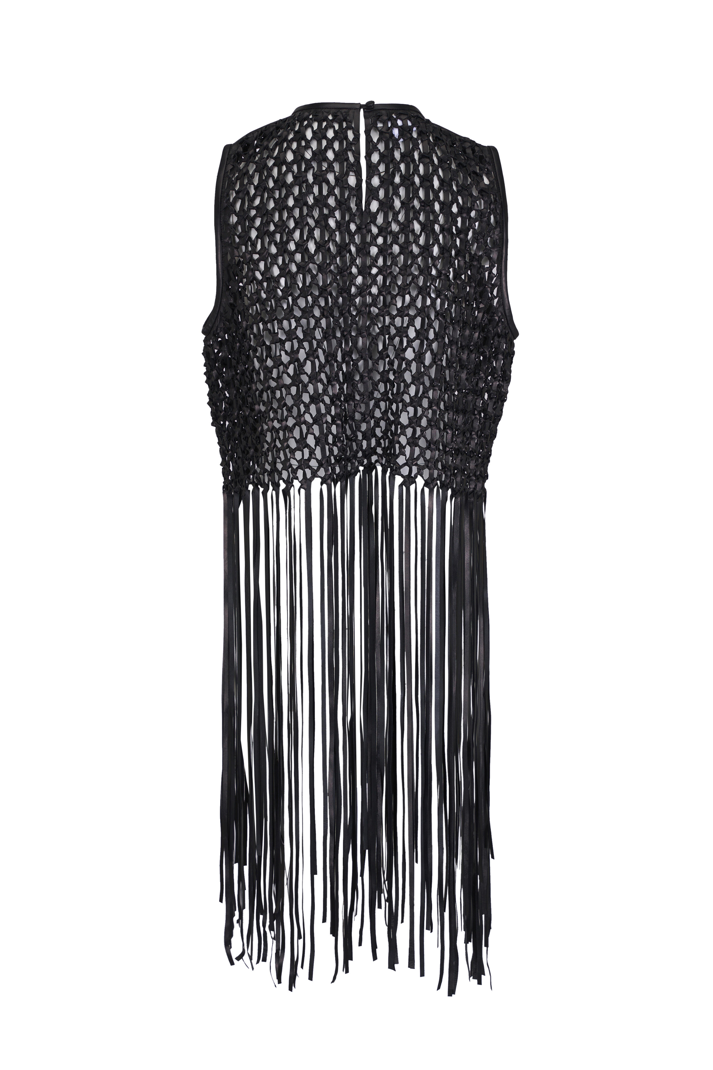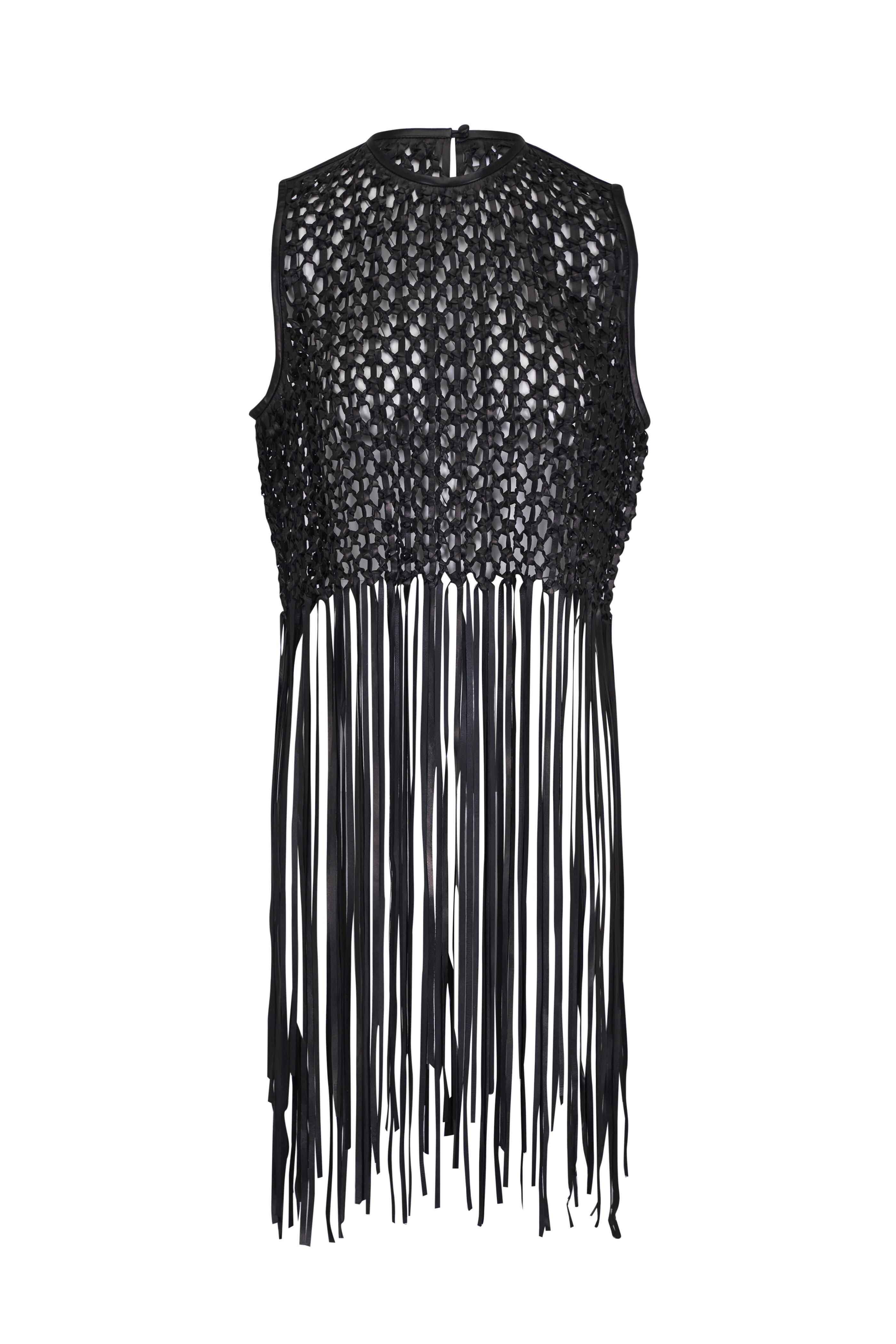 Specialist clean. Crew neckline. Keyhole button back. Openwork design. Imported. Approximately 43" shoulder to longest fringe (measurements taken from size S). 100% lambskin leather.