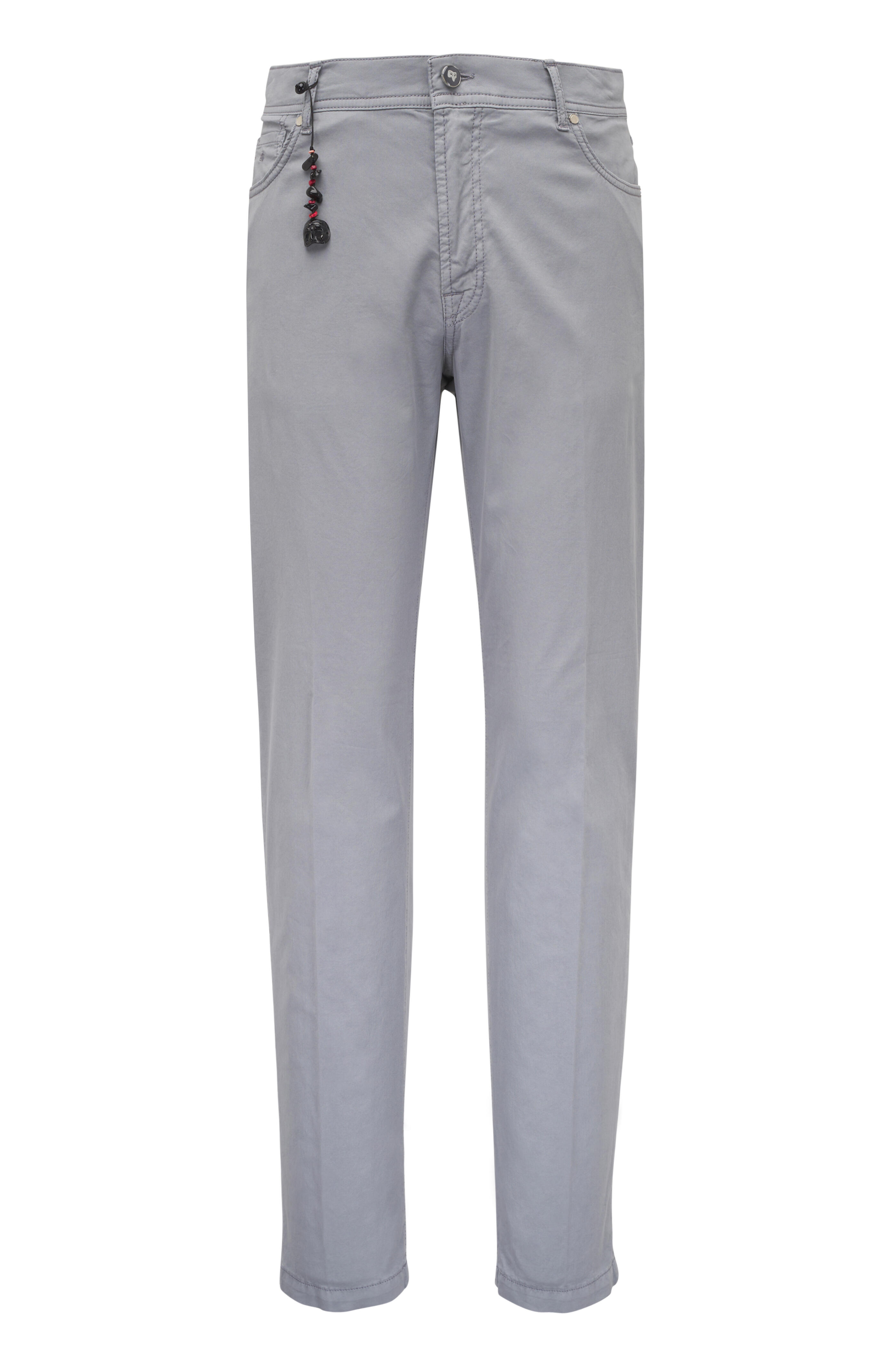 Zip fly with button closure. Banded waist; belt loops. Five pocket styling. Straight hem. Made in Italy. Inseam 34" (size 35 R). 85% Cotton, 11% silk, 4% elastane. Dry clean.