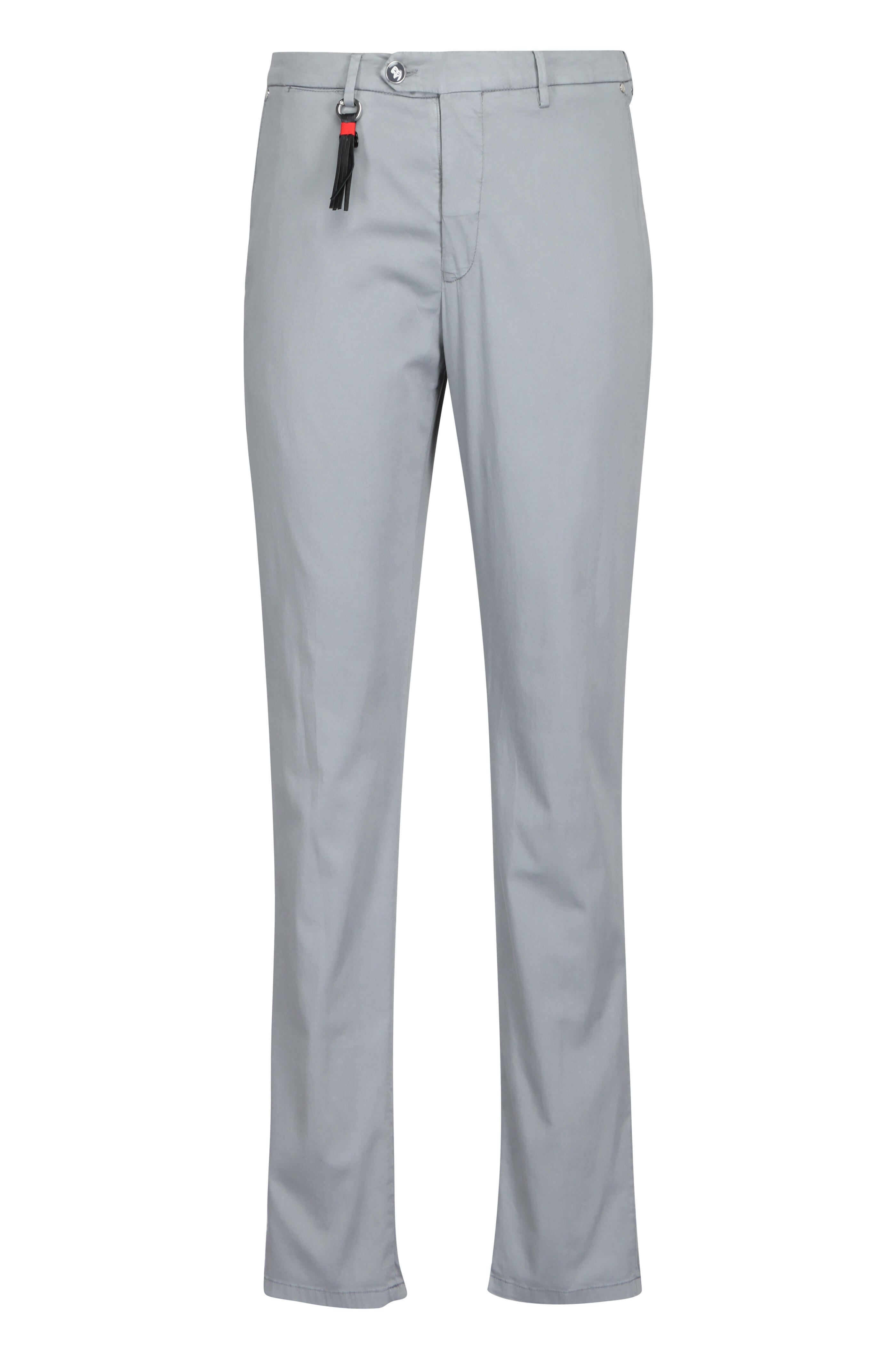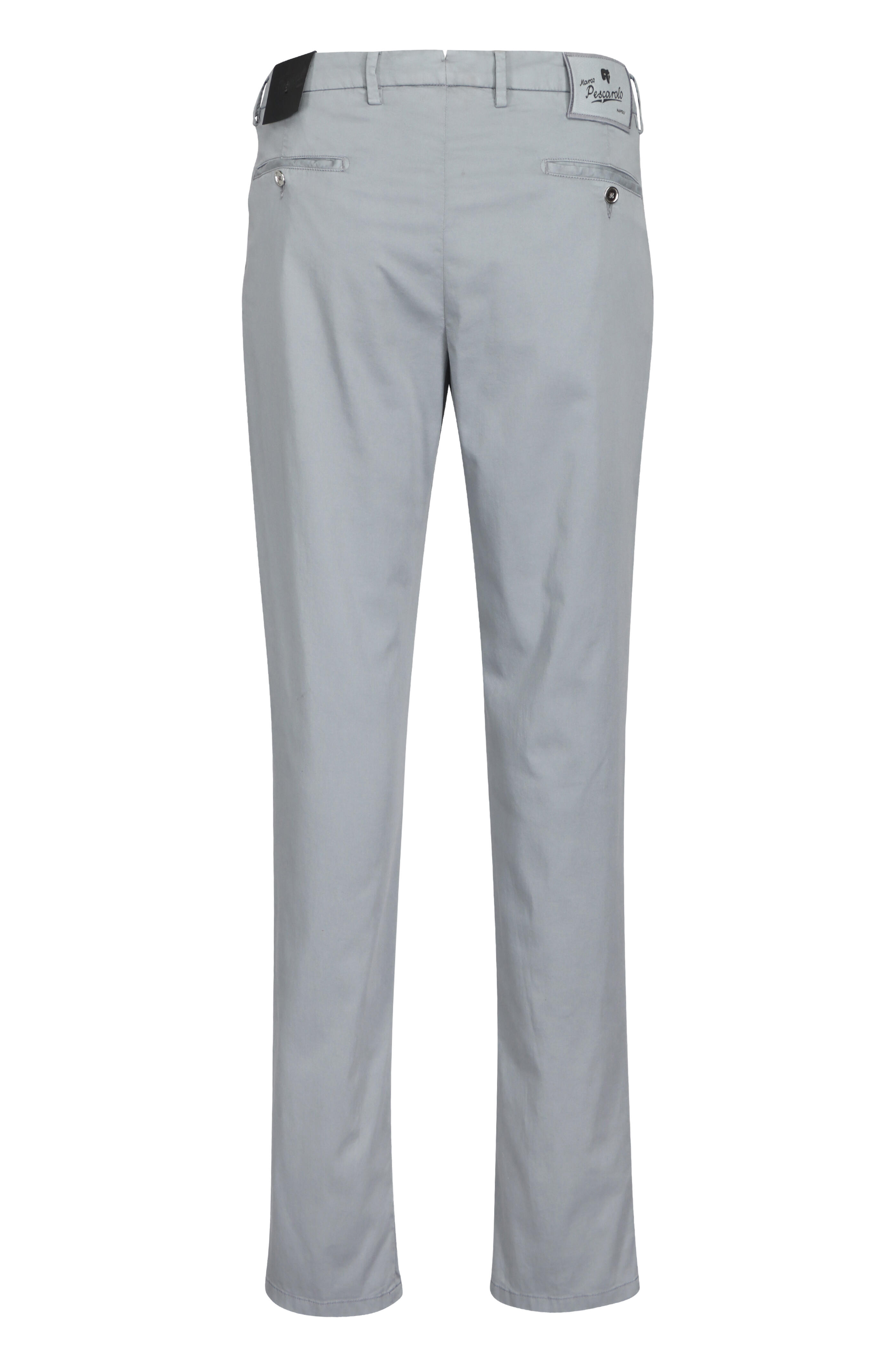 Zip fly; two button closure. Banded waist; belt loops. Side slash pockets; back welt pockets. Made in Italy. Inseam 35". 85% cotton, 11% silk, 4% elastane. Dry clean.