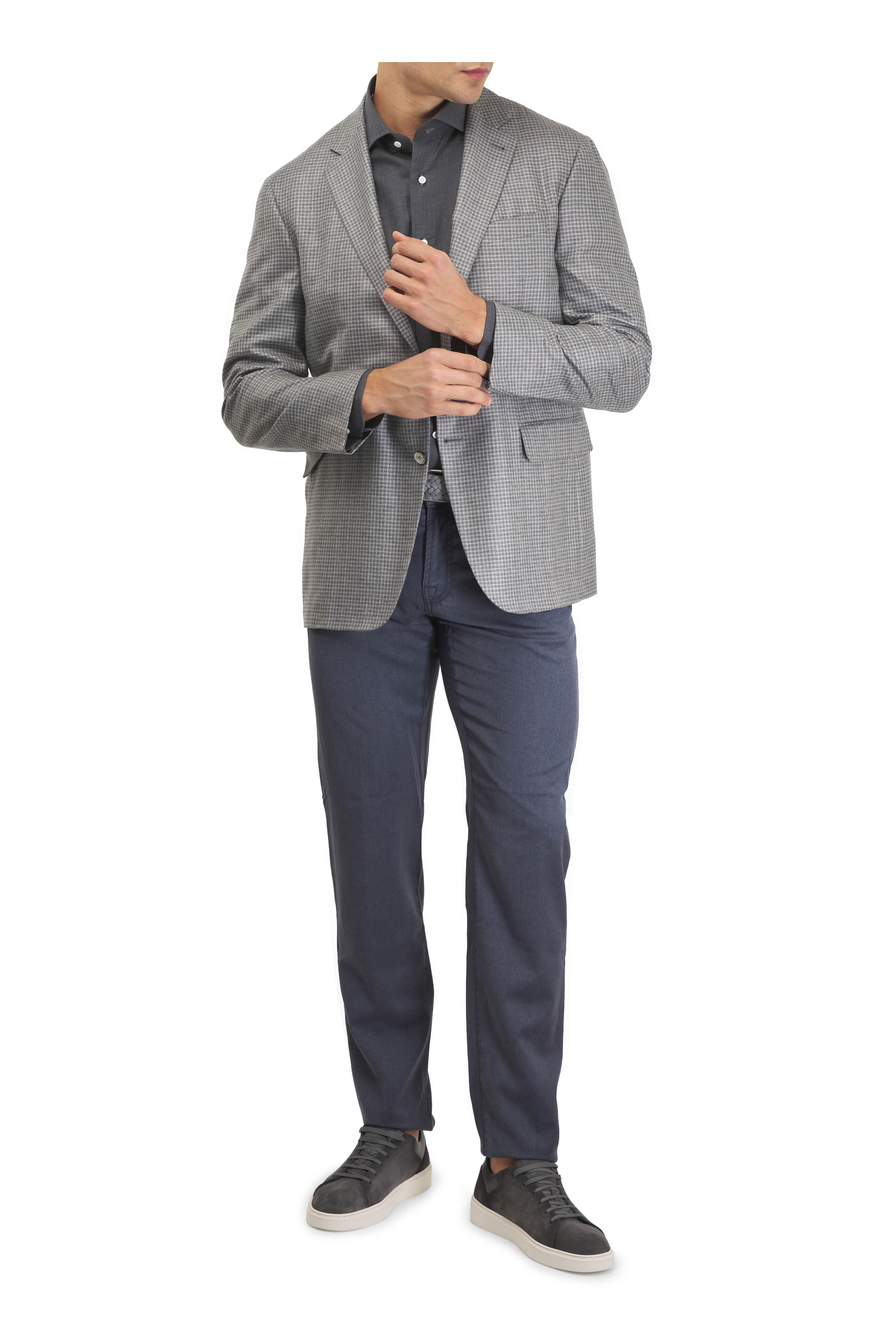Zip fly; button closure. Five pocket styling. Straight hem. Made in Italy. Inseam 34" (size 36 R). 100% Virgin wool. Dry clean.