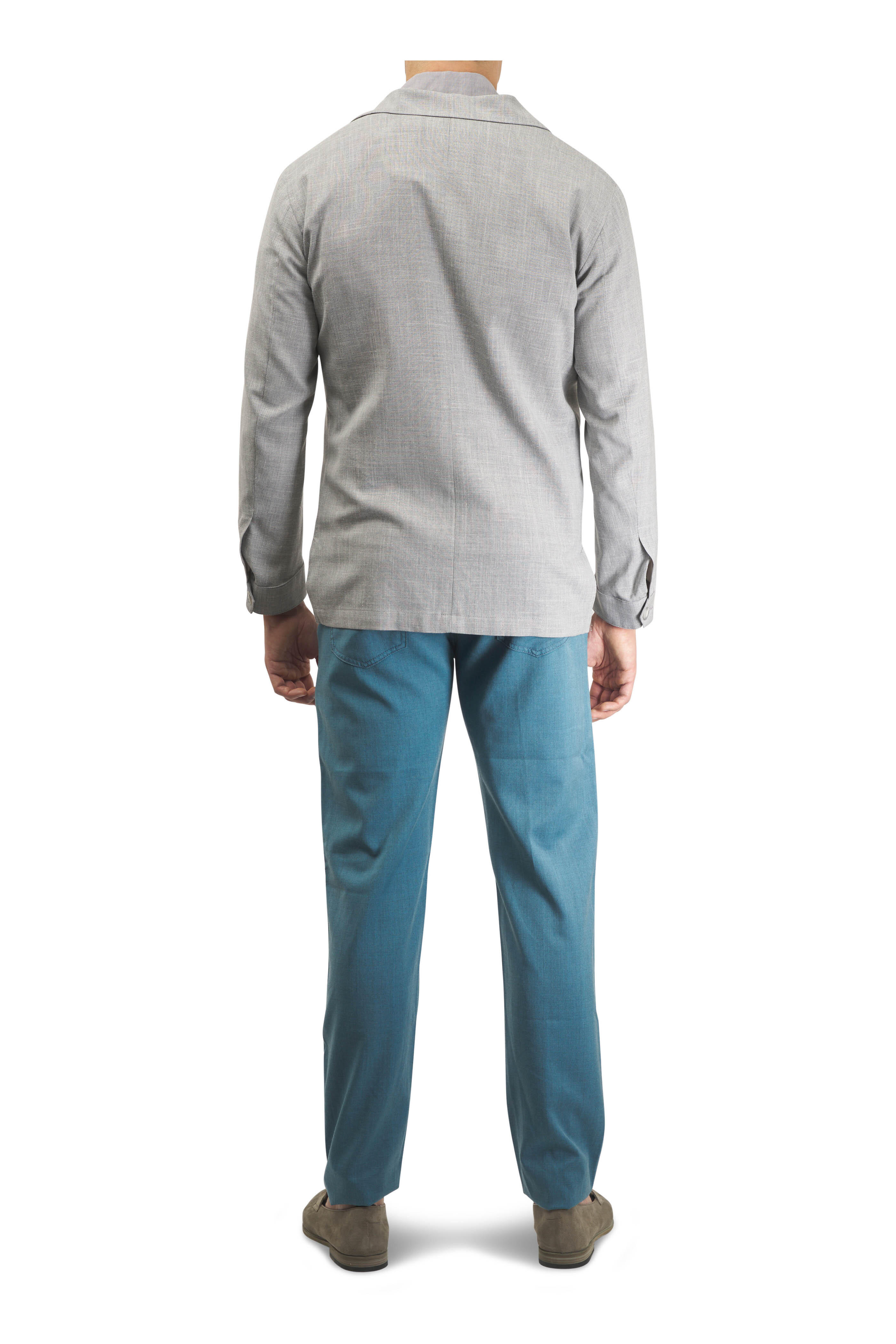 Zip fly; button closure. Five pocket styling. Straight hem. Made in Italy. Inseam 34" (size 36 R). 100% Virgin wool. Dry clean.