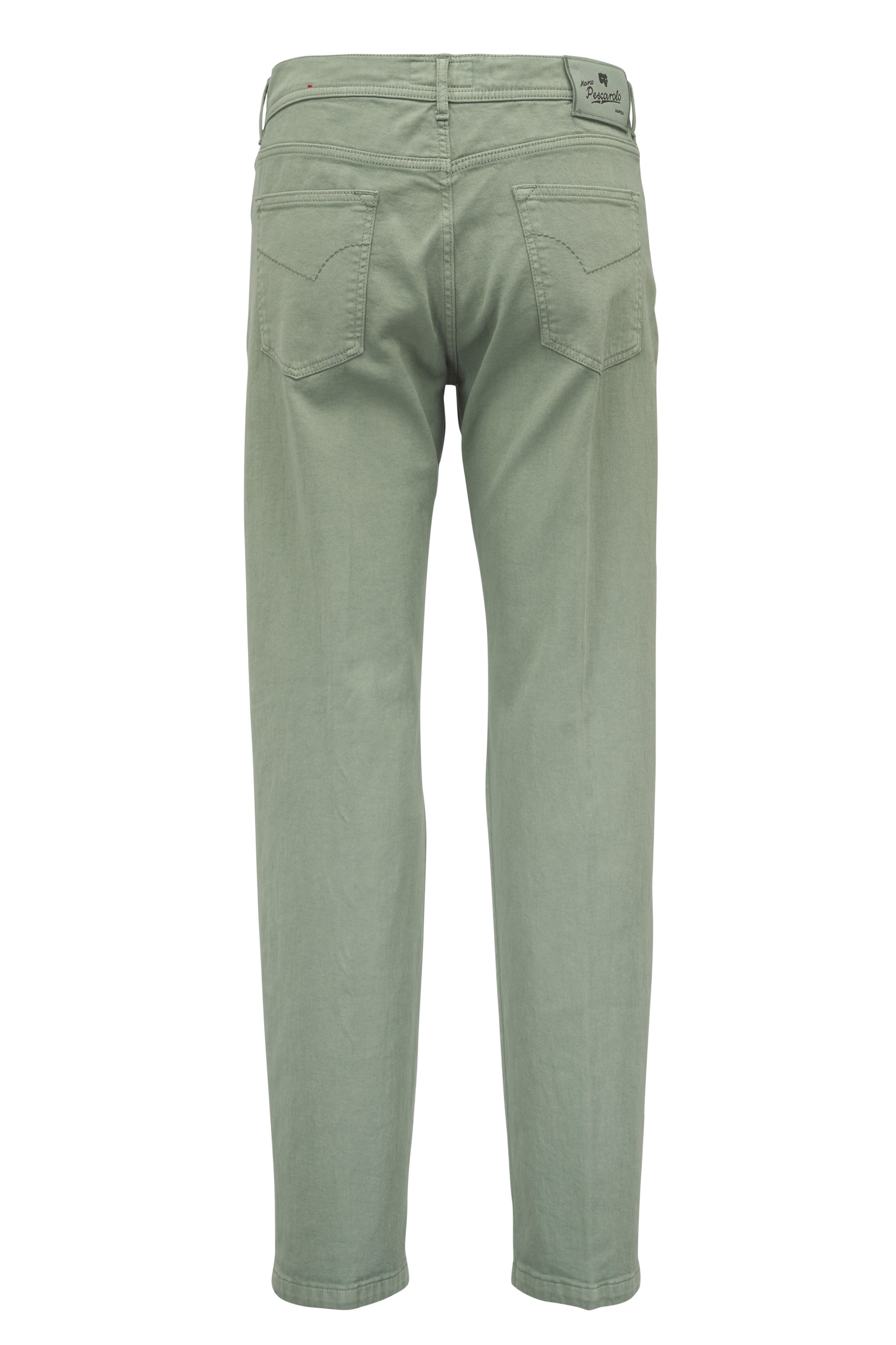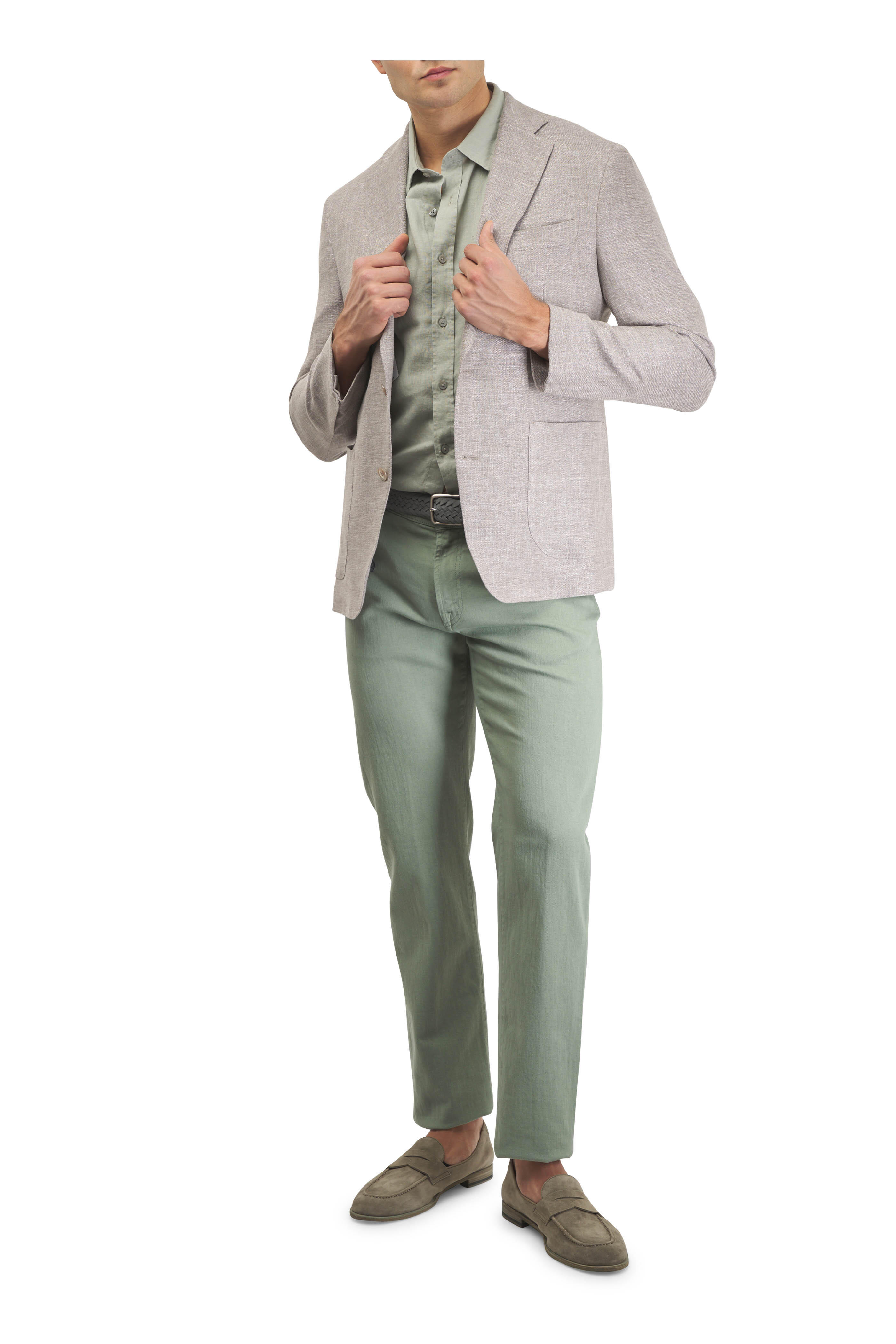 Zip fly with button closure. Banded waistband; belt loops. Five-pocket styling. Straight hem. Made in Italy. 89% cotton, 9% linen, 2% elastane. Dry clean.