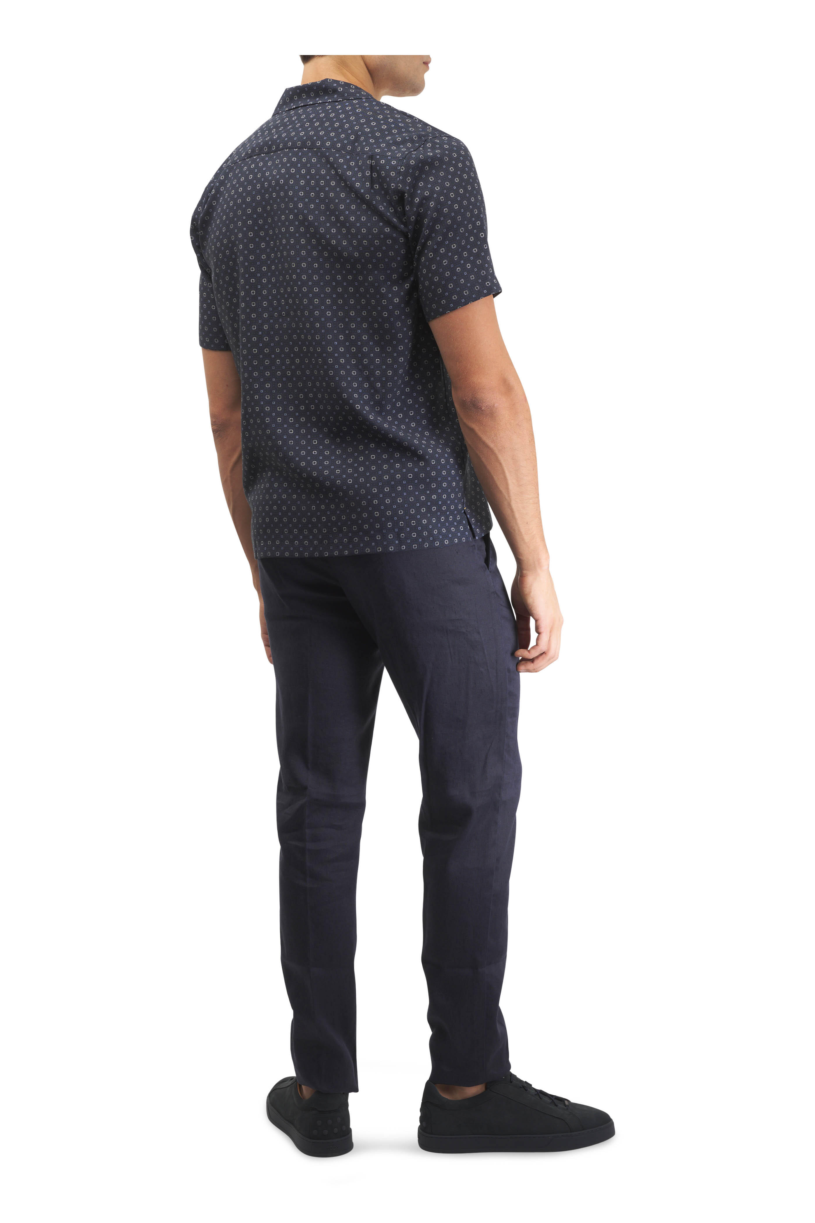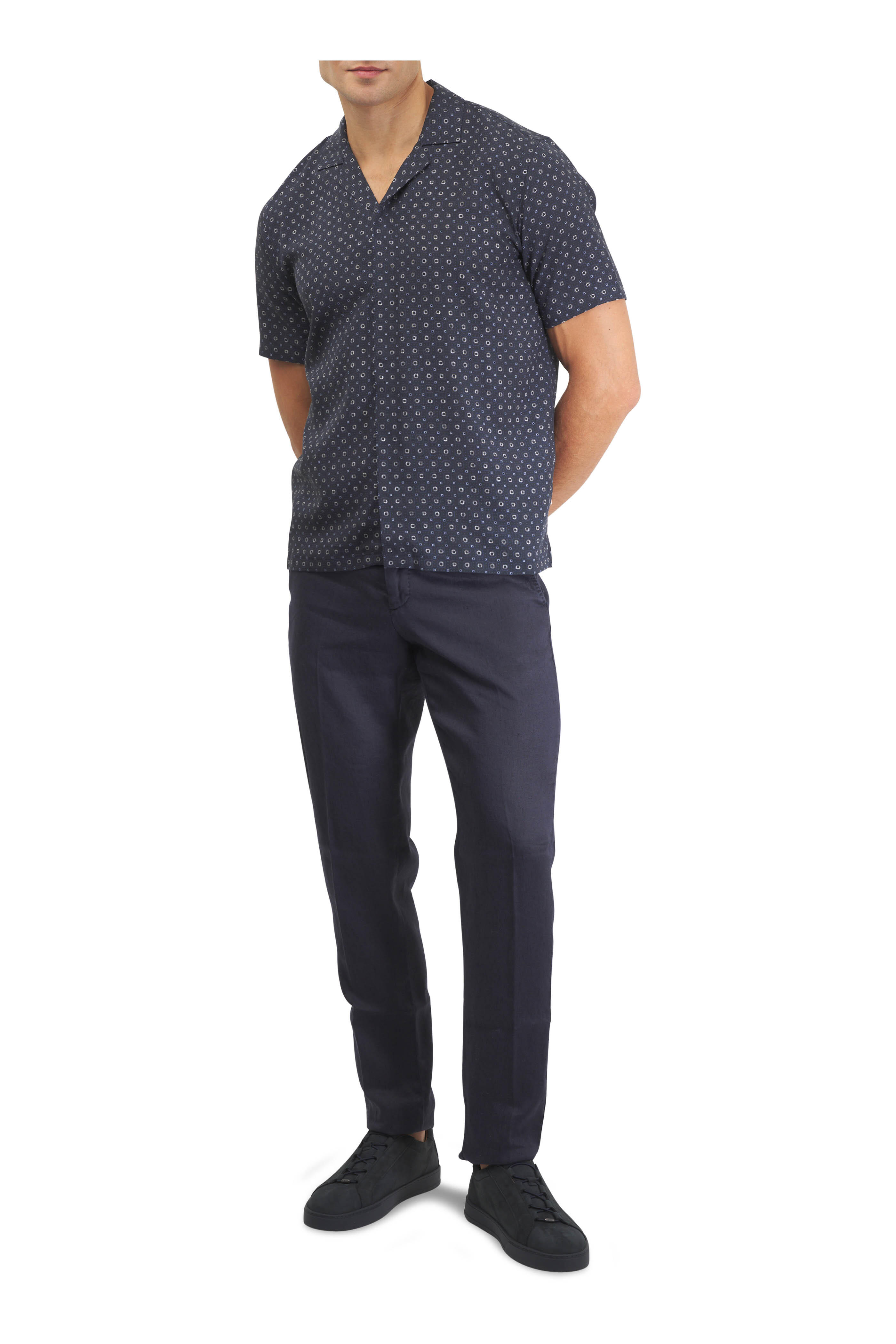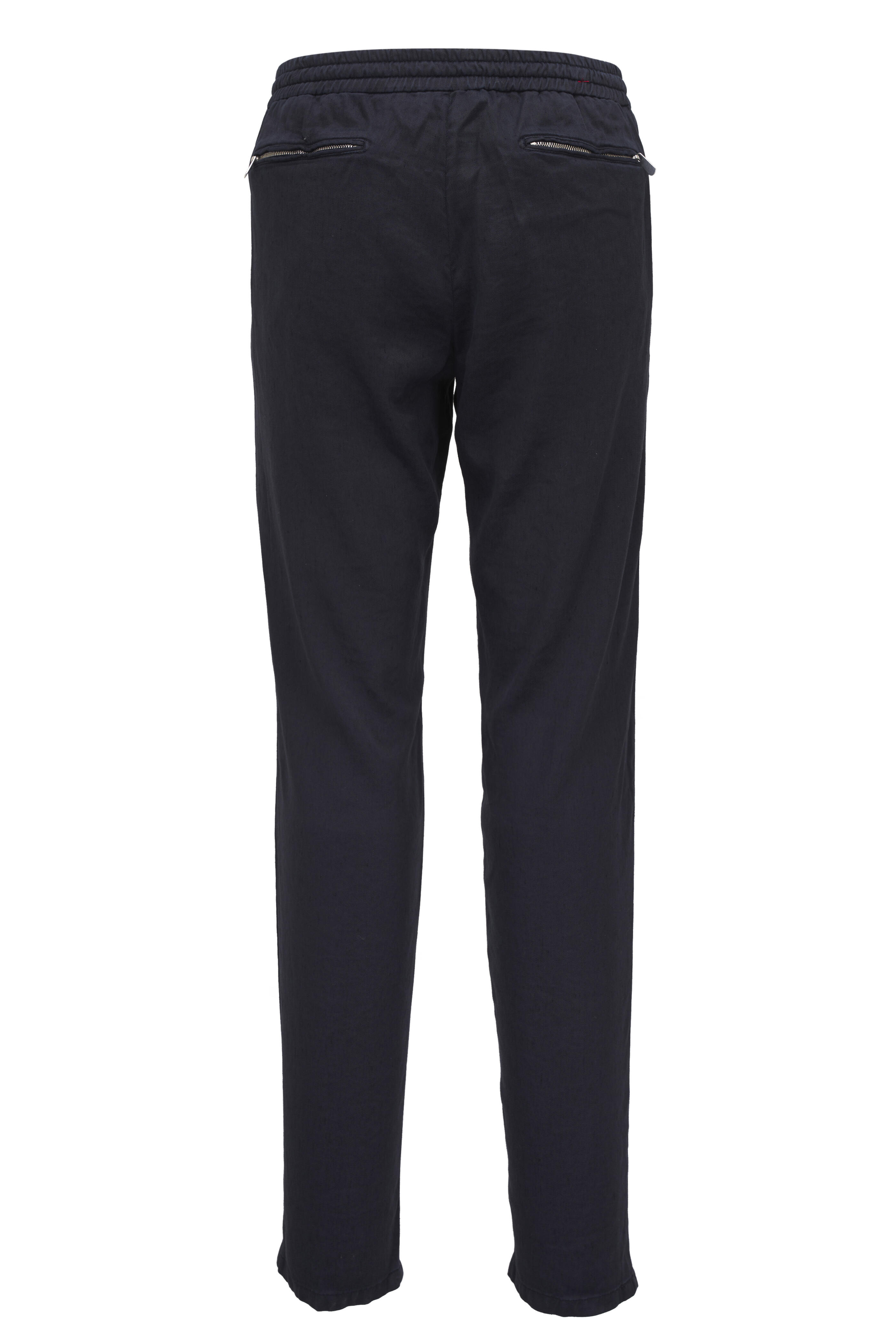 Zip fly; button closure; drawstring waist. Front slip pockets; back zip pockets. Straight hem. Made in Italy. 34" Inseam (size 36 R). 57% linen, 41% lyocell, 2% elastane. Dry clean.