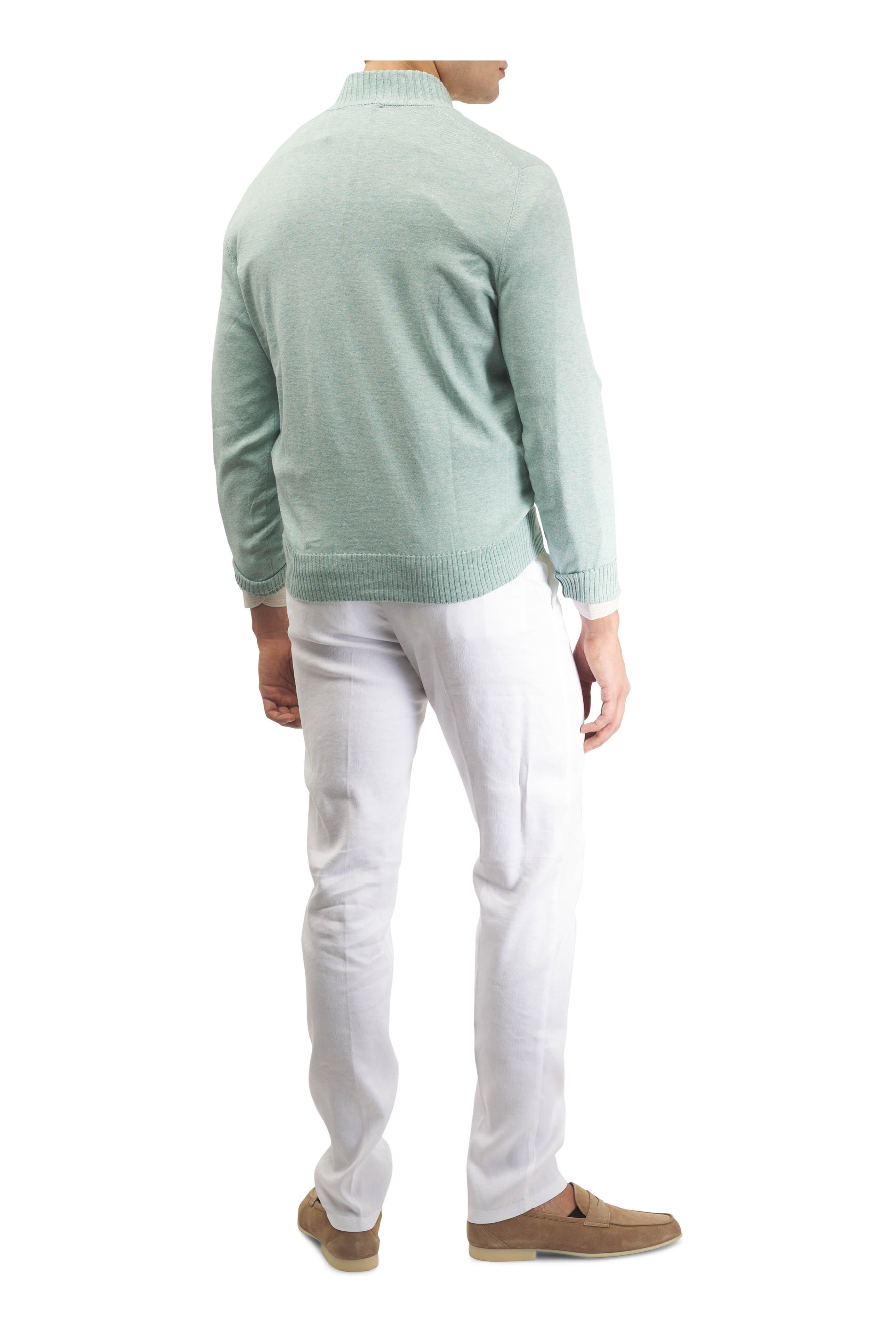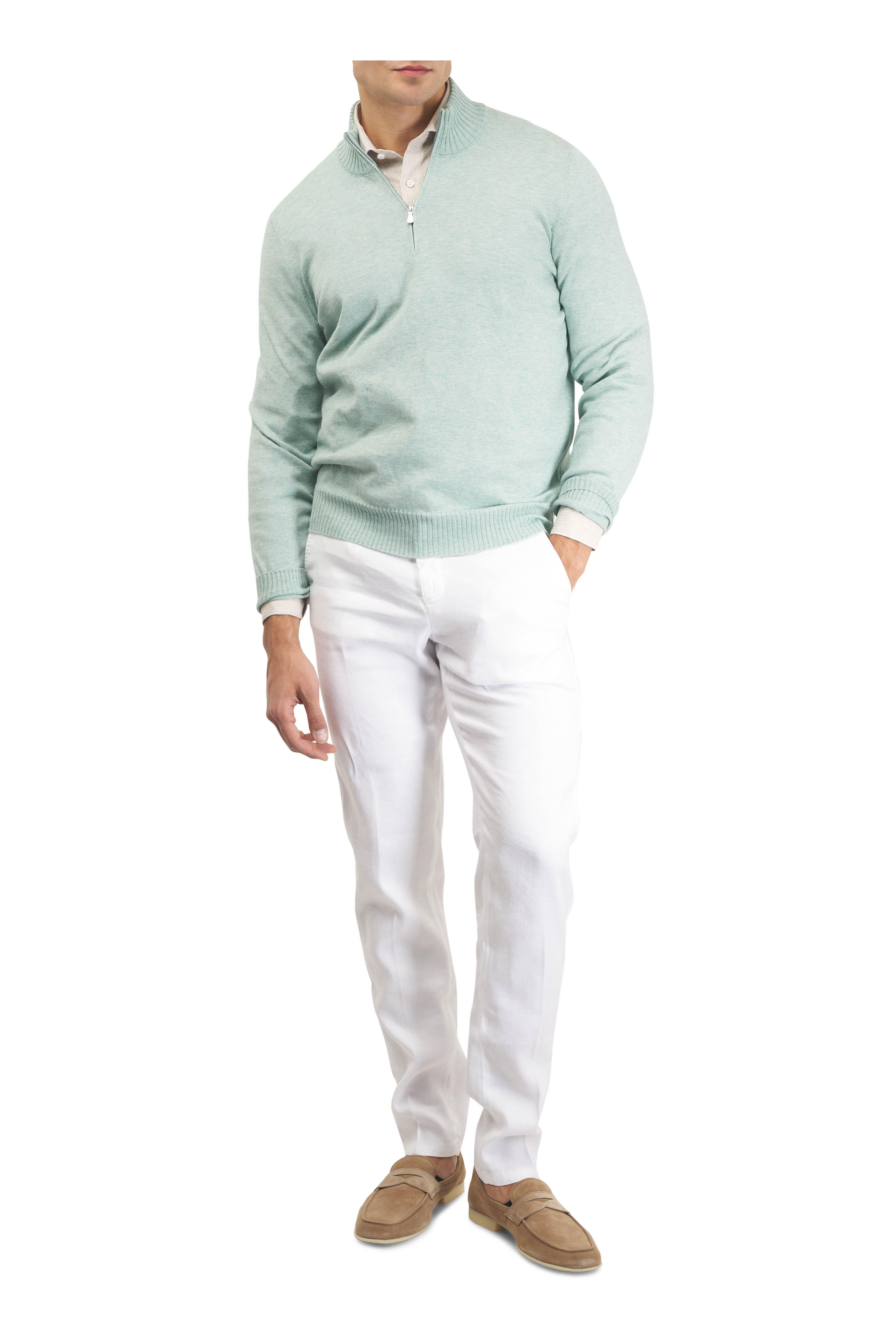 Zip fly; button closure; drawstring waist. Front slip pockets; back zip pockets. Straight hem. Made in Italy. 34" Inseam (size 36 R). 57% Linen, 41% lyocell, 2% elastane. Dry clean.