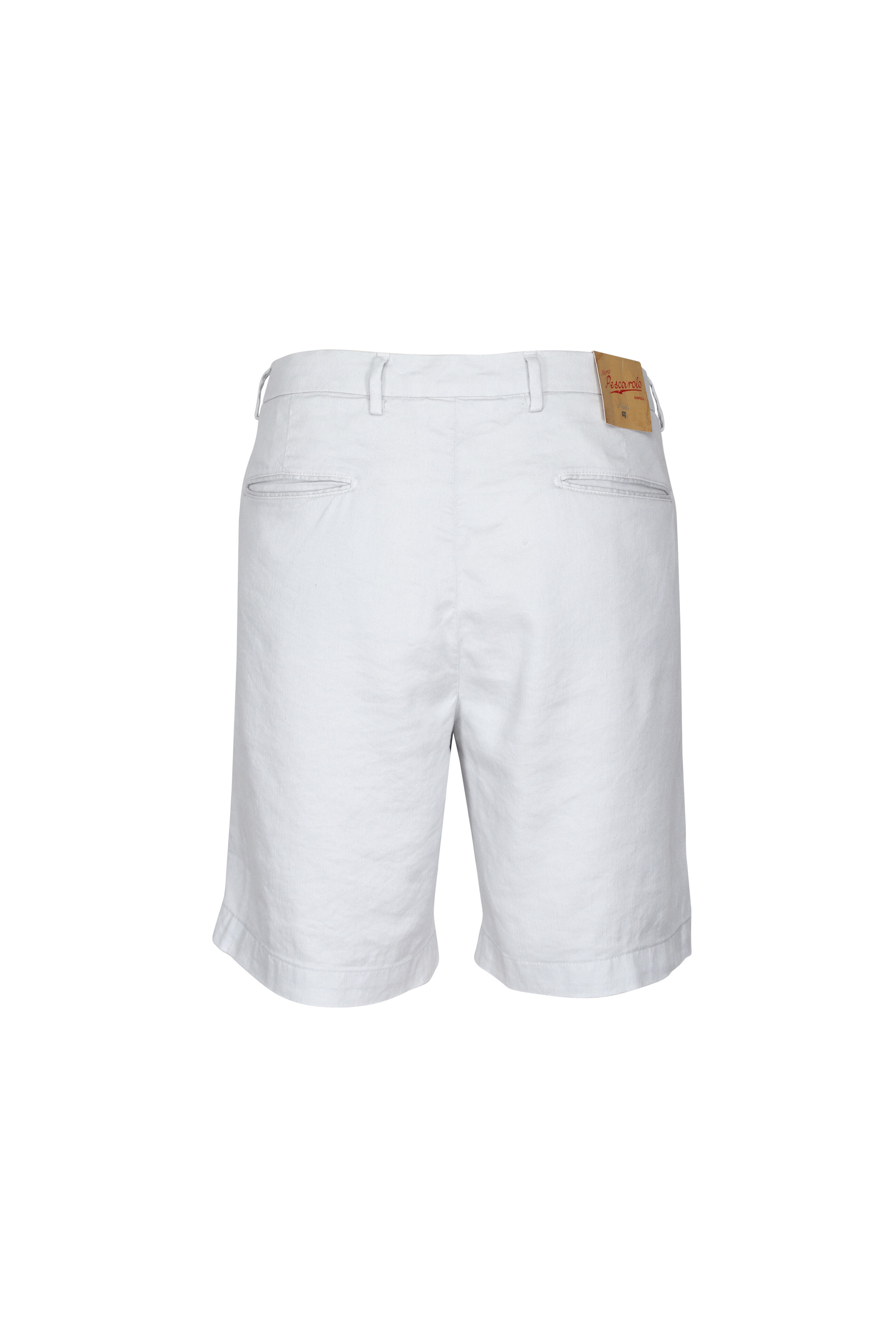 Banded waist; belt loops. Zip fly; two button closure. Side slip pockets. Back welt pockets. Imported. 57% linen, 41% lyocell, 2% elastane. Dry clean.