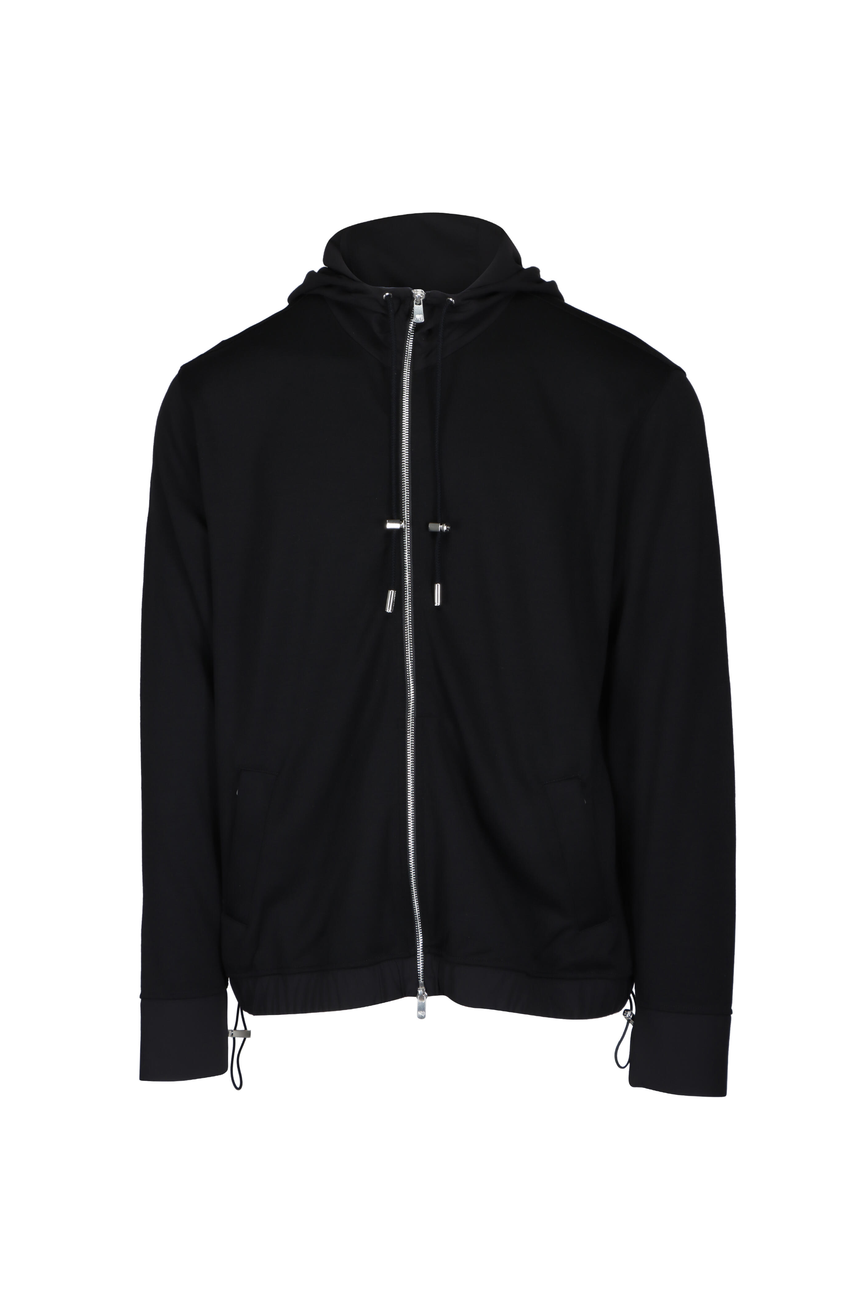 Stand collar. Adjustable drawstrings. Two-way front zip. Side slip pockets. Elasticized hem and cuffs. Removable hood. Made in Italy. 100% Virgin wool. Dry clean.