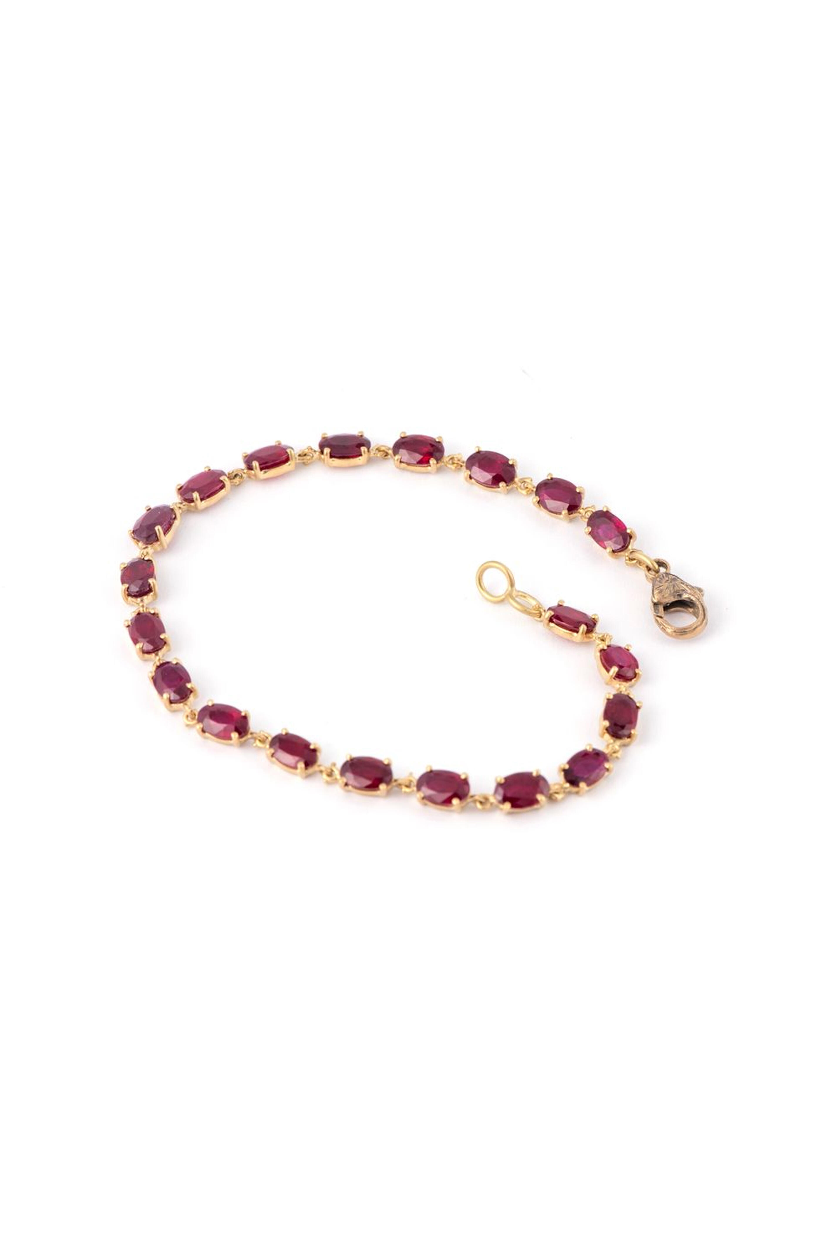 18k gold. Ruby 11.00 total carat weight. Oval cut. Tennis style bracelet. Prong setting. Lobster claw clasps. Made in the USA. Length: 7”.