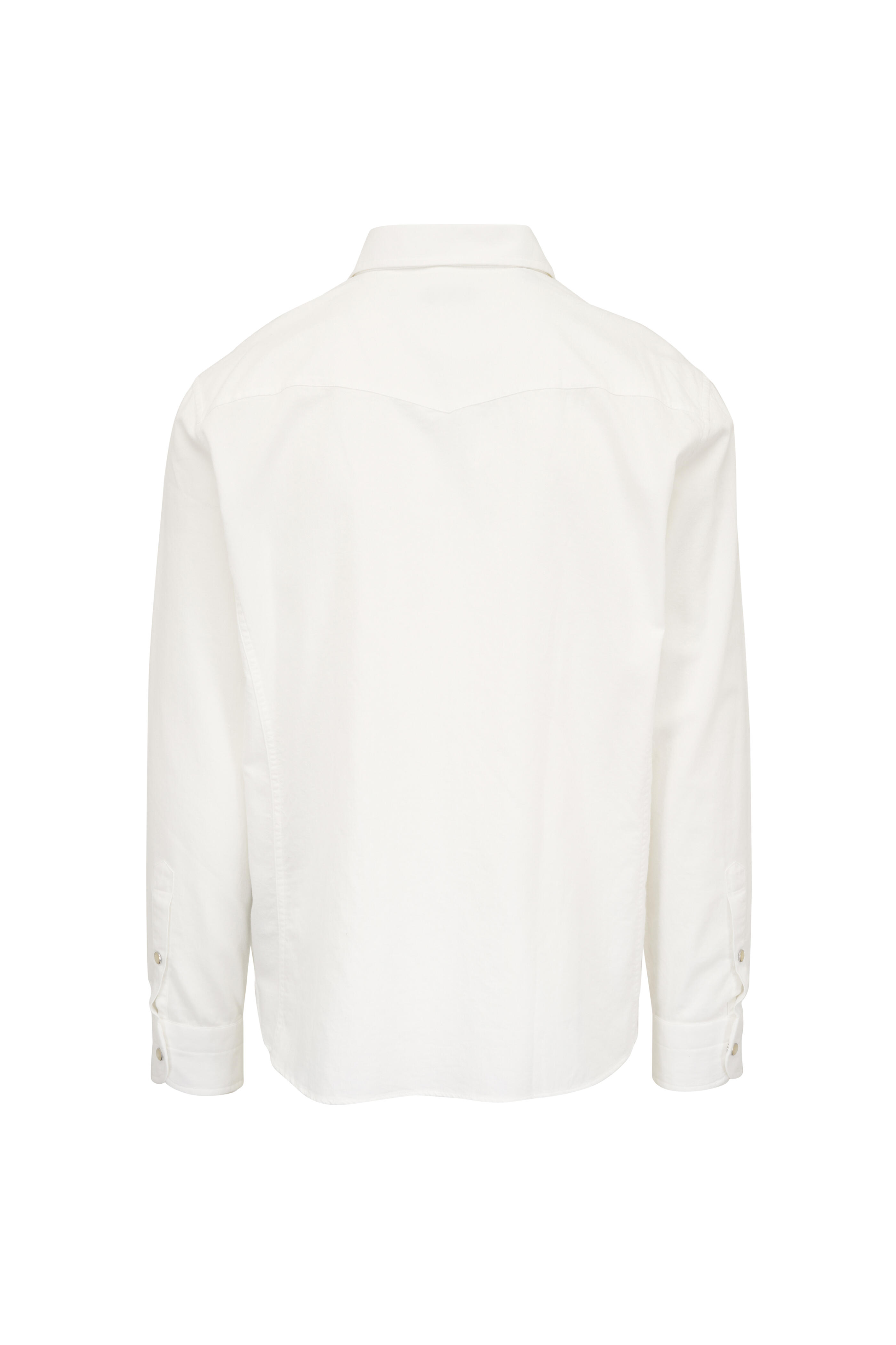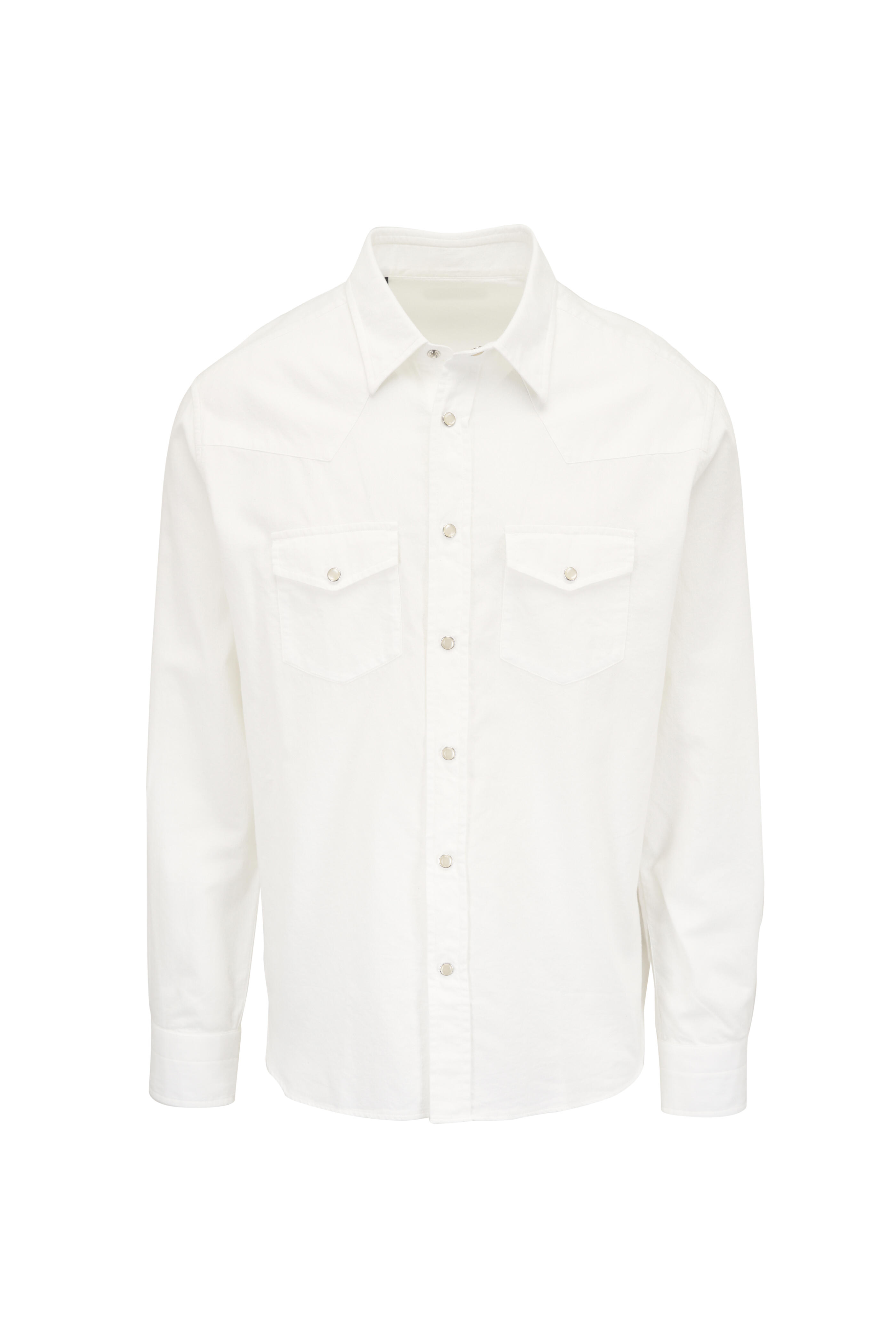 Spread collar. Front snap placket. Single snap cuffs. Chest snap flap pockets. Made in Italy. Slim fit. 100% cotton. Dry clean.