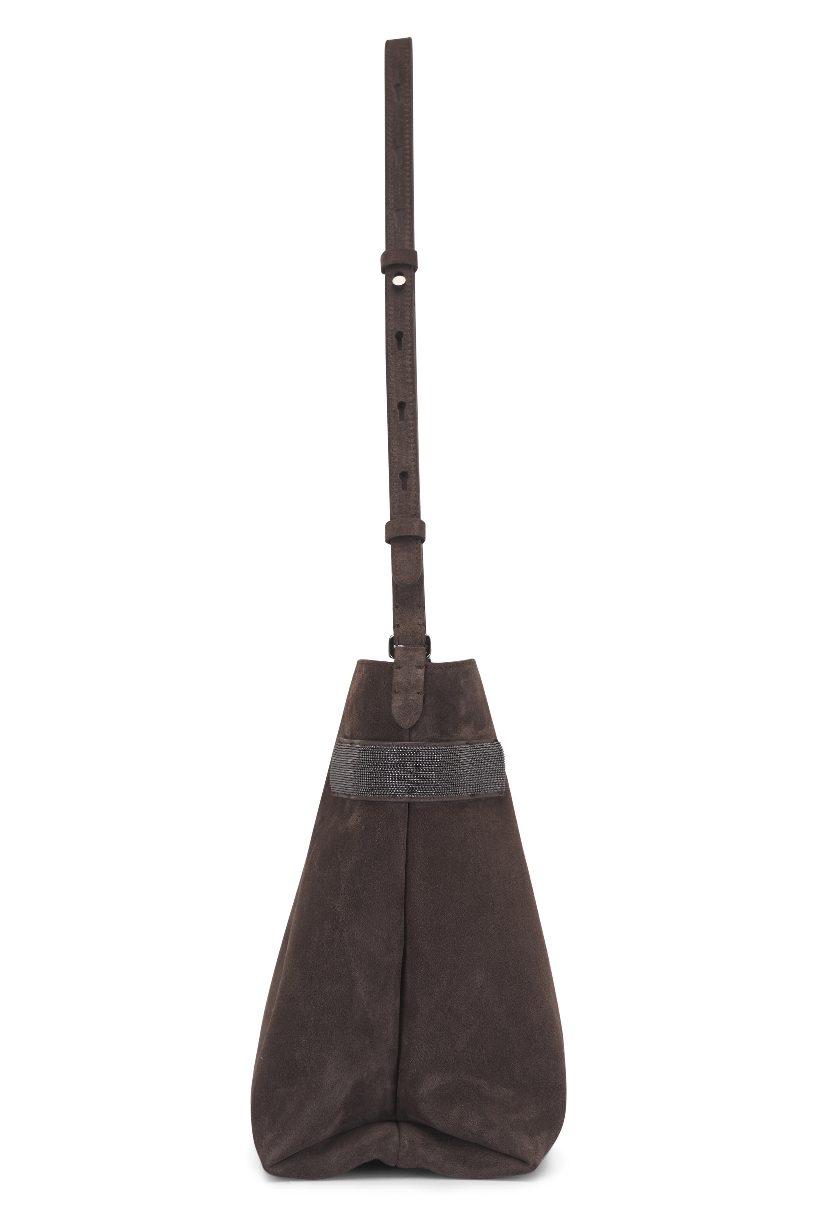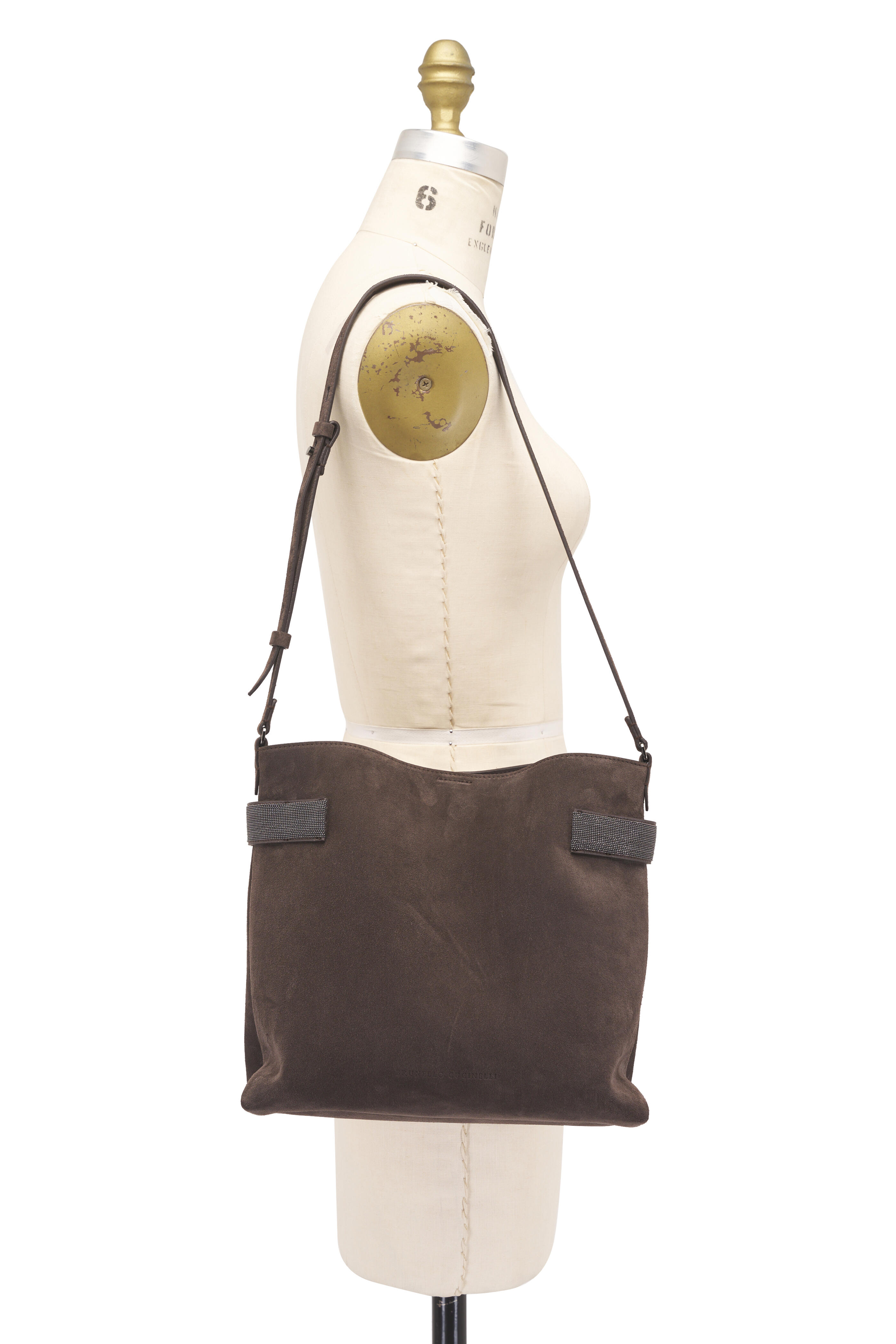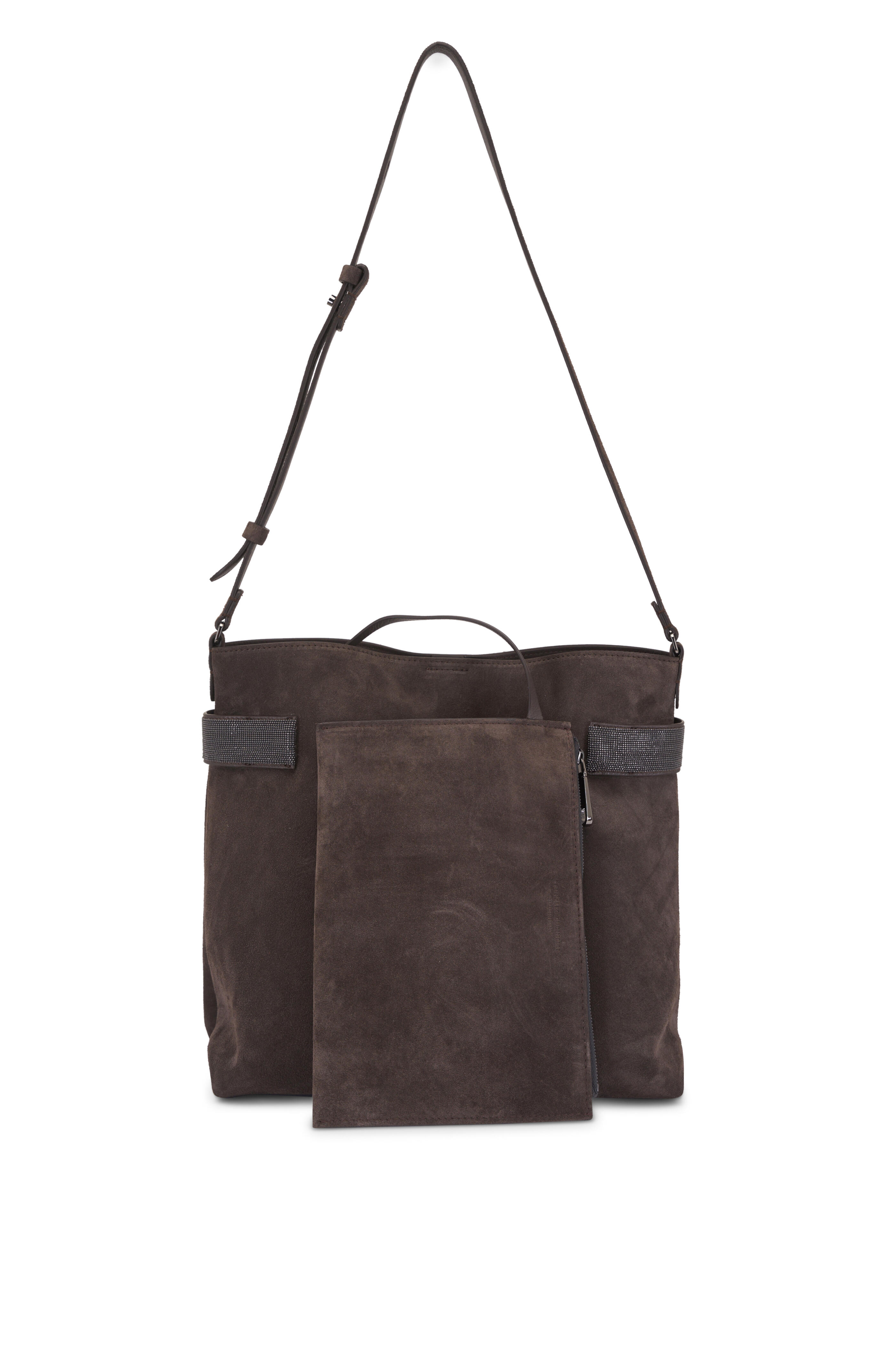 Suede. Adjustable and detachable shoulder strap. Magnetic snap closure. Internal pocket with zip closure. Detachable internal pochette with zipper. Leather lining. Monili side band detailing. Made in Italy. Length: 7.5". Height: 6.7". Width: 3.5".