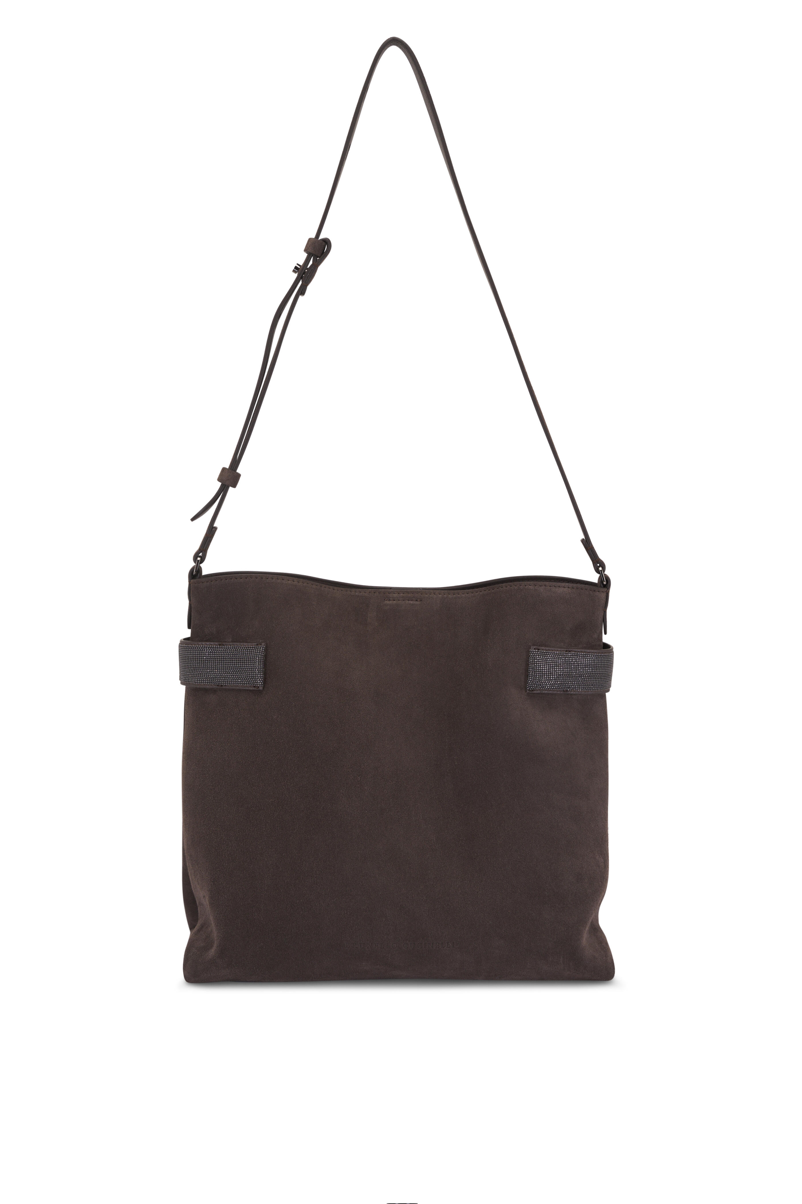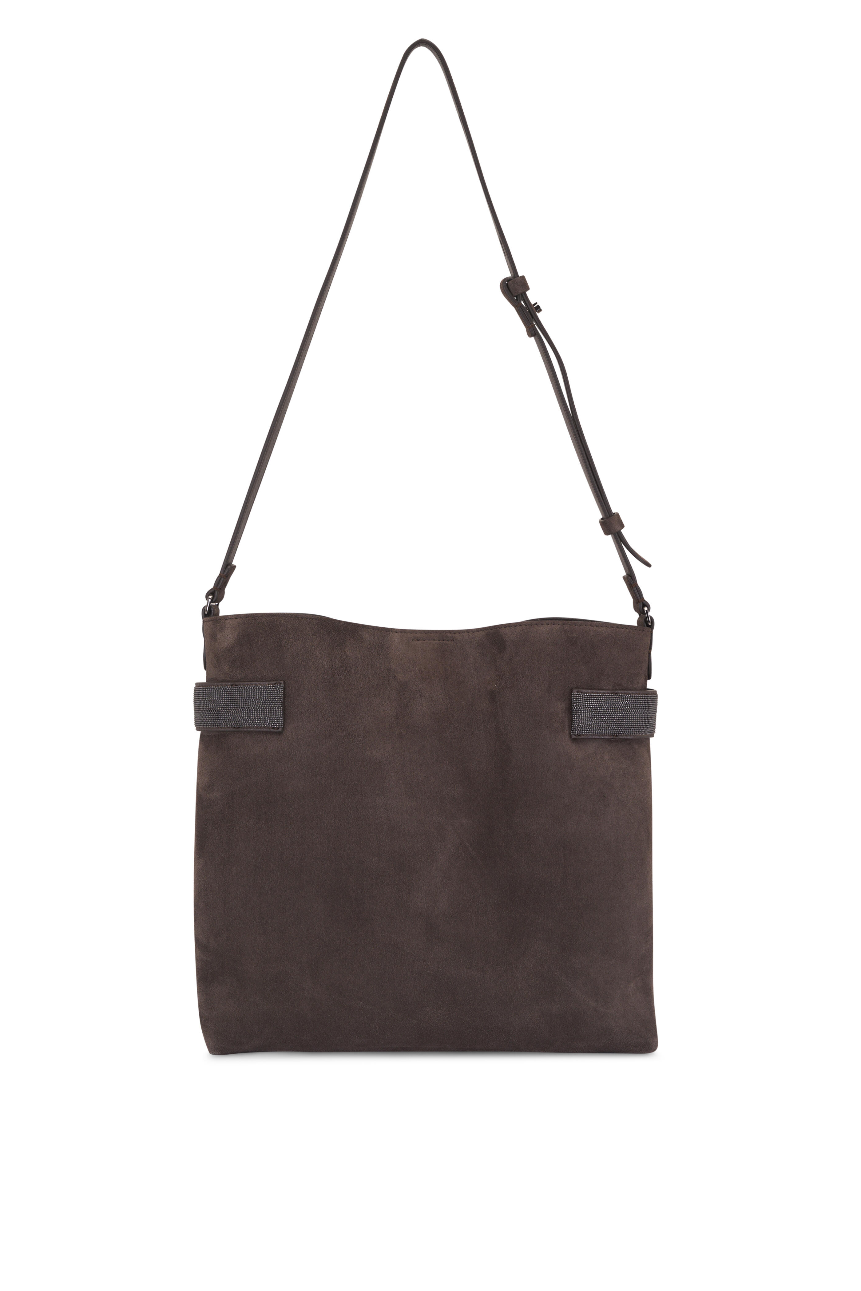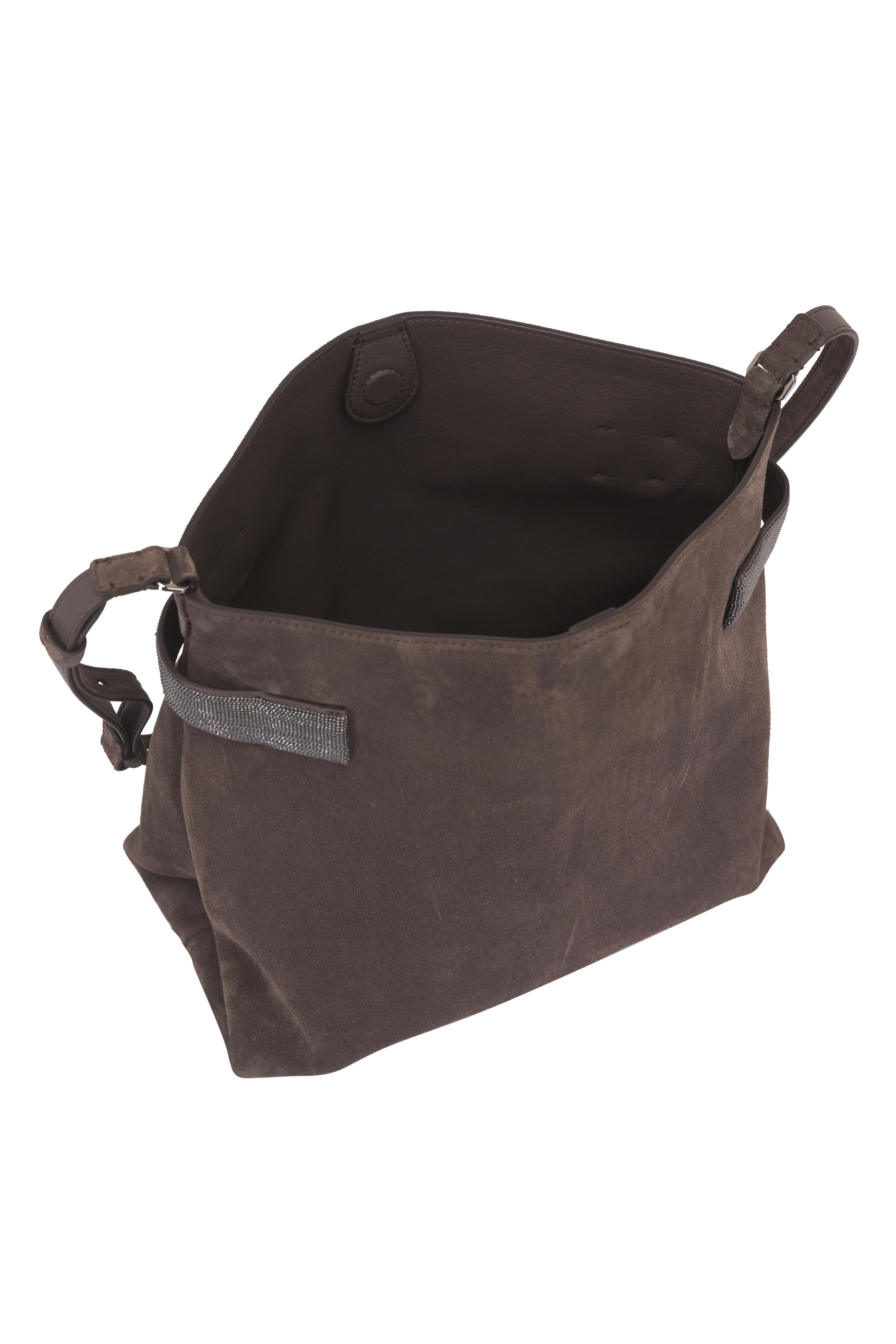 Suede. Adjustable and detachable shoulder strap. Magnetic snap closure. Internal pocket with zip closure. Detachable internal pochette with zipper. Leather lining. Monili side band detailing. Made in Italy. Length: 7.5". Height: 6.7". Width: 3.5".