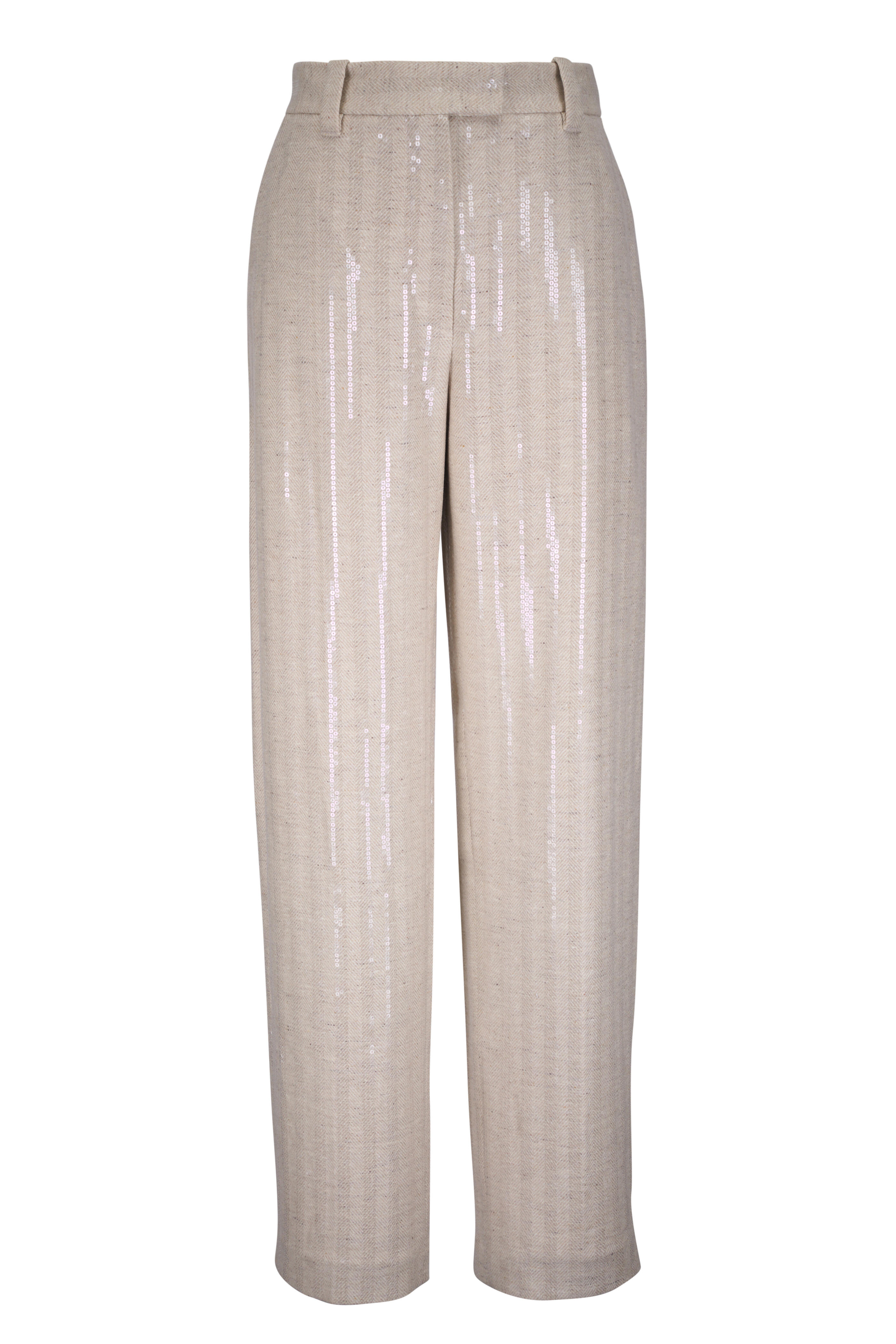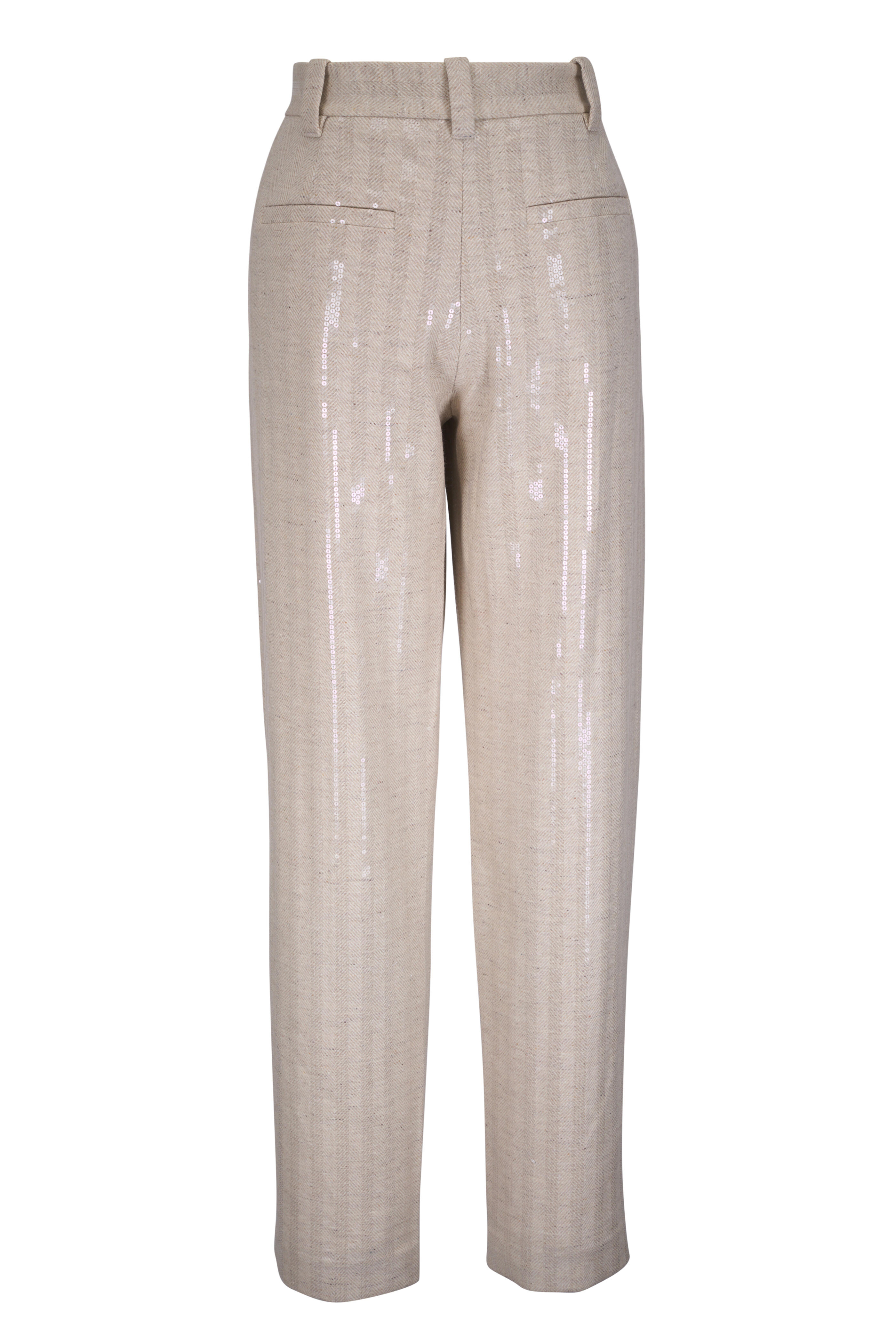 Zip fly; extended tab closure. Banded waist; belt loops. Side slip pockets; back welt pockets. Paillette detailing throughout. Made in Italy. 95% wool, 5% cashmere; lined. Dry clean.
