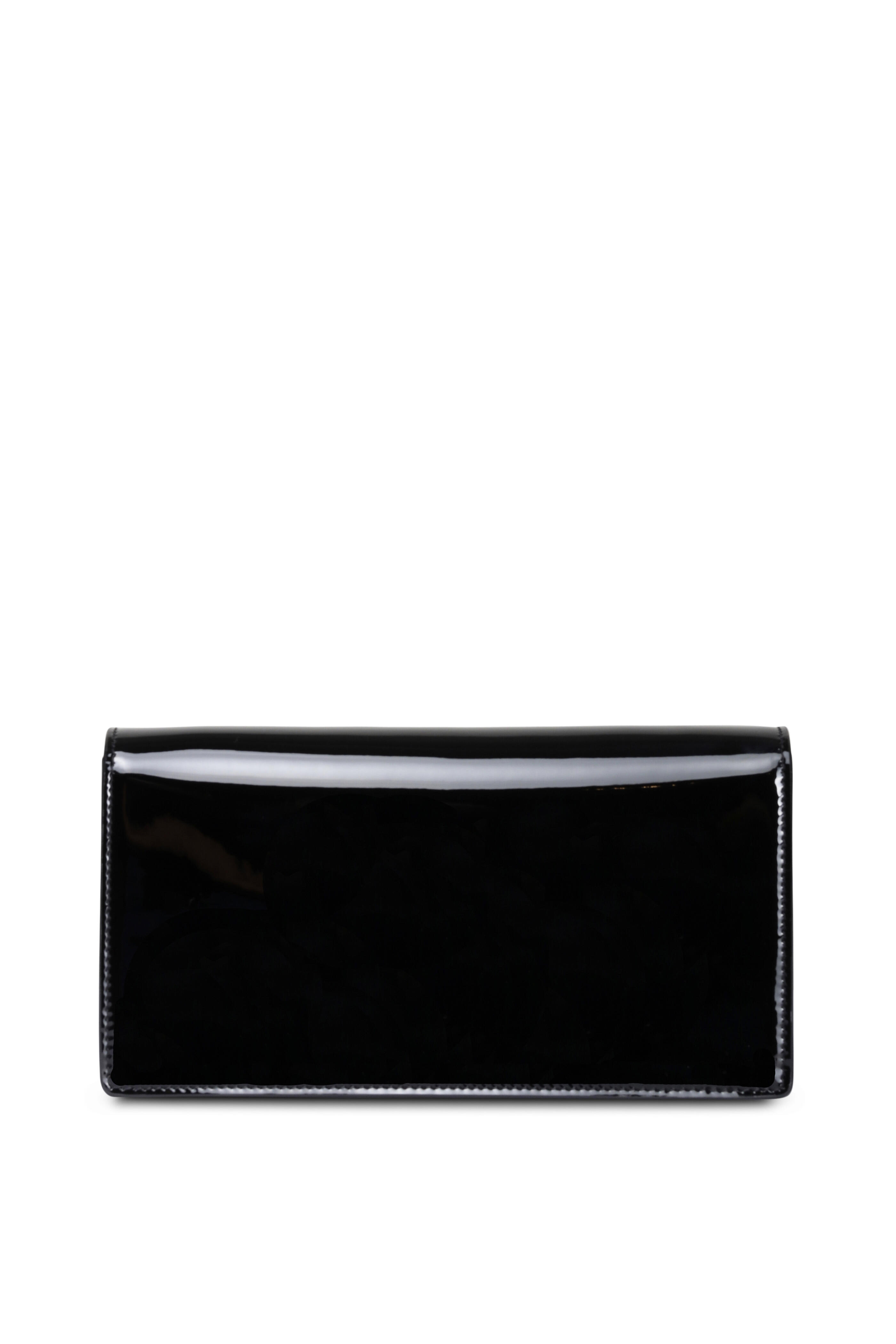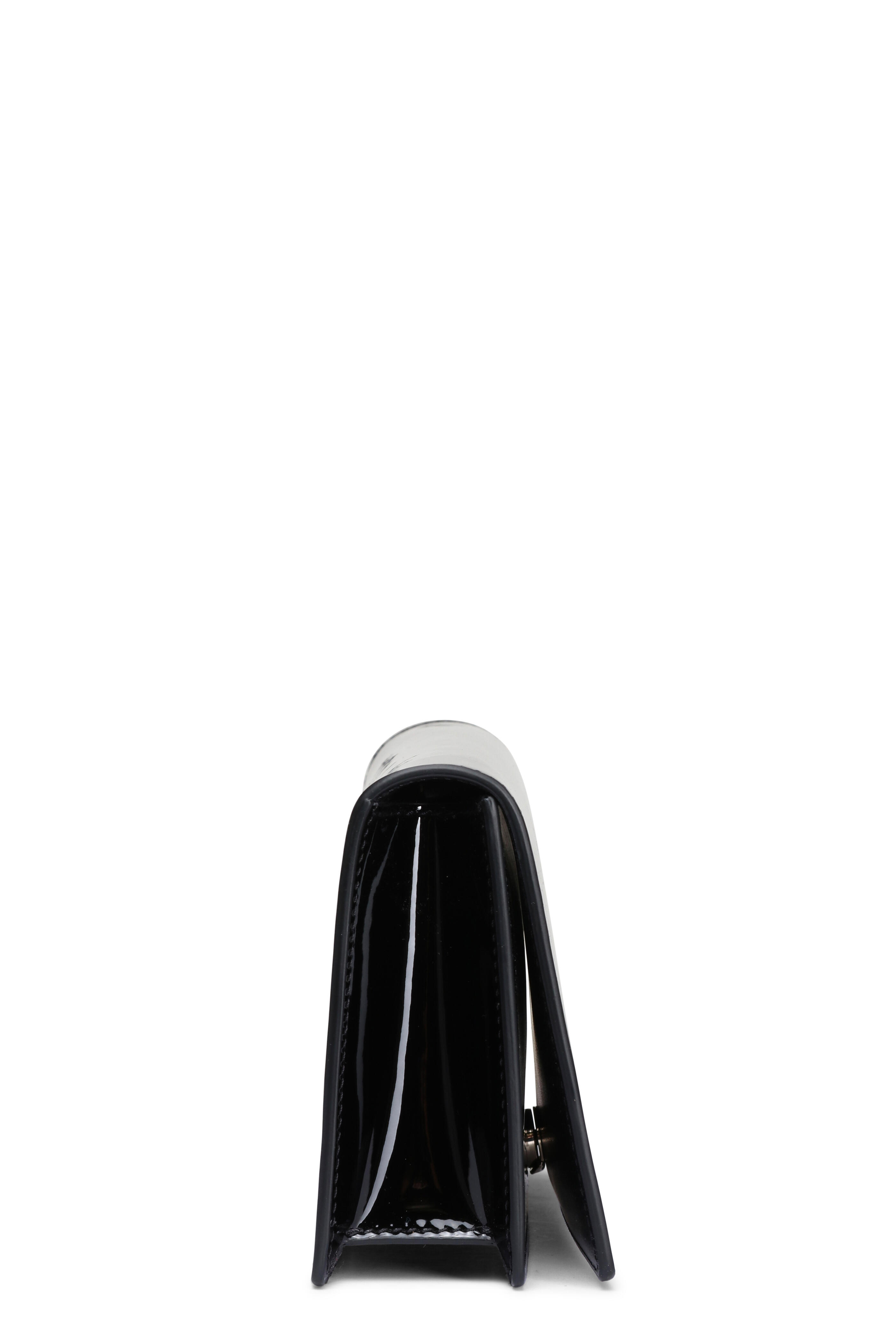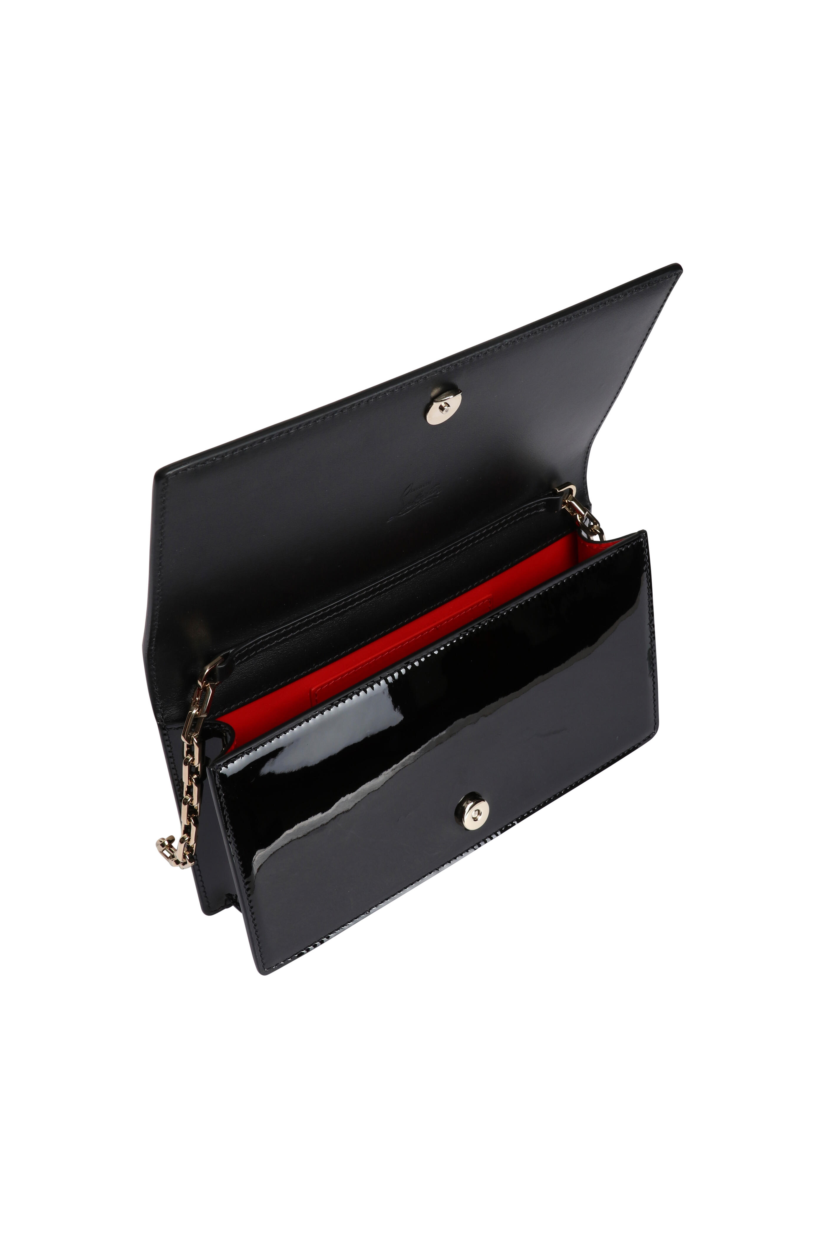 Patent calf leather outer. Calf leather lining. Fold over flap. Magnetic closure. Detachable chain crossbody strap. Features gold embellishment. Interior card wall pocket. Signature red leather interior. Made in Italy. 2” W x 4.7” H x 8.7” L. Strap drop: 44.9”.