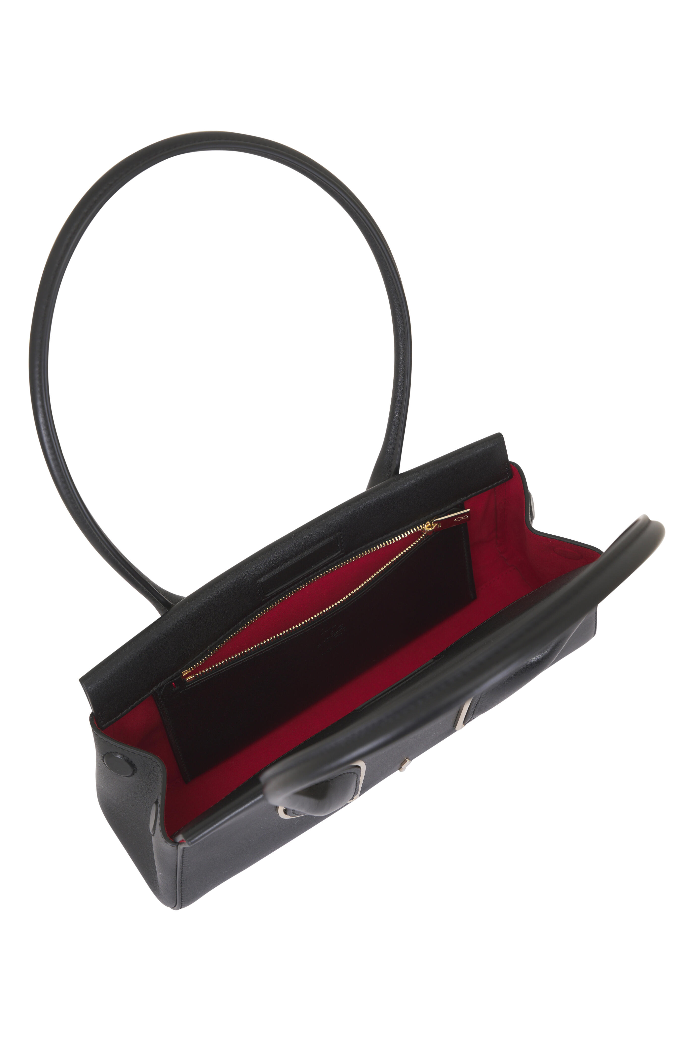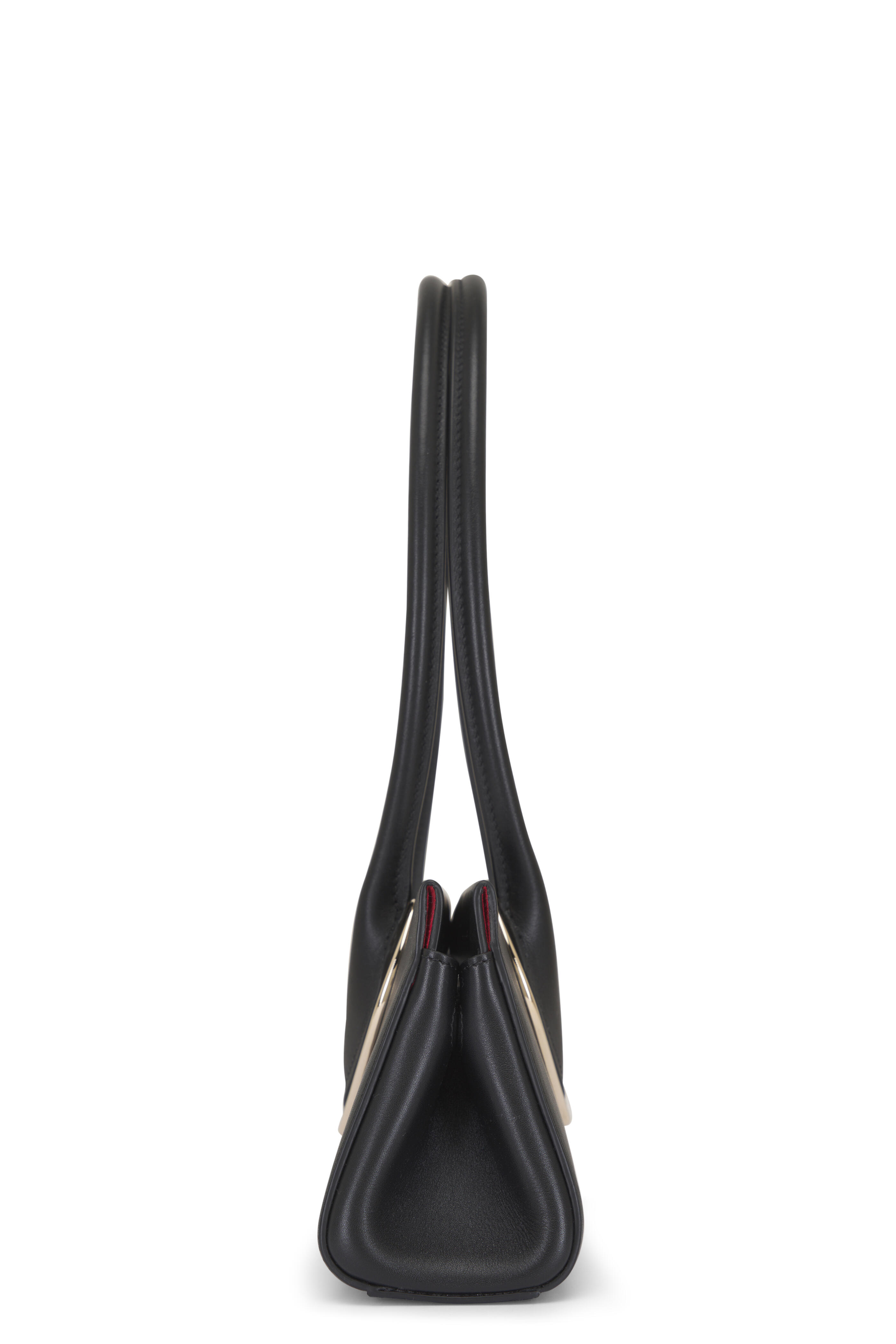 Leather upper. Two top handles. Magnetic closure. One main compartment; internal zip pocket. Suede lining. Made in Italy. Length: 5". Width: 12". Depth: 3 1/2". Handle drop: 10".