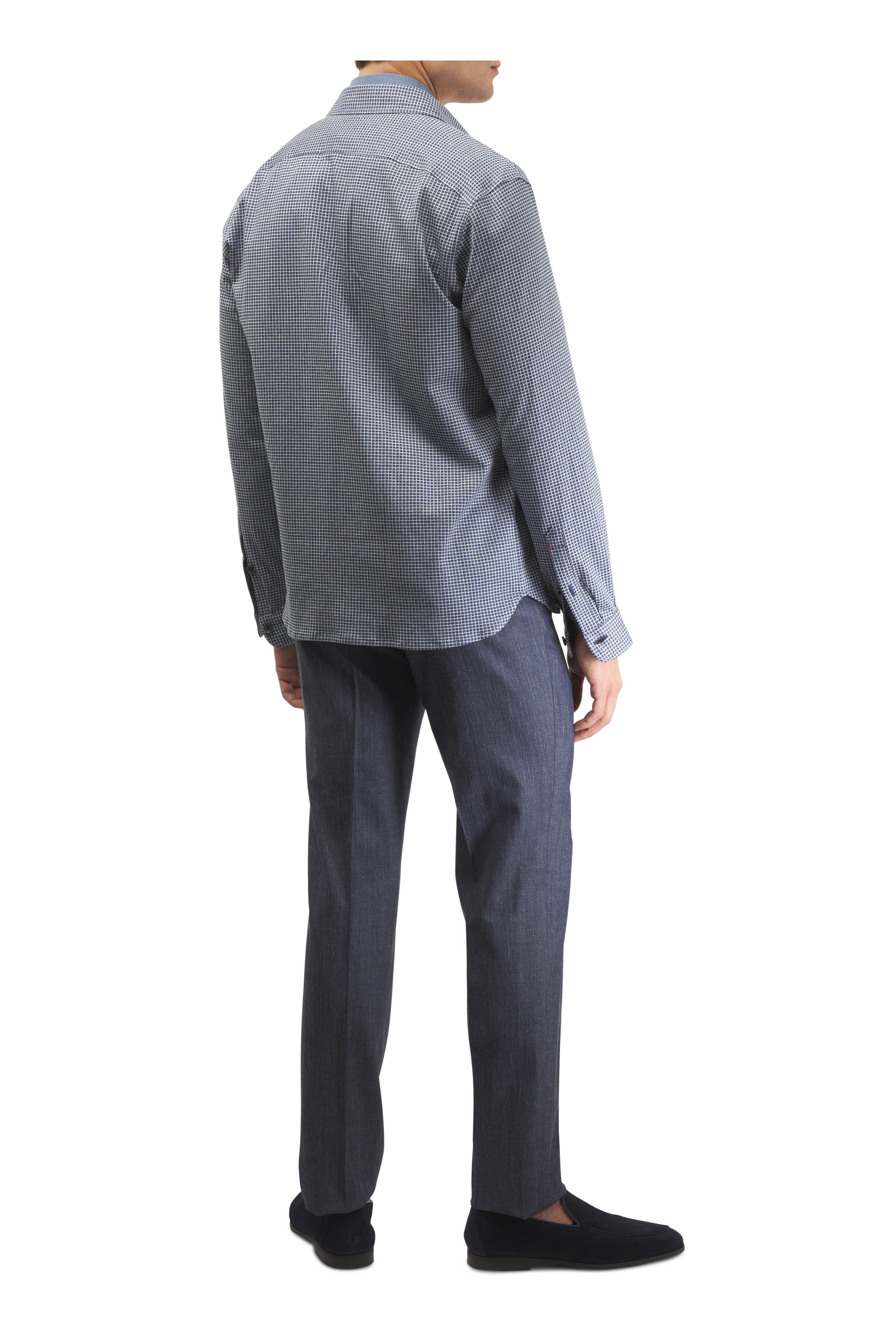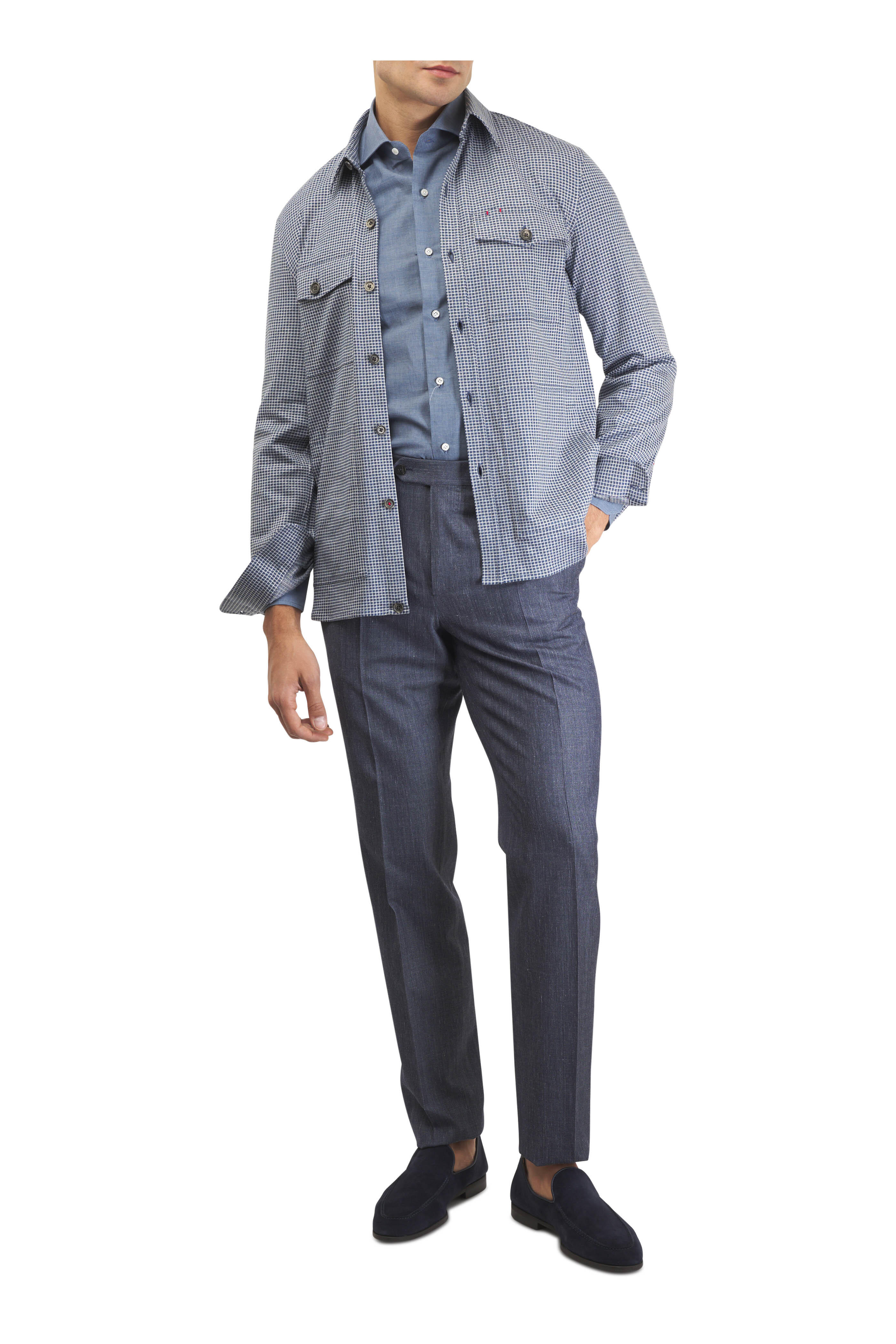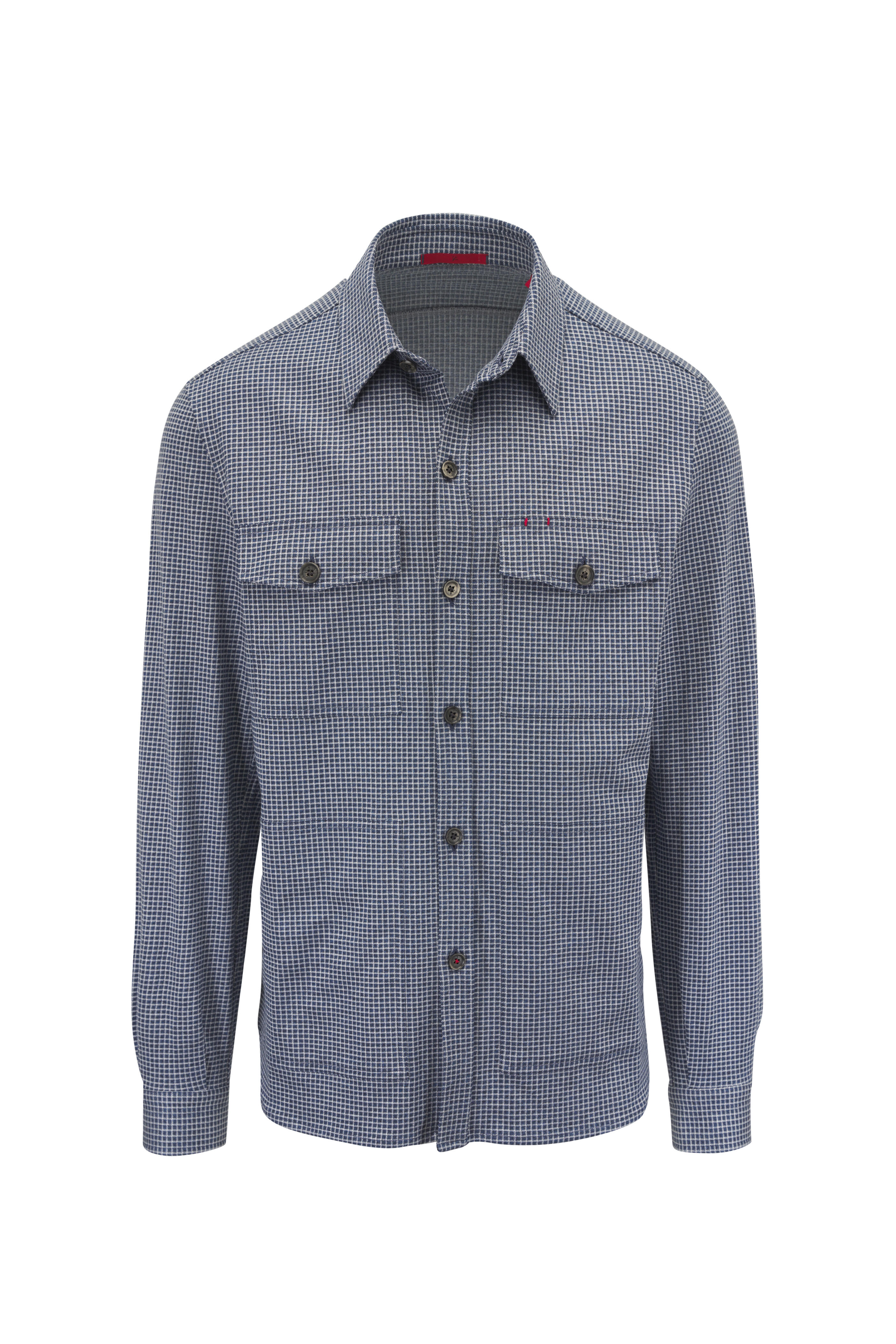 Spread collar. Front button placket. Chest flap pockets with button closure. Lower slip pockets; chest patch pocket. Made in Italy. 54% Cotton, 46% silk. Dry clean.