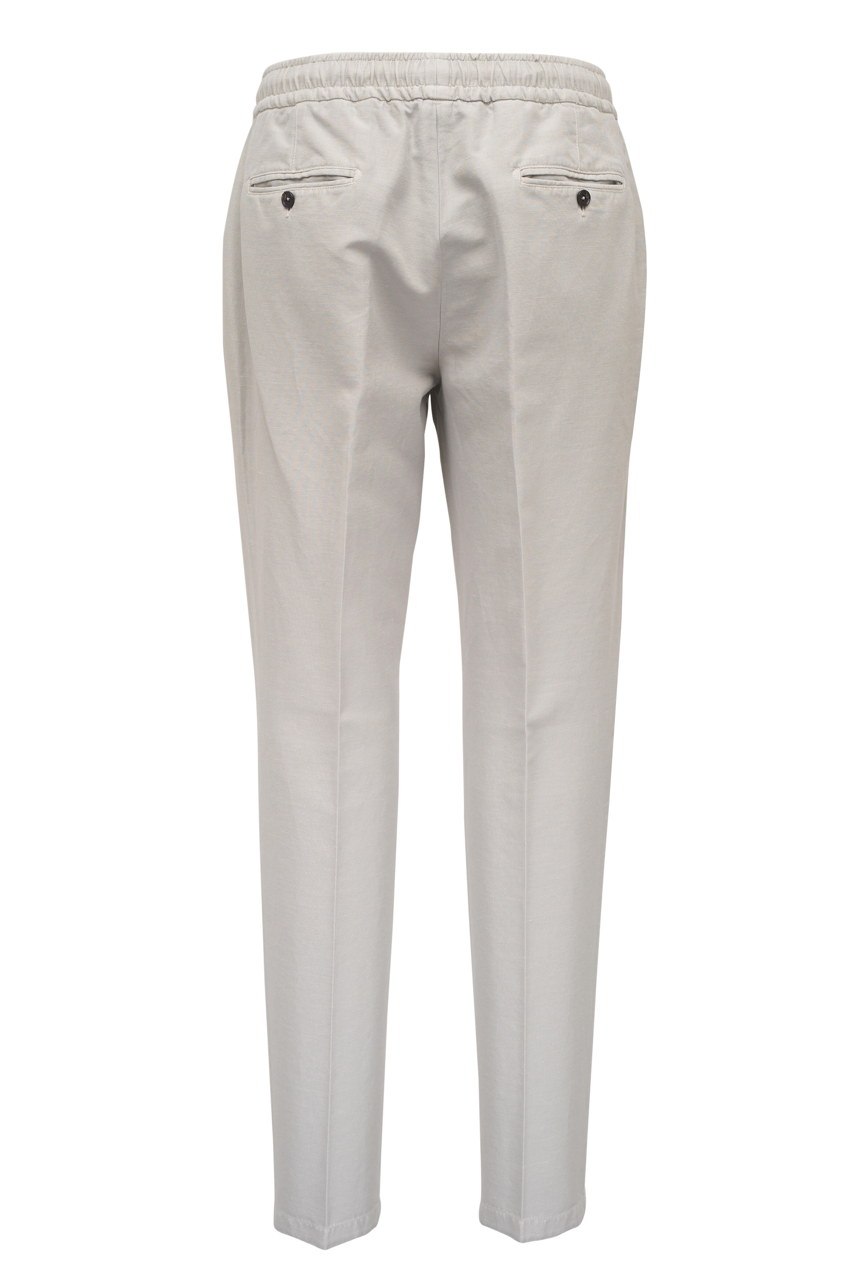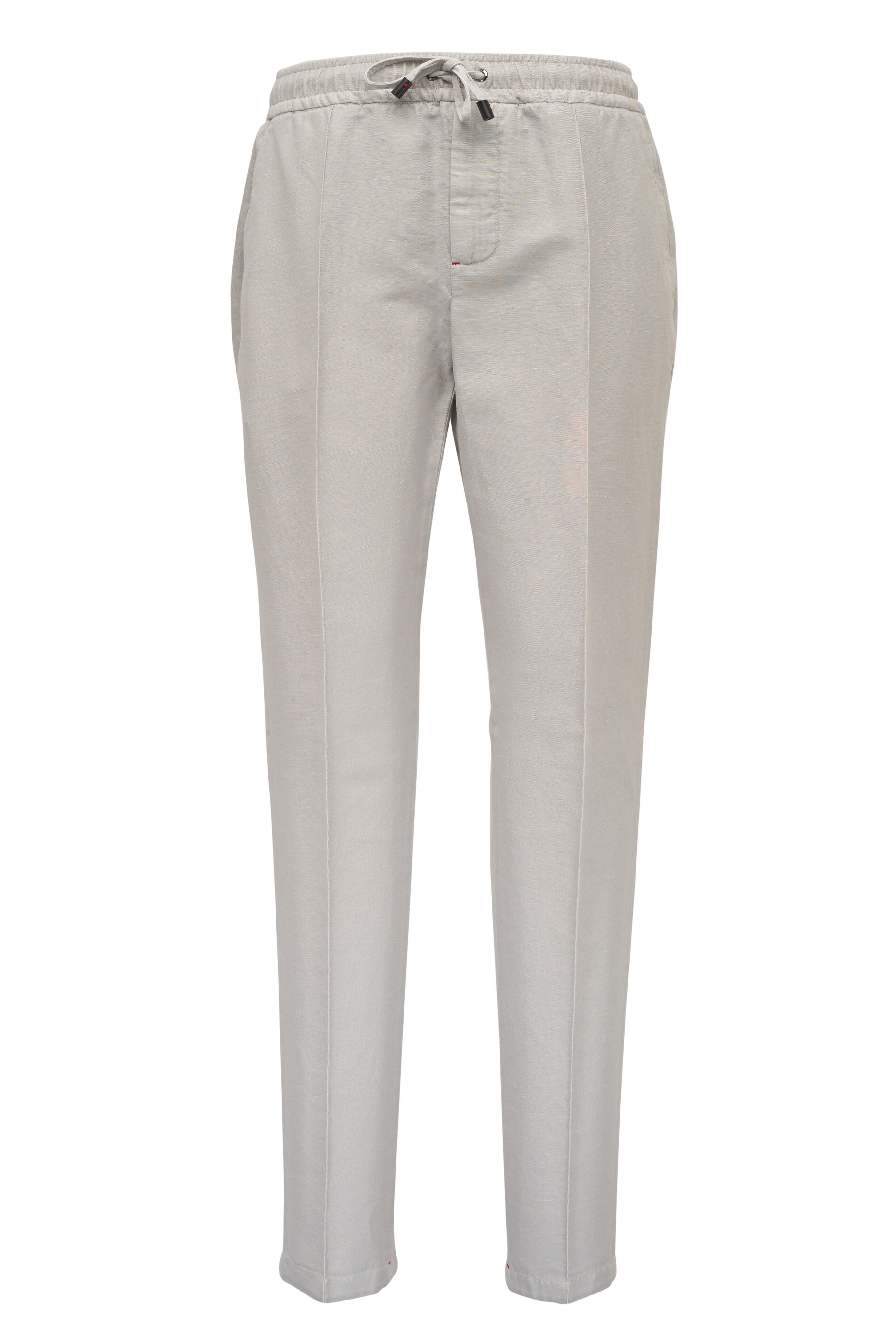 Drawstring; zip fly. Slip on style. Waist slip pockets; back besom pockets. Straight hem. Made in Italy. 33" Inseam (size 36). 72% cotton, 28% linen. Machine wash.