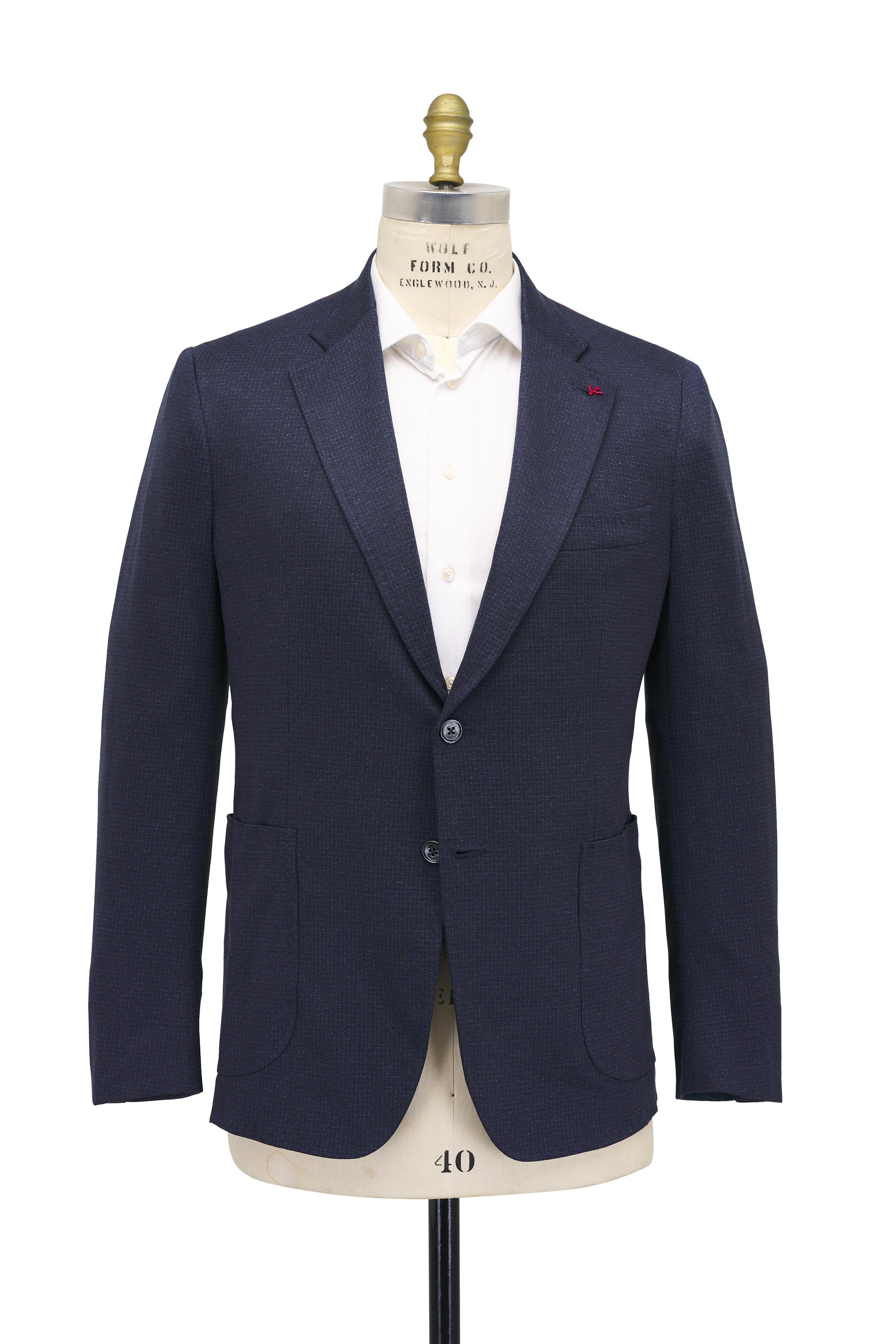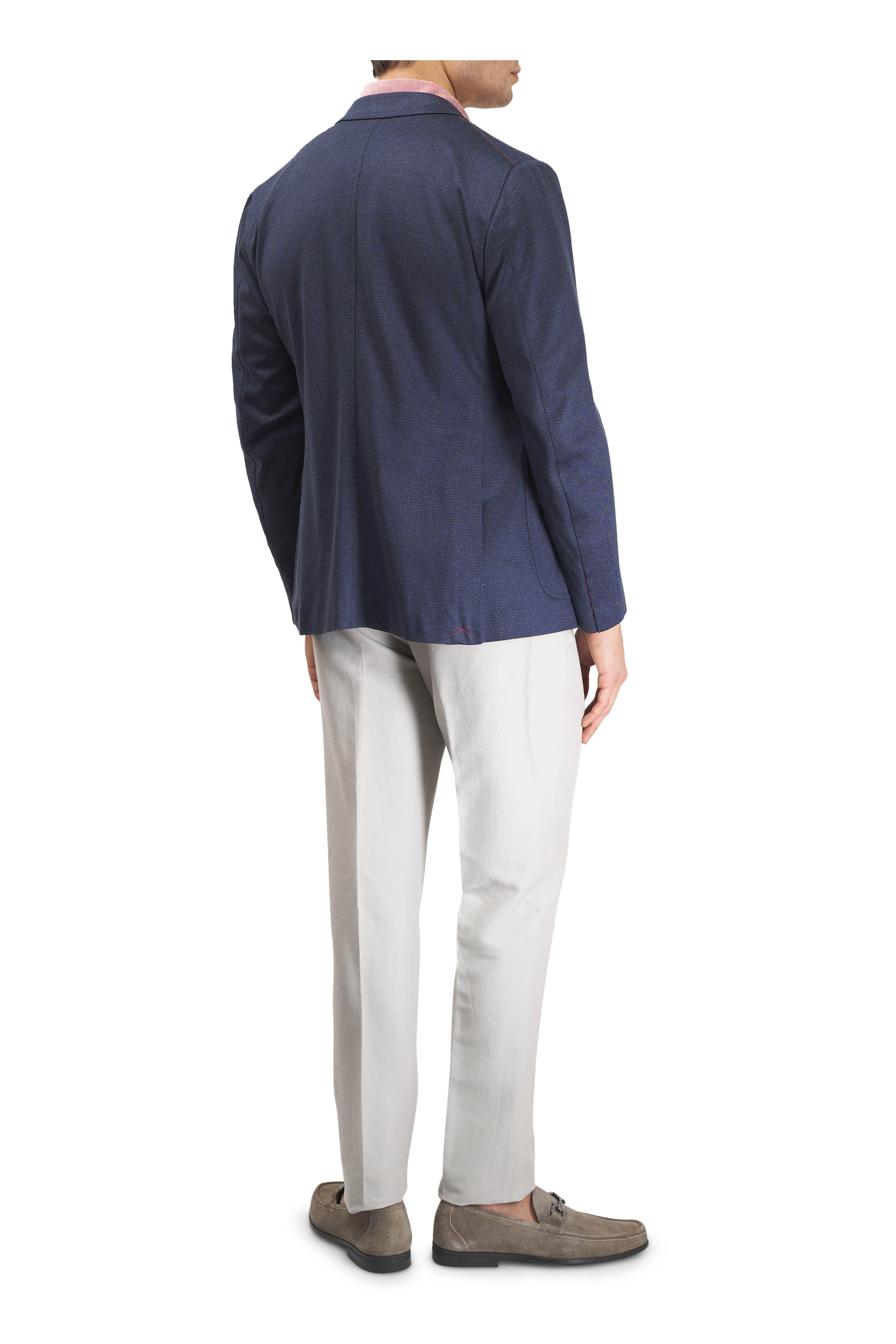 Notch lapels. Two-button closure. Left chest welt pocket; lower waist patch pockets. Unfinished buttonholes. Double back vents. Made in Italy. 68% silk, 32% cotton. Dry clean.