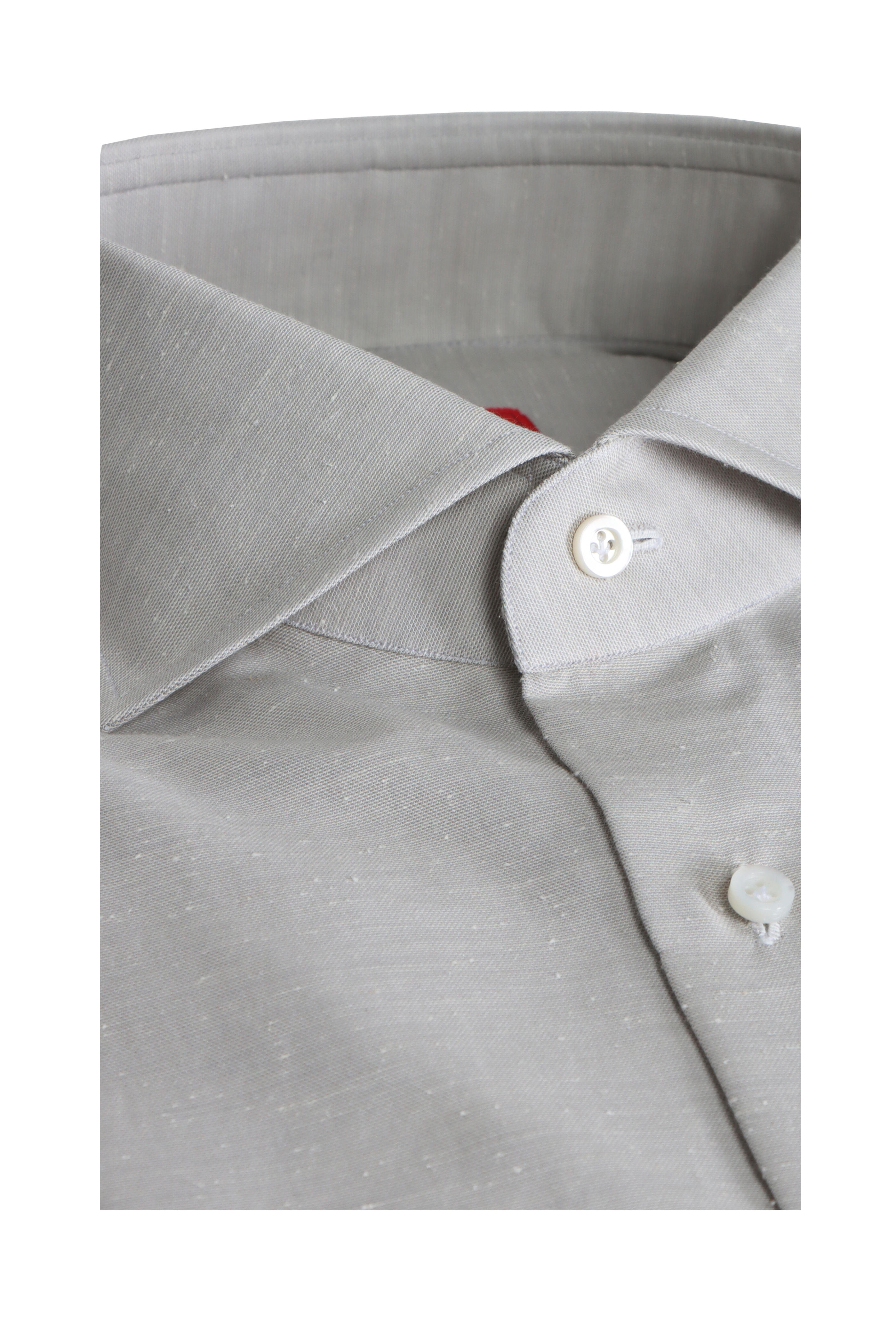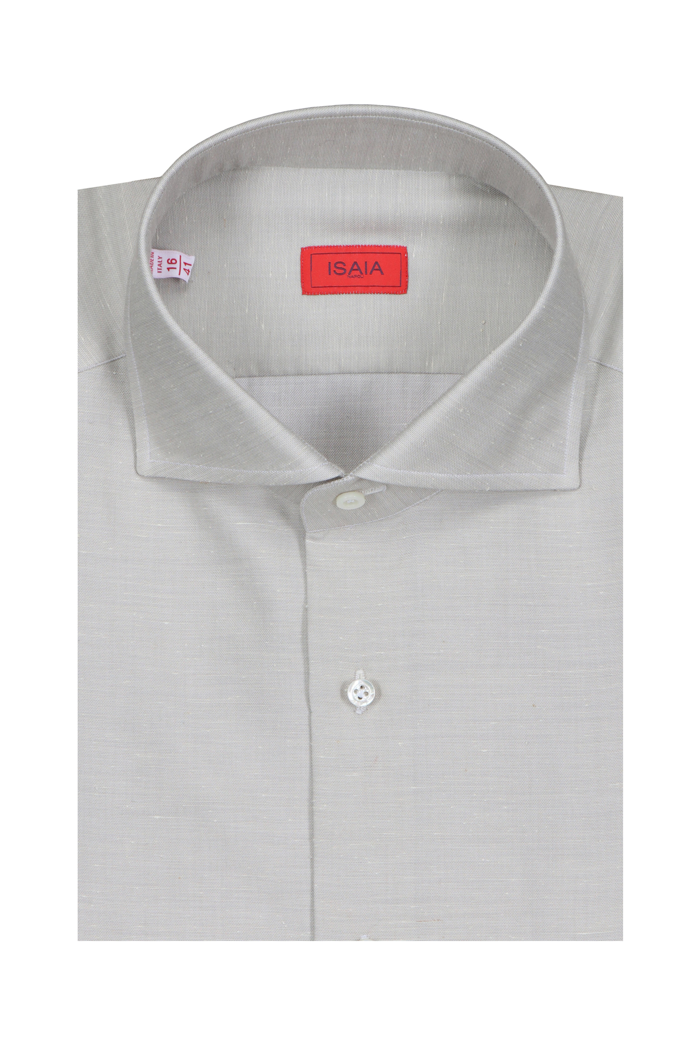 Spread collar. Front button placket. Single button barrel cuffs. Made in Italy. 85% cotton, 15% silk. Dry clean.