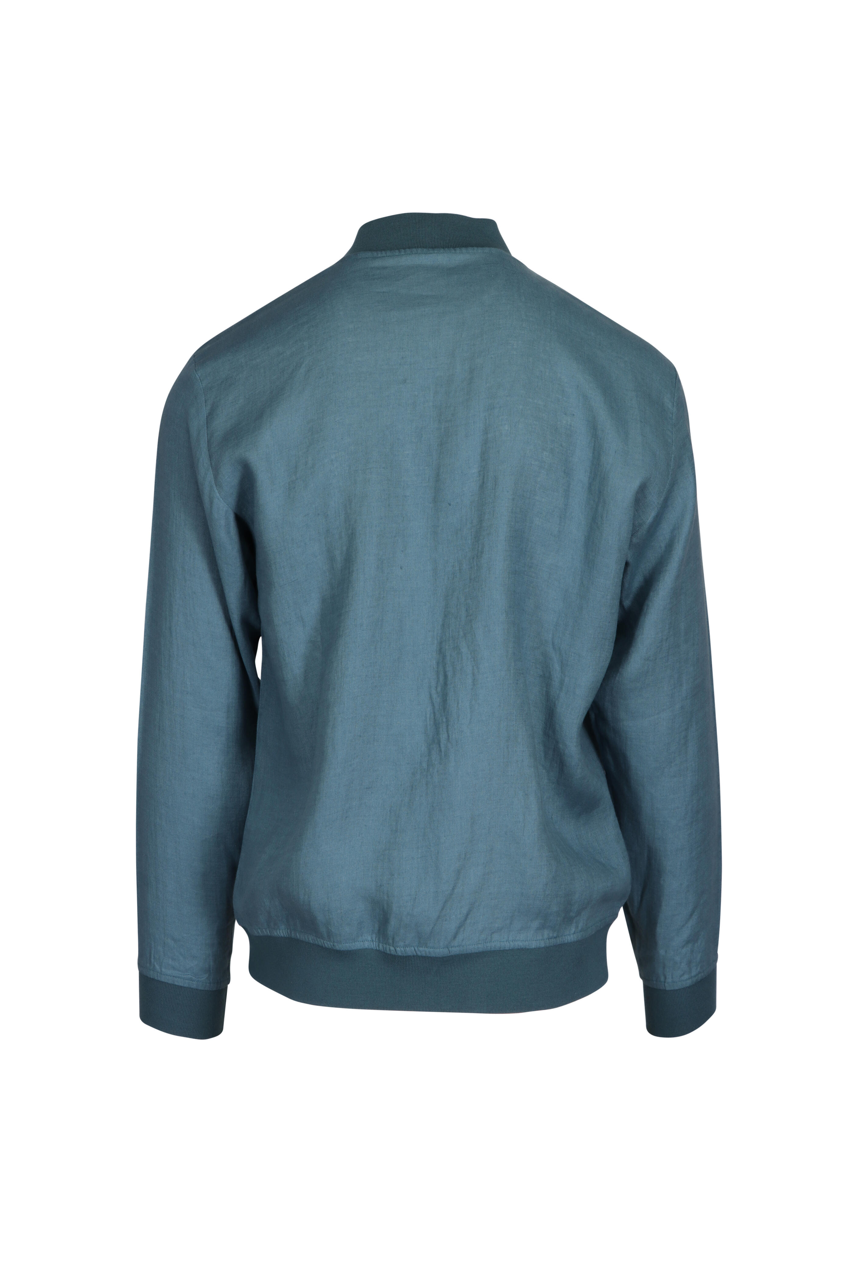 Rib-knit baseball collar. Two-way front zip. Ribbed trims. Side slip pockets. Made in Italy. 100% linen; lined. Dry clean.