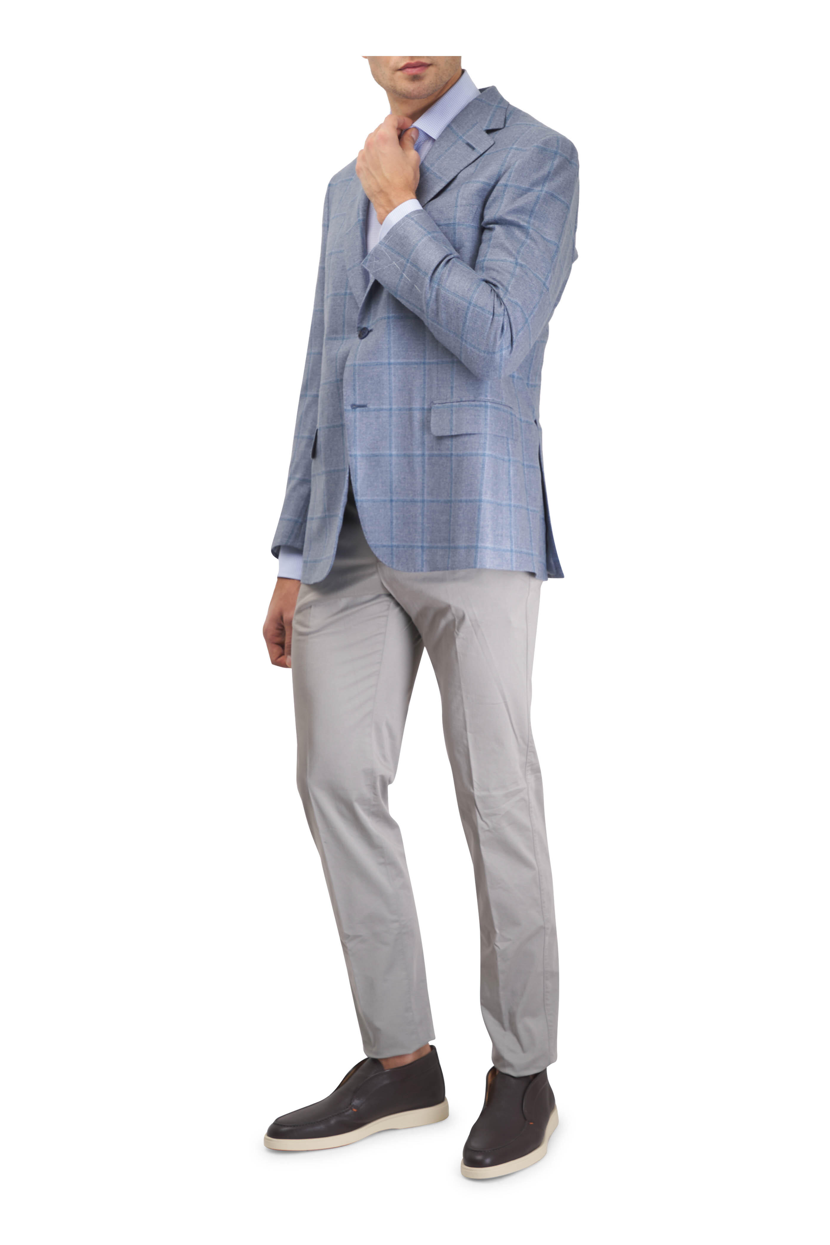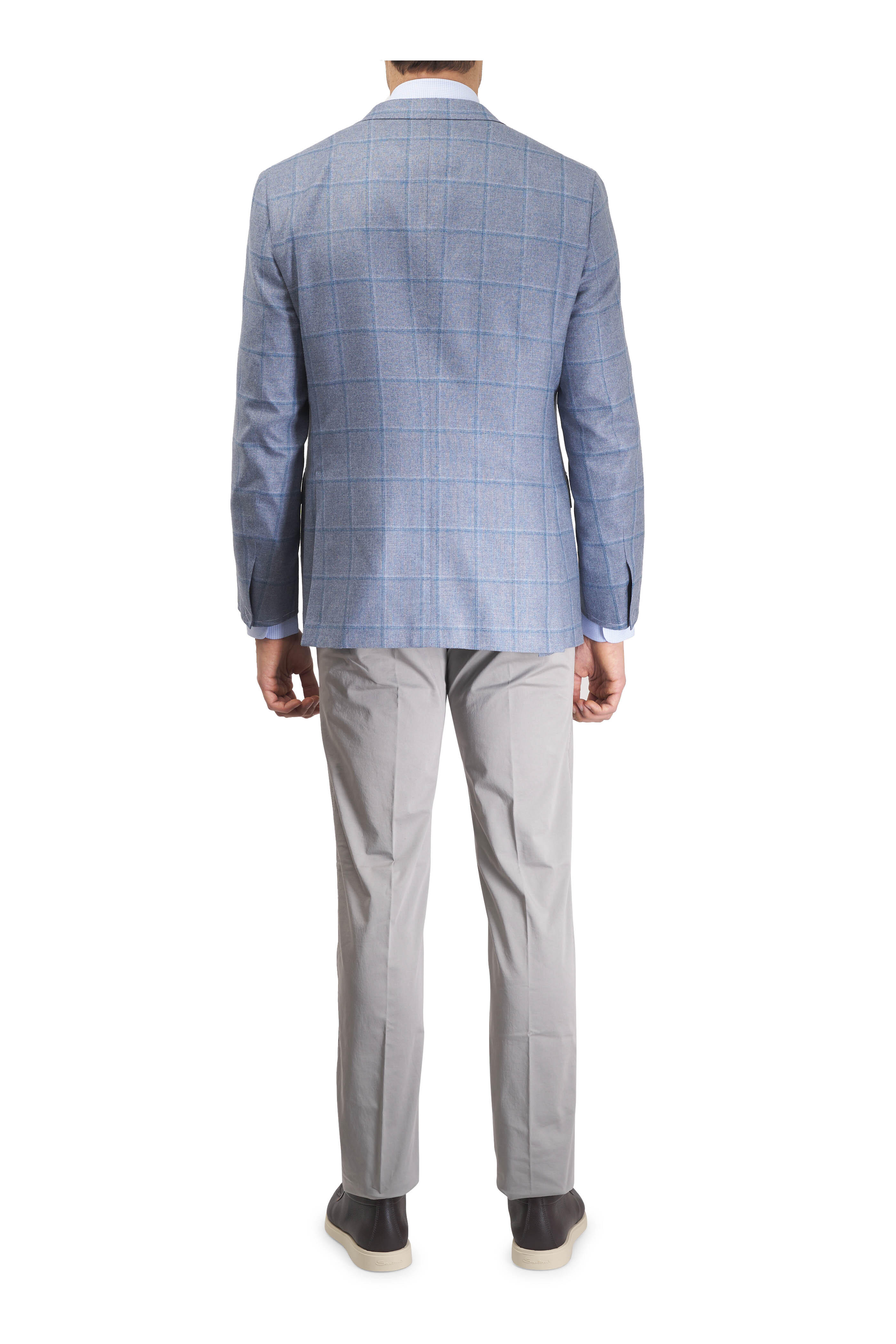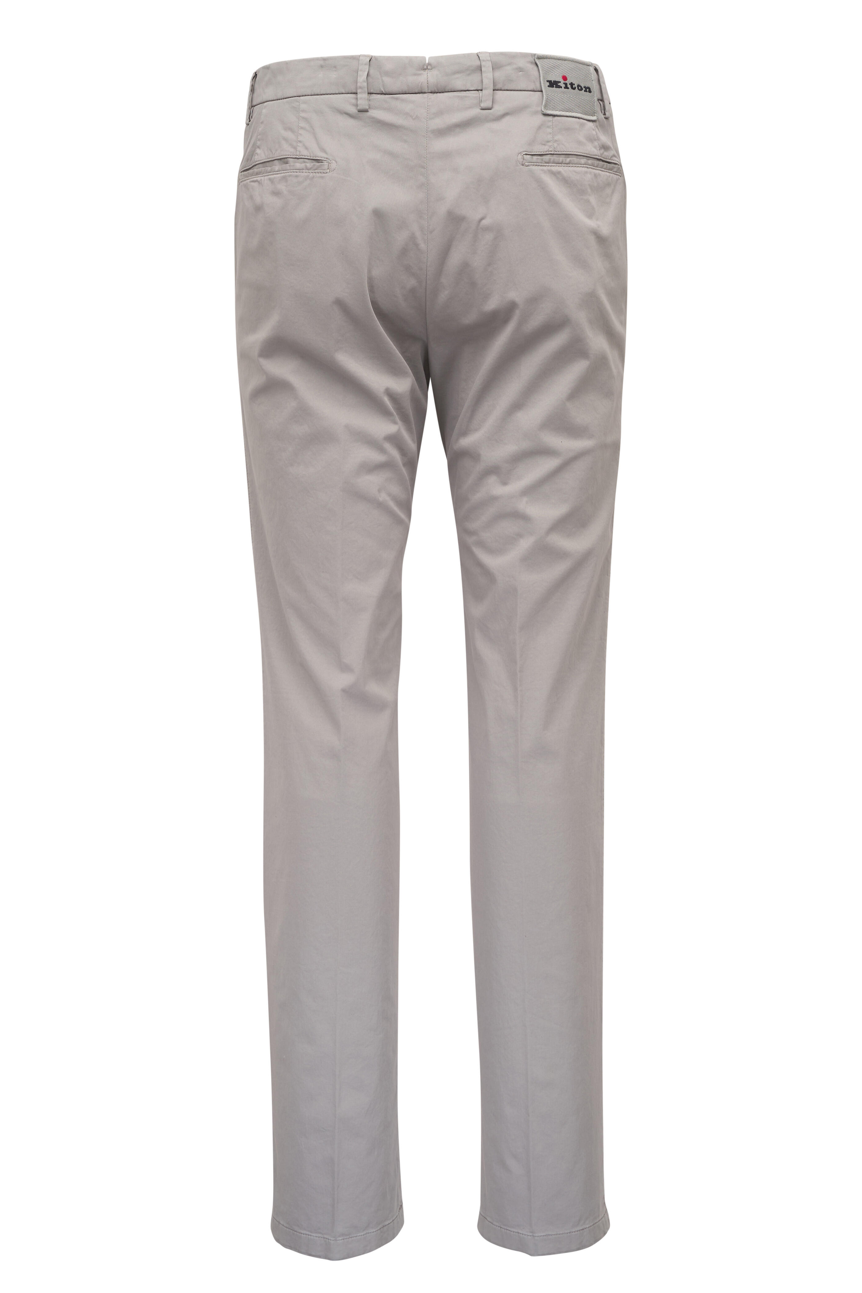 Zip fly; three button closure. Banded waist; belt loops. Side slip pockets; back button besom pockets. Straight hem. Made in Italy. 33" Inseam (size 36). 97% Cotton, 3% elastane. Dry clean.