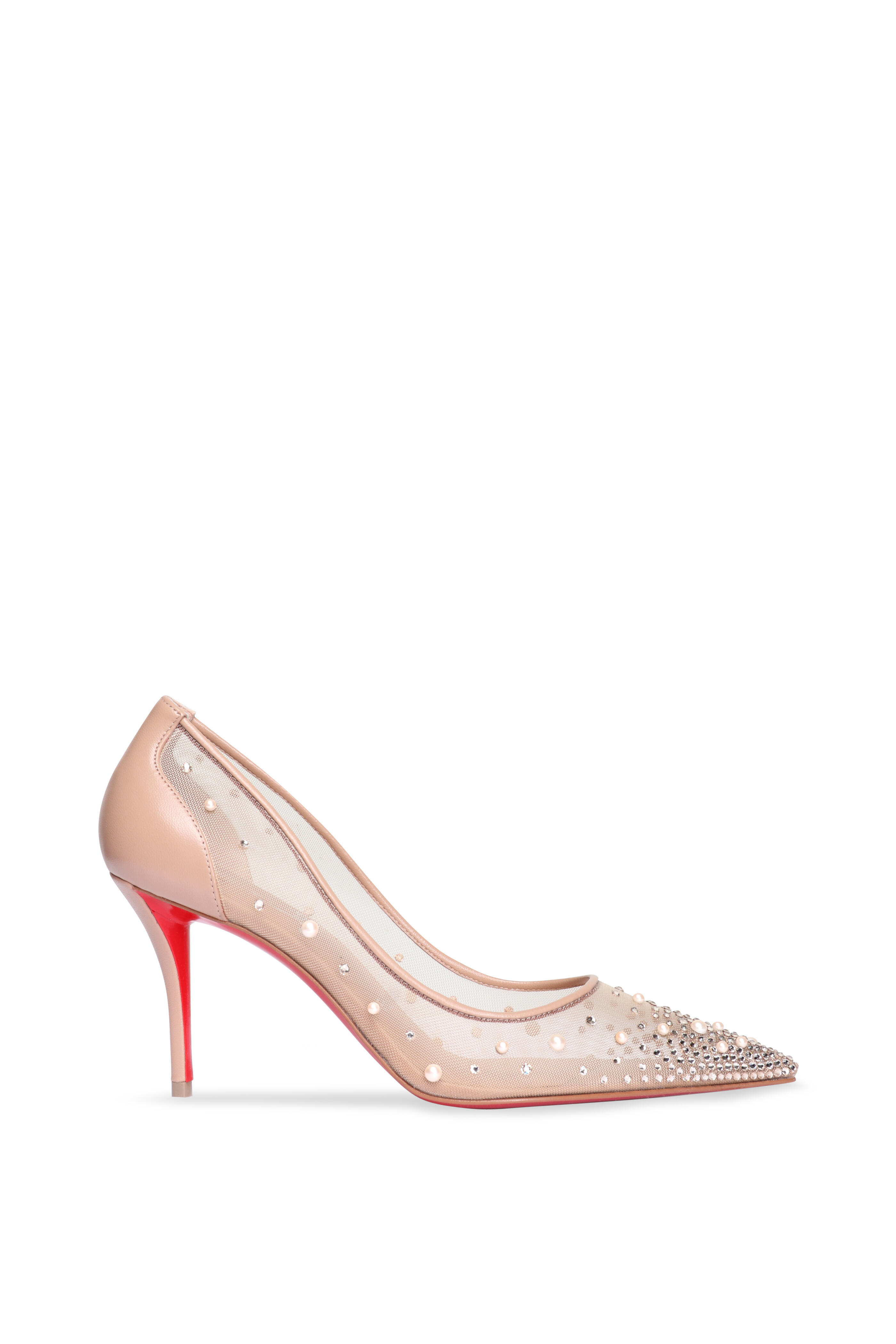 Mesh and leather upper. Leather lining. Signature red leather sole. Pointed toe. Embellished with scattered crystals and dome studs. Slip-on style. Stiletto heel. Made in Italy. Heel measurement: 85mm.