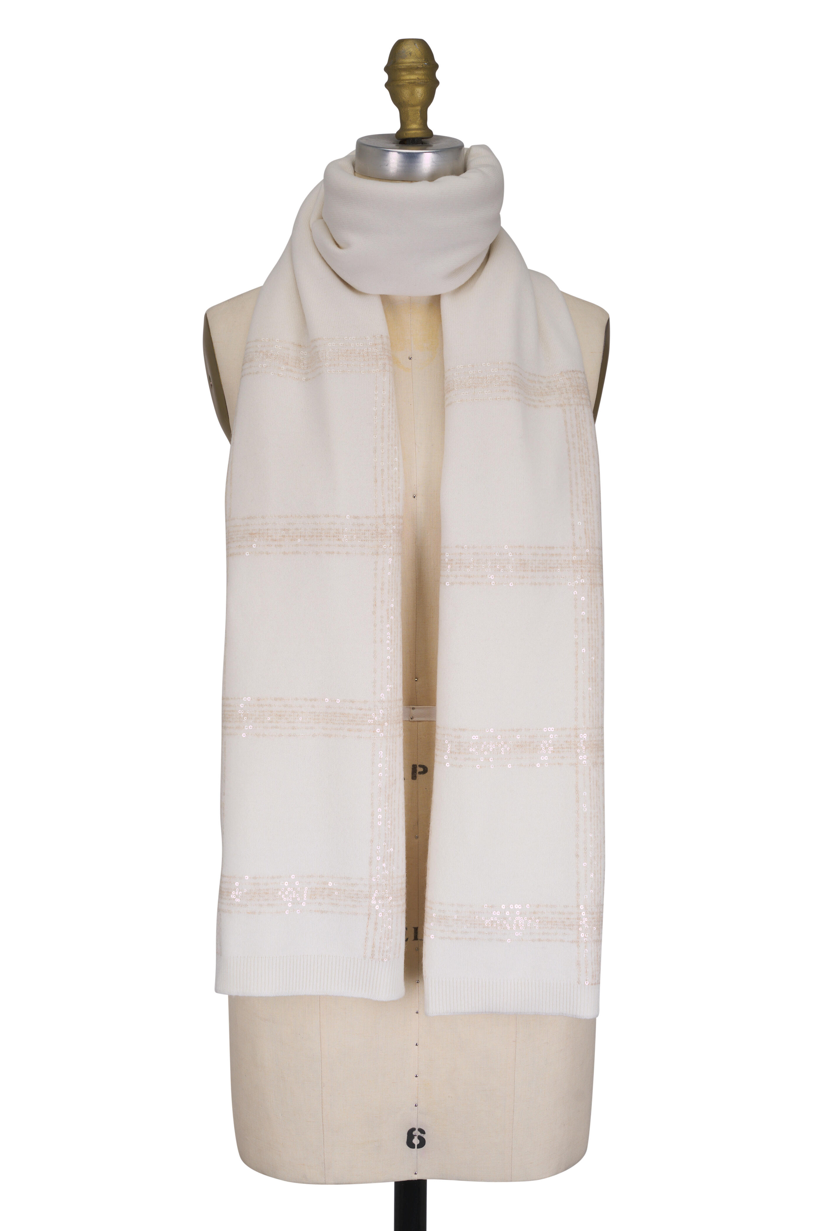 Fringe trim. Made in Italy. 15.3" x 81.9". 100% cashmere. Hand wash.