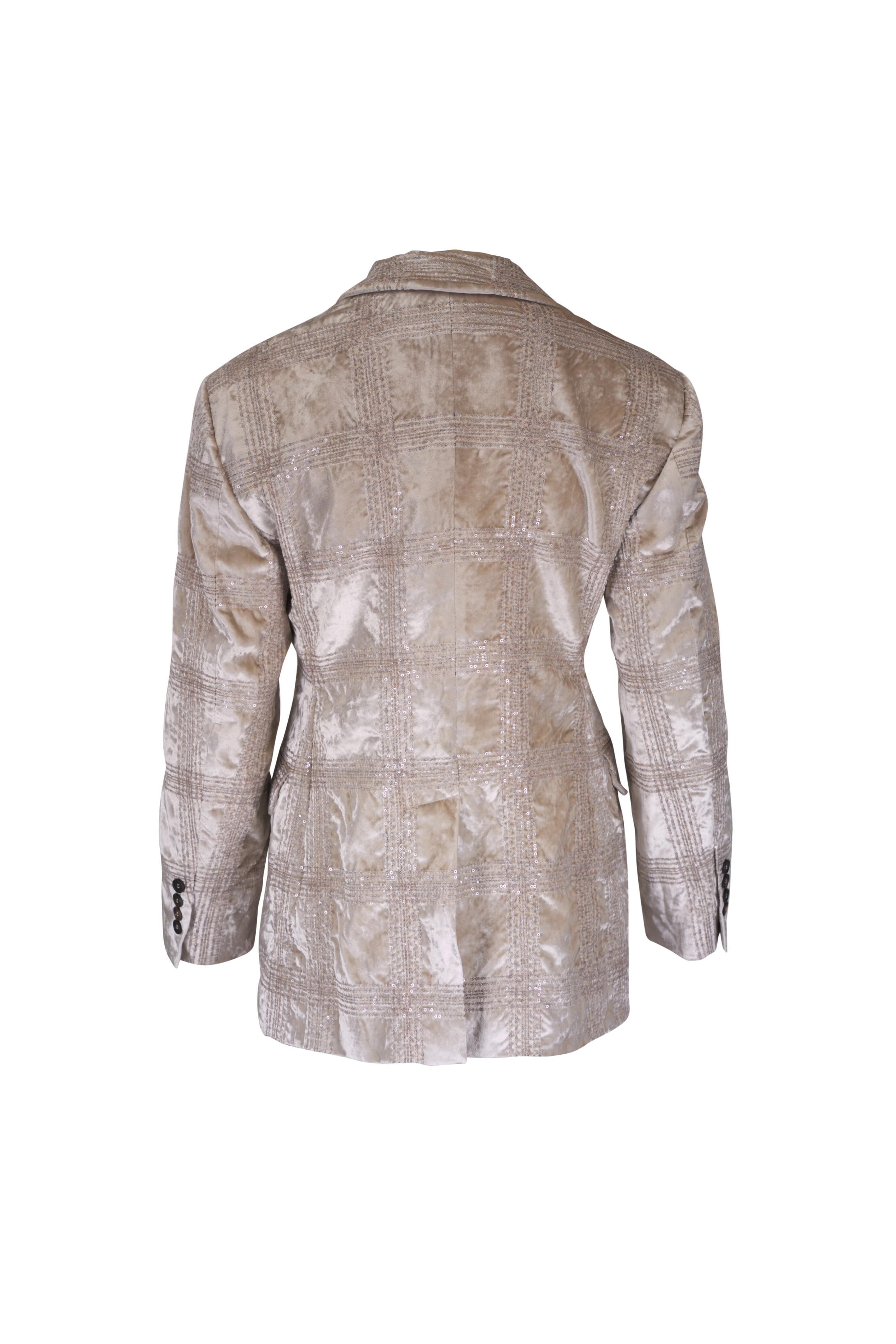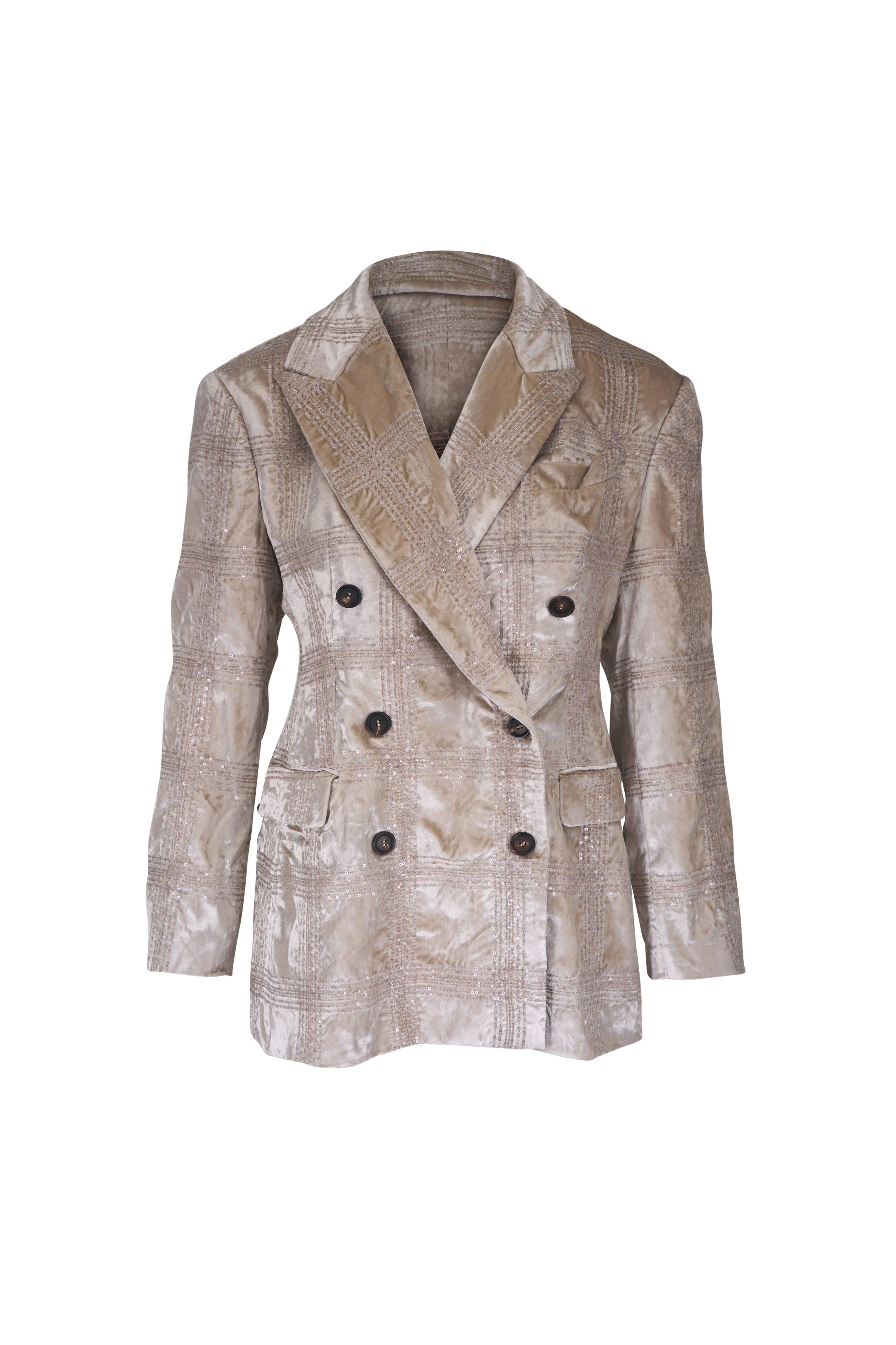 Peak lapels; double-breasted front. Chest welt pocket. Hip flap pockets. Button cuffs. Hem falls below the hips. Made in Italy. Slim fit. 80% Viscose, 20% cotton. Dry clean.