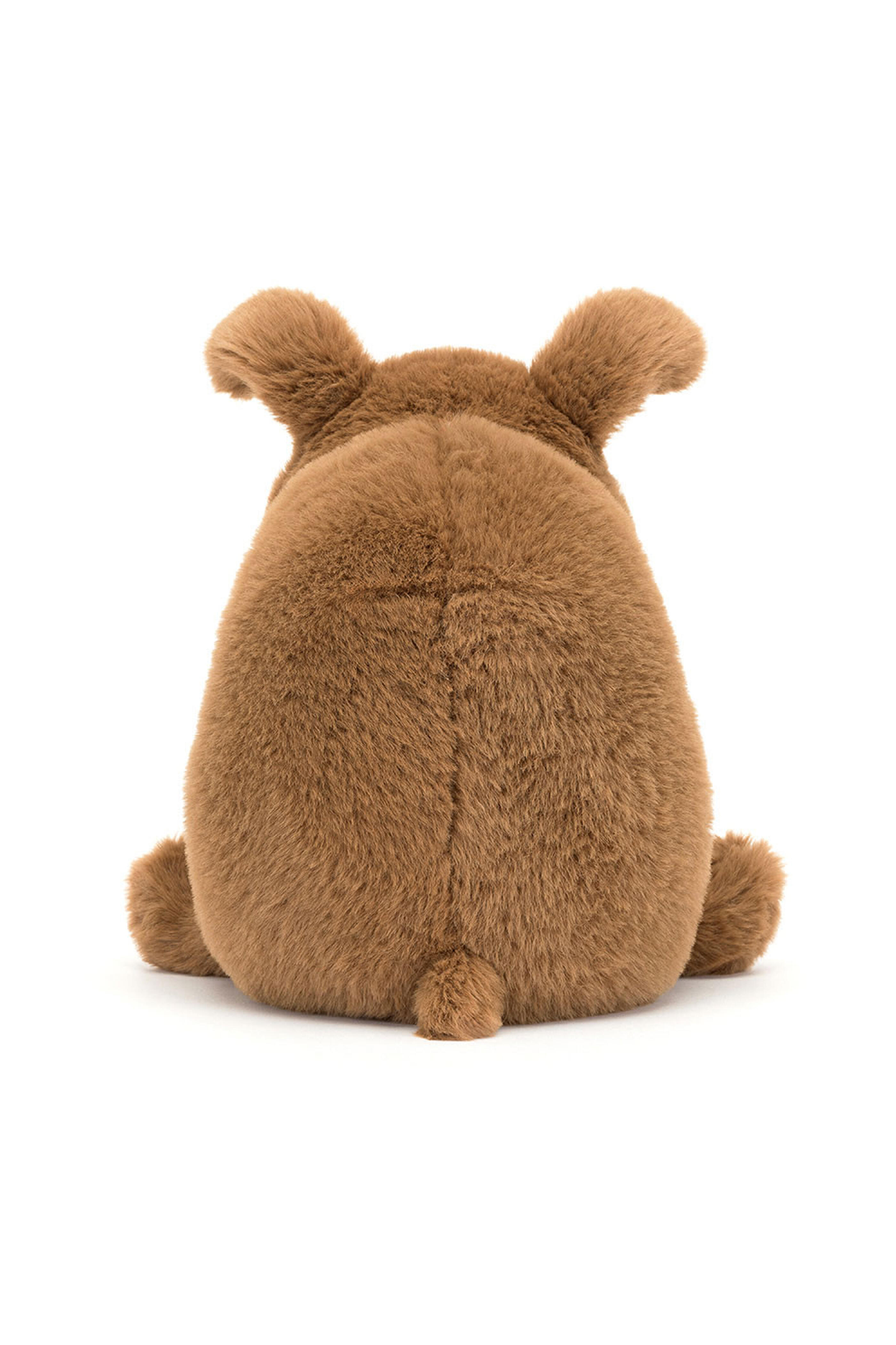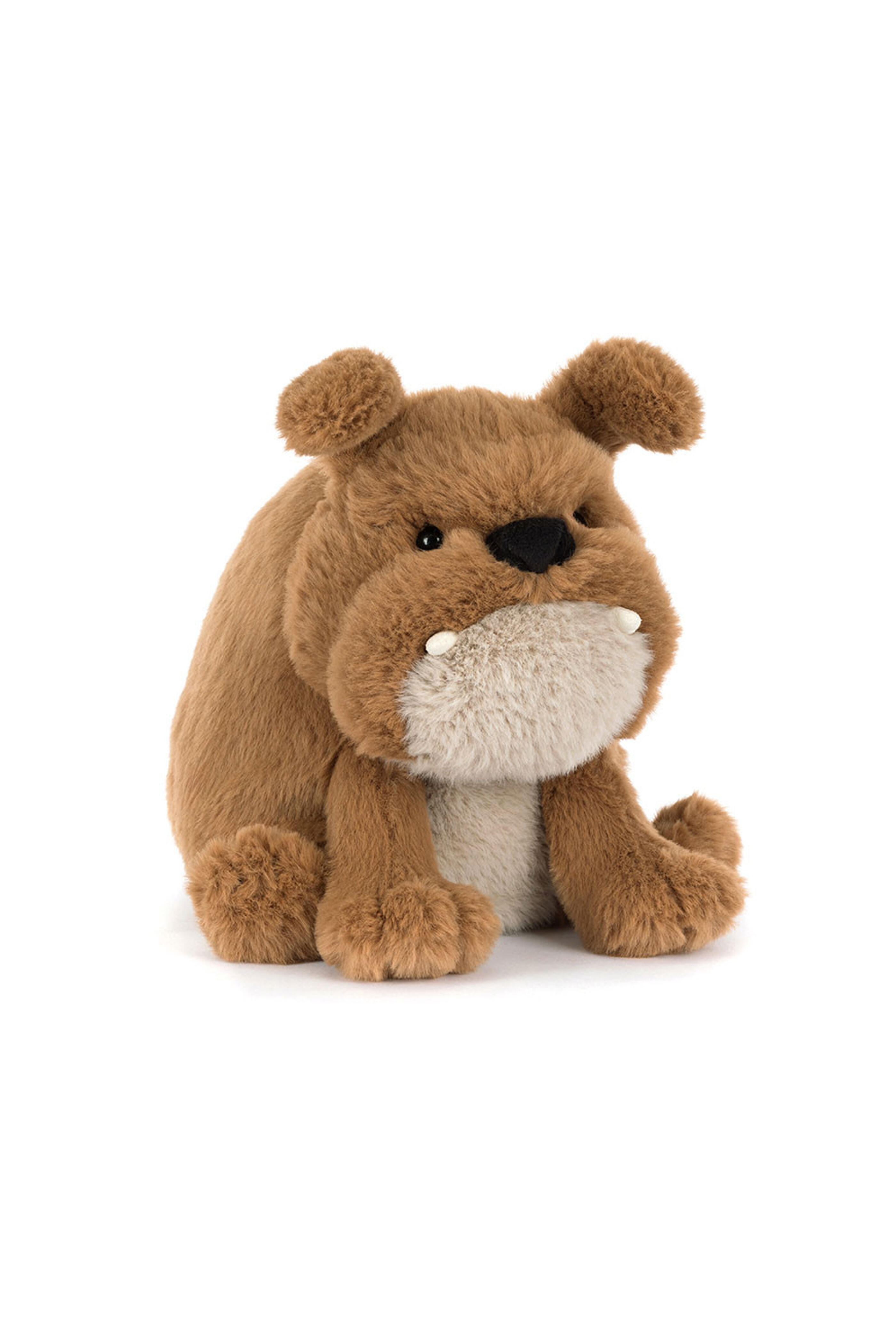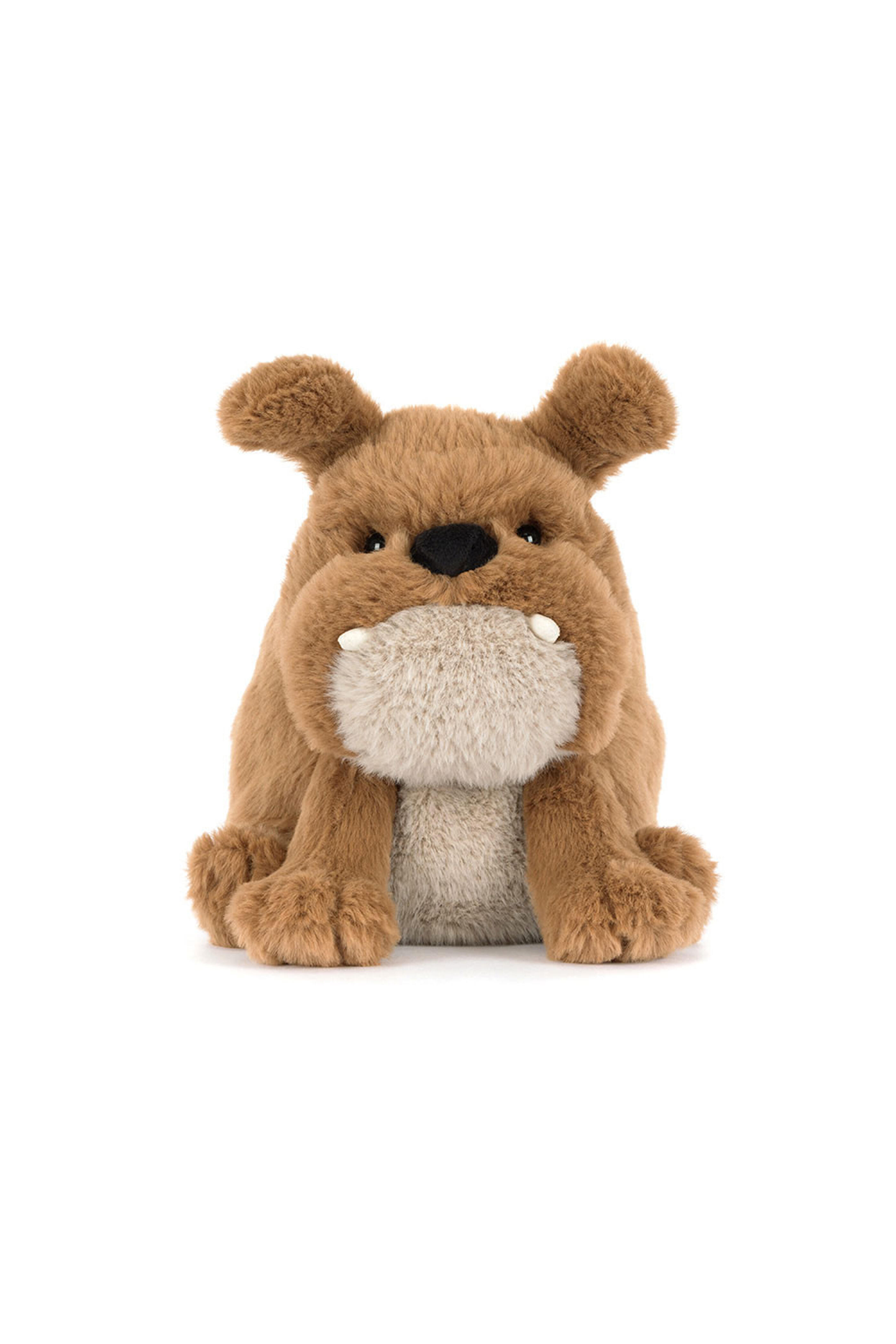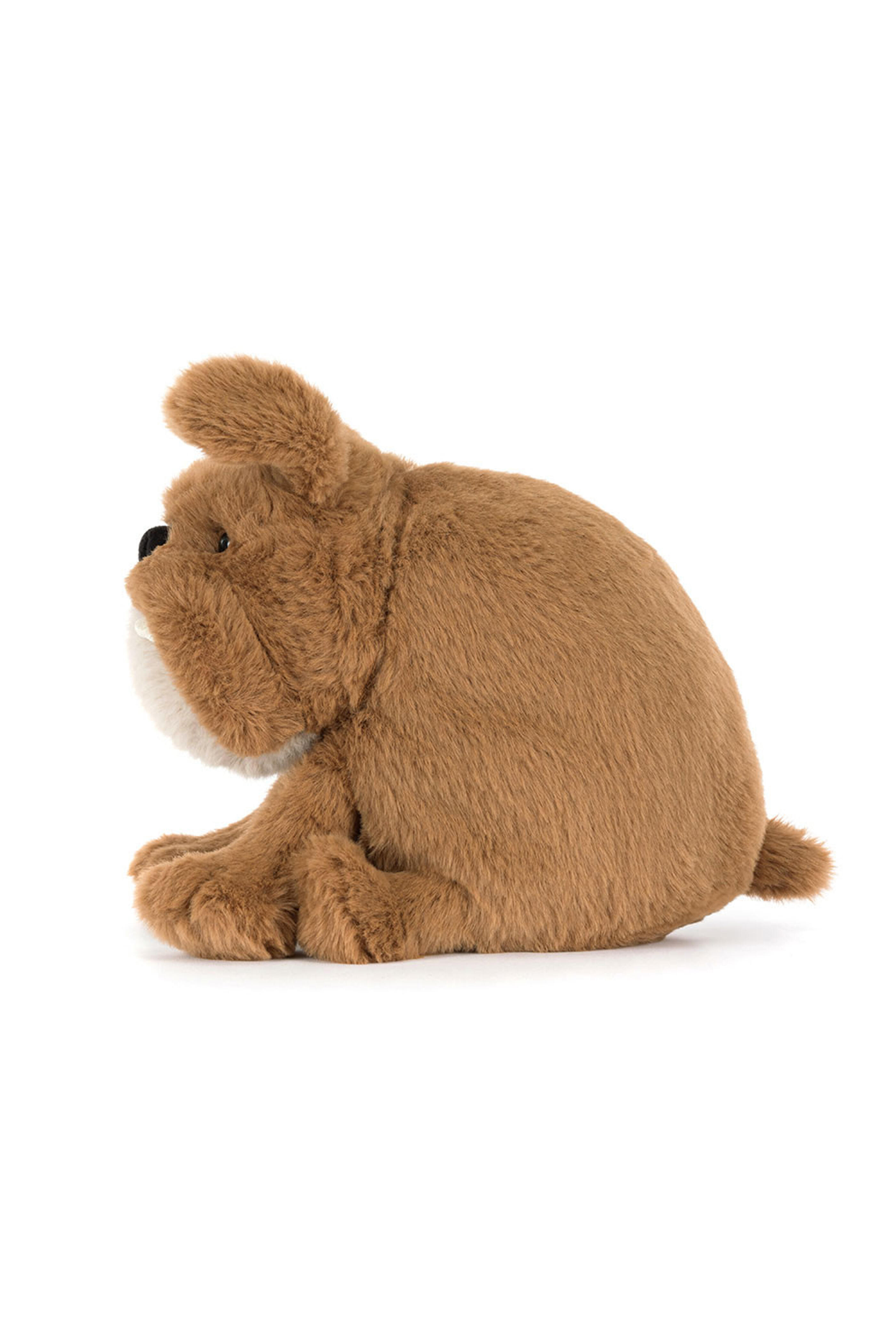 Main Materials: Polyester. Inner Filling: Polyester Fibers, PE Beans. Derreck Dog may be frowning, but he’s really a super friendly fellow! Soft and squat in brown fur, Derreck has an oatmeal tummy perfect for belly rubs! With a grumpy face complete with stitched frown and cream suedette teeth, this darling dog is the perfect social companion to bring a little joy to every journey!. Hard Eye. Made in London. Dimensions: 9.1” x 6.3” x 8.3”. Sitting Height: 9”. Care Instructions: 86 degree Fahrenheit wash only. Do not tumble dry, dry clean, or iron.