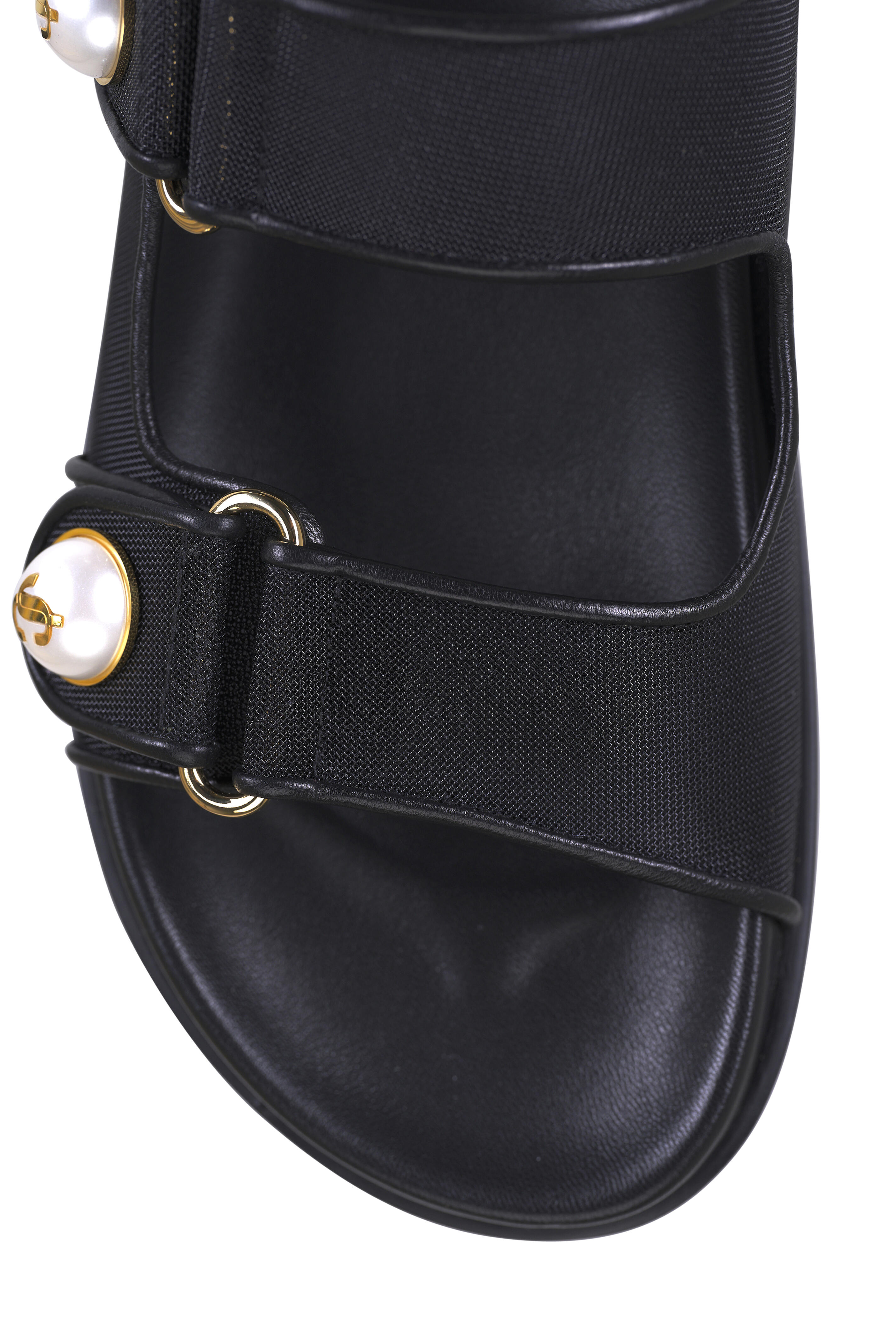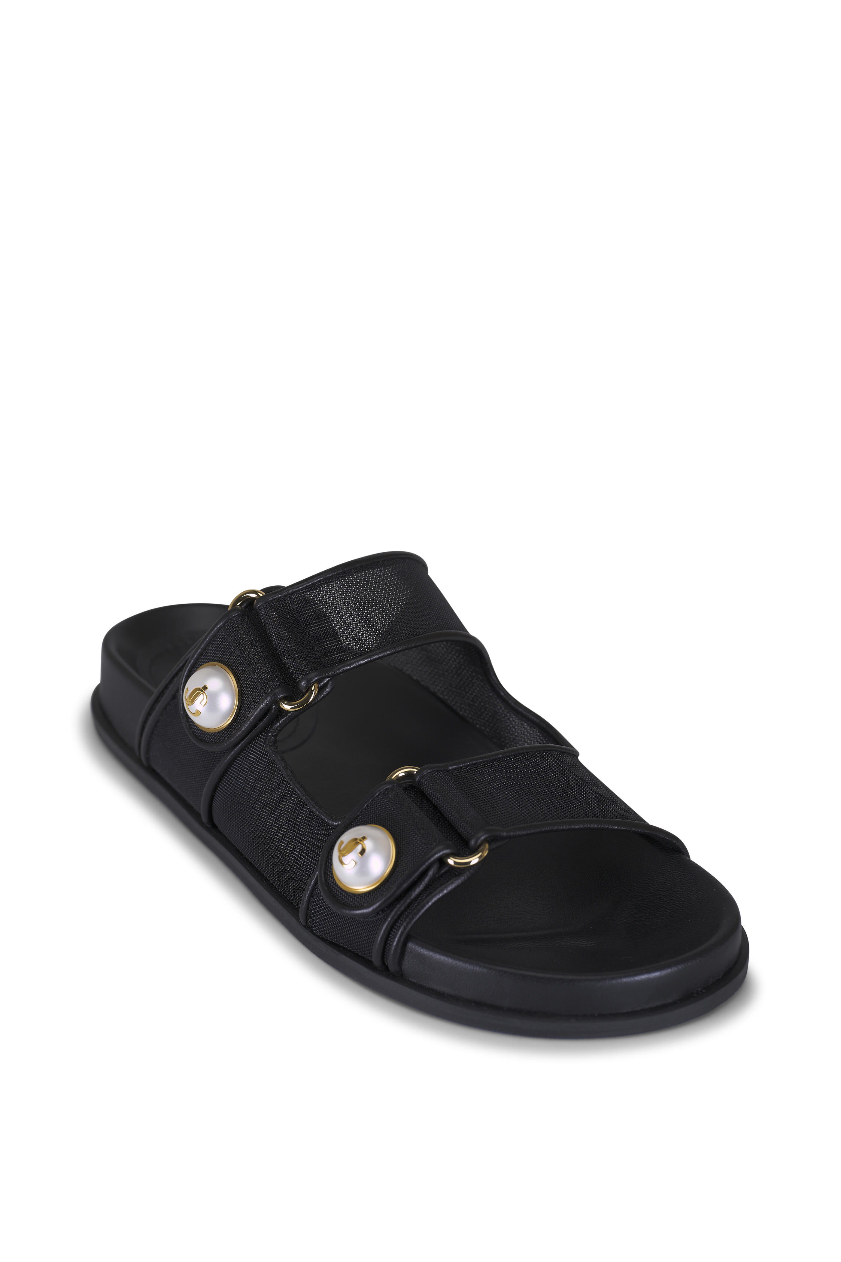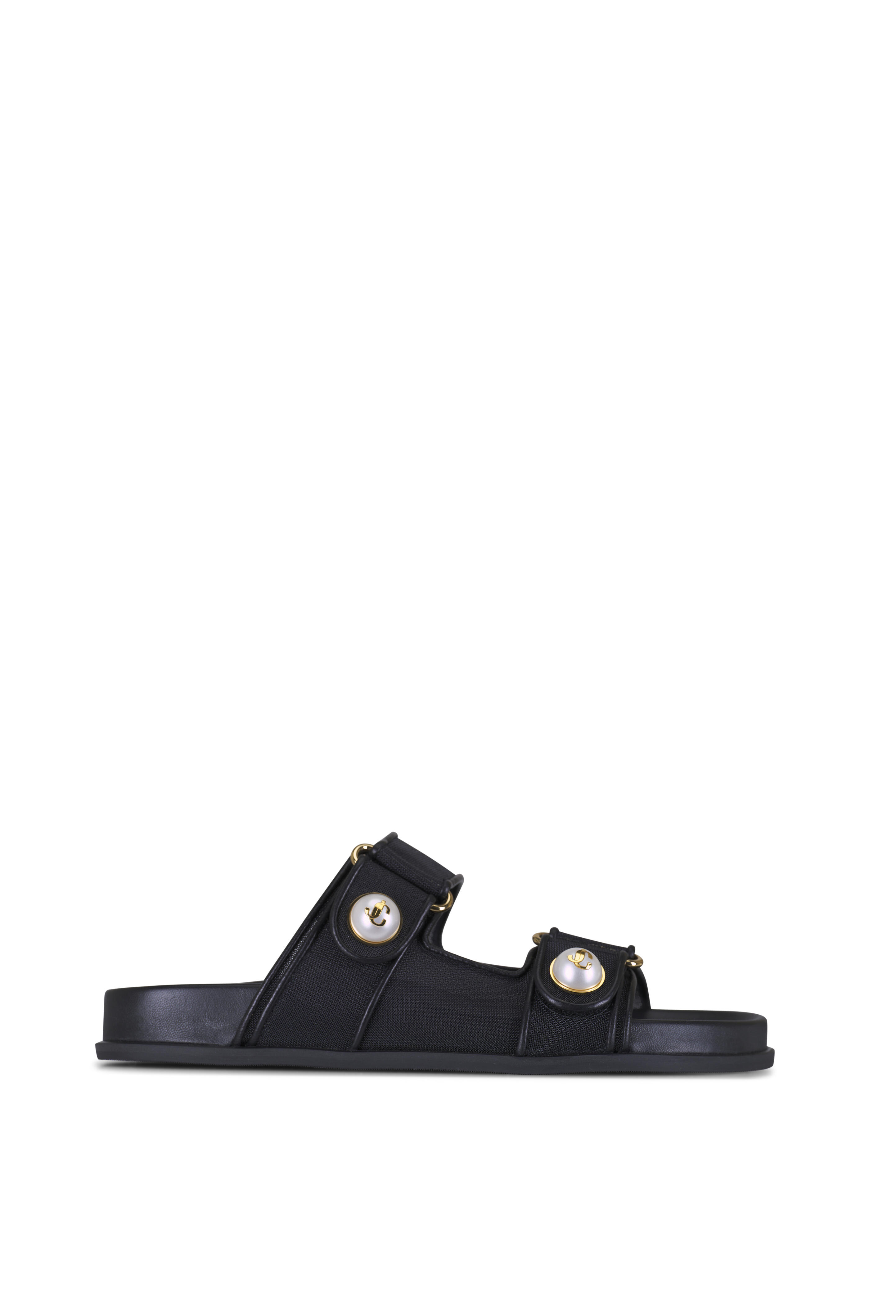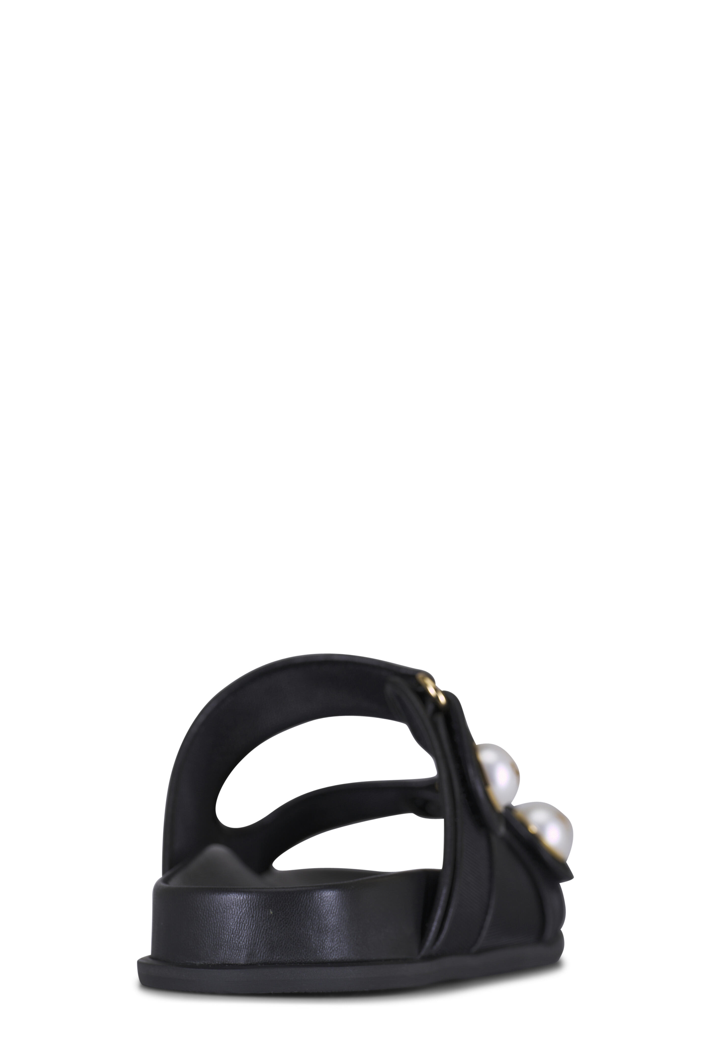 Leather upper. Round, open toe. Slip on style; adjustable strap. Pearl embellishment. Leather lining; molded comfort footbed. Rubber sole. Made in Spain.