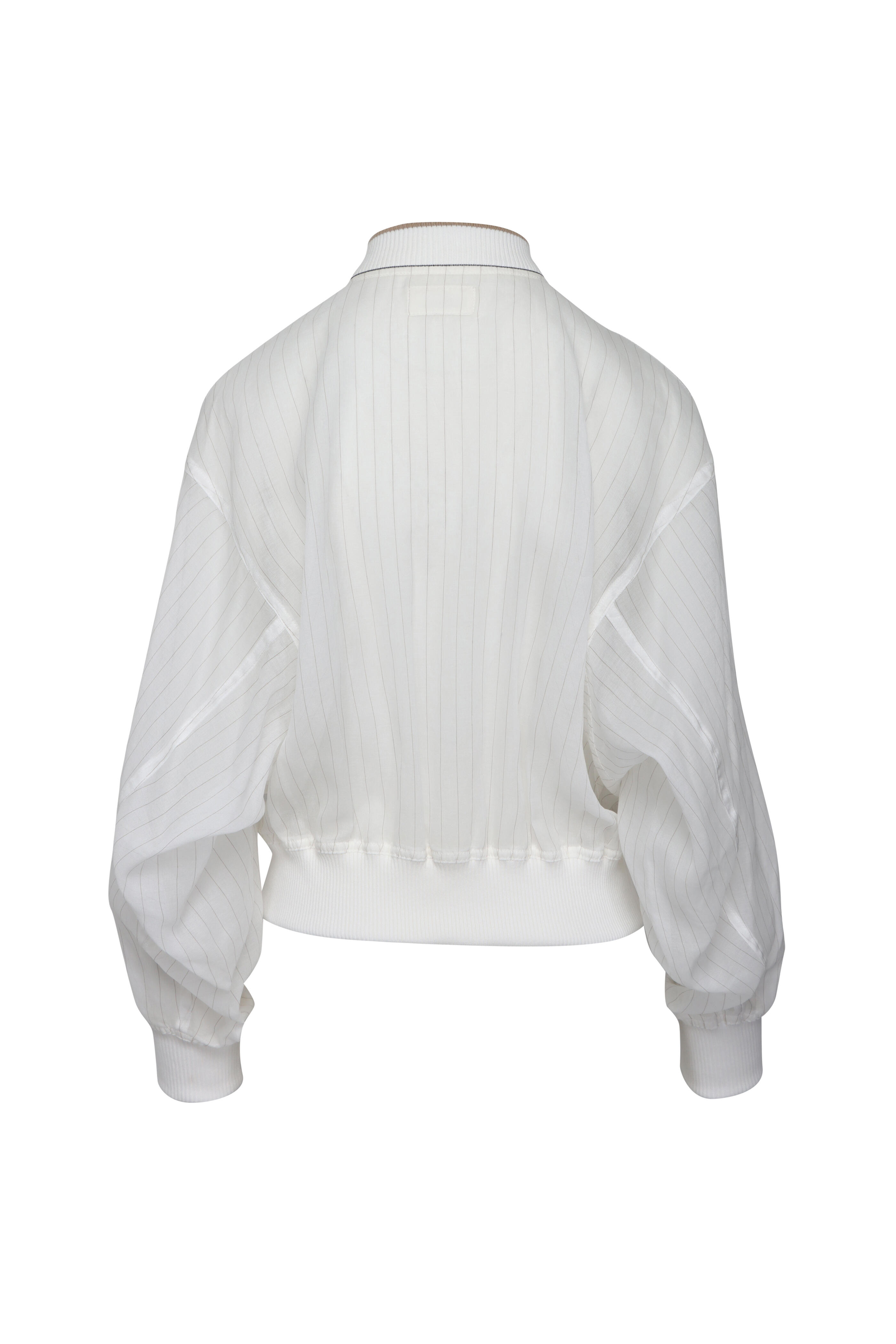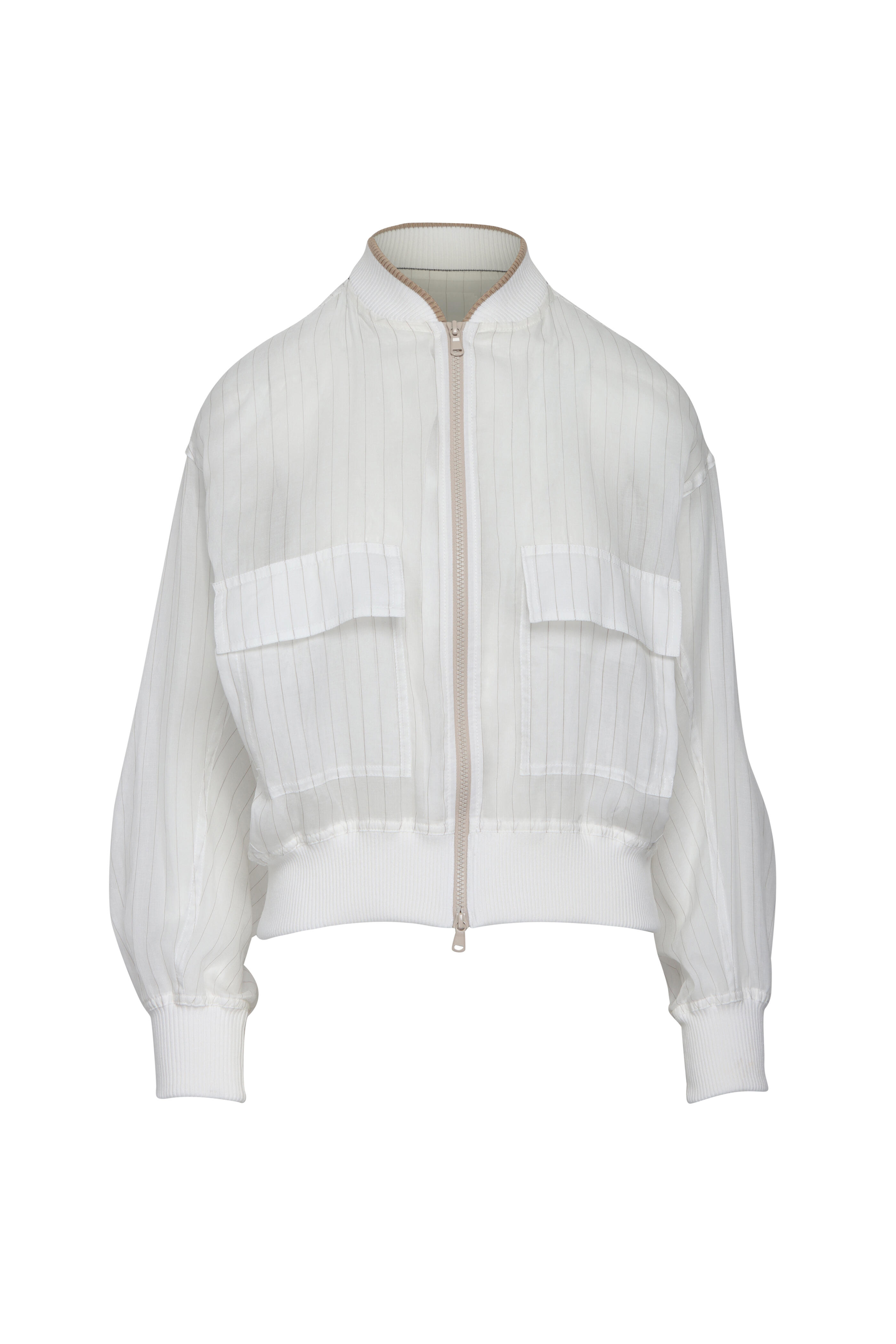 Bomber collar. Long sleeves. Front dual zip closure. Chest flap patch pockets. Knit collar, cuffs, and hem. Semi sheer fabrication. Made in Italy. 100% cotton. Dry clean.