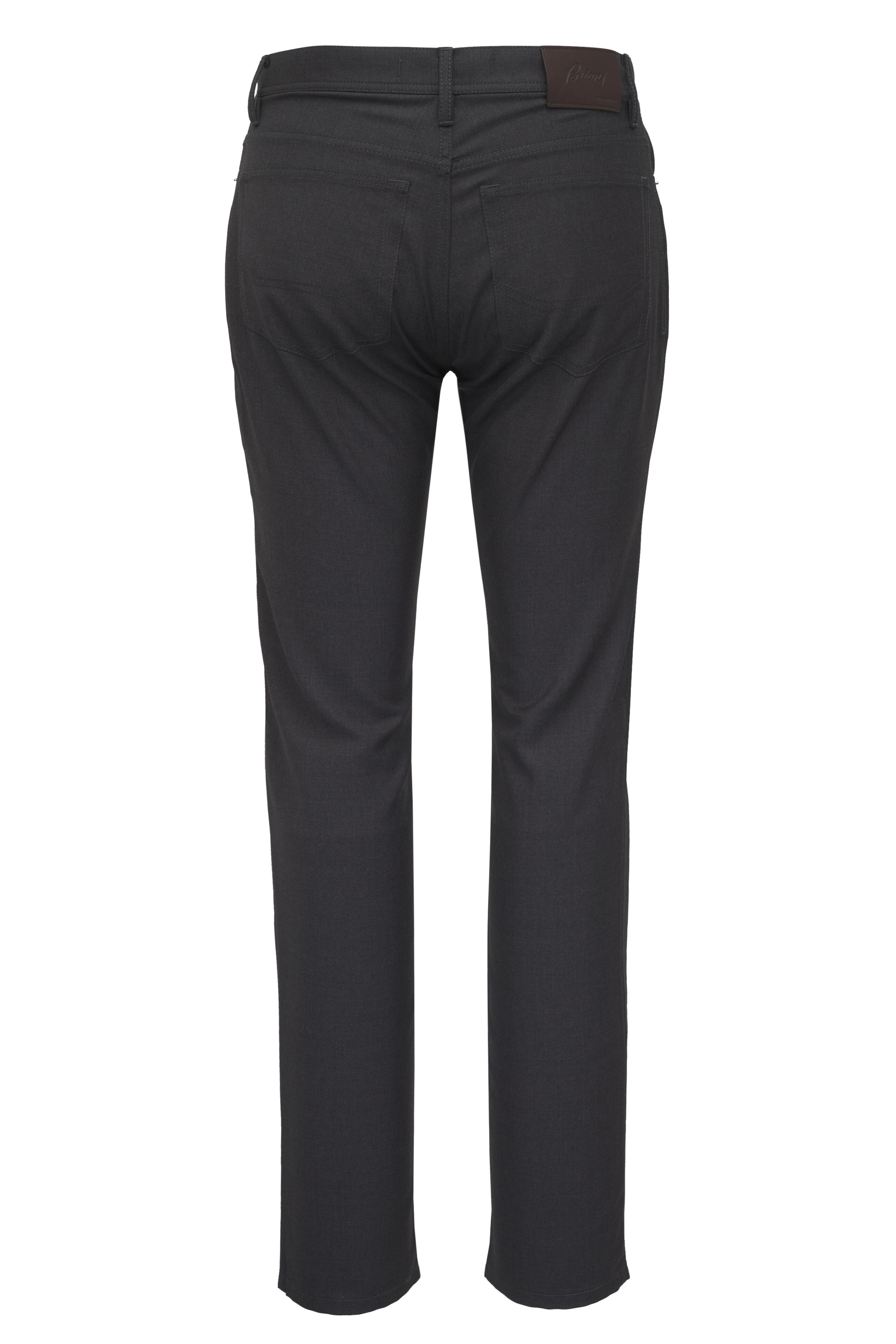 Zip fly; button closure. Banded waist; belt loops. Five-pocket styling. Made in Italy. 100% wool. Machine wash.