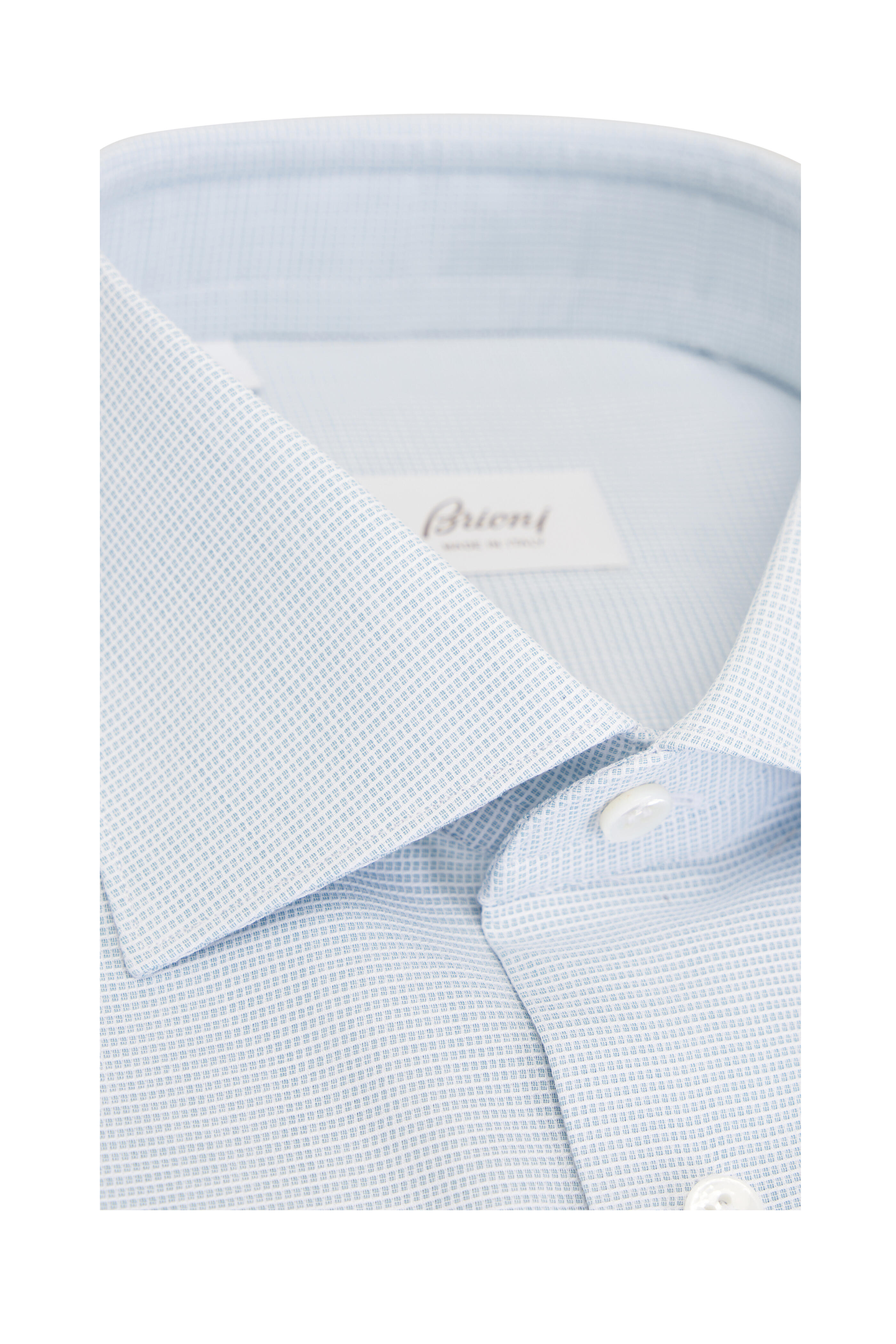 Spread collar. Front button placket. Single button cuffs. Made in Italy. 100% cotton. Machine wash.