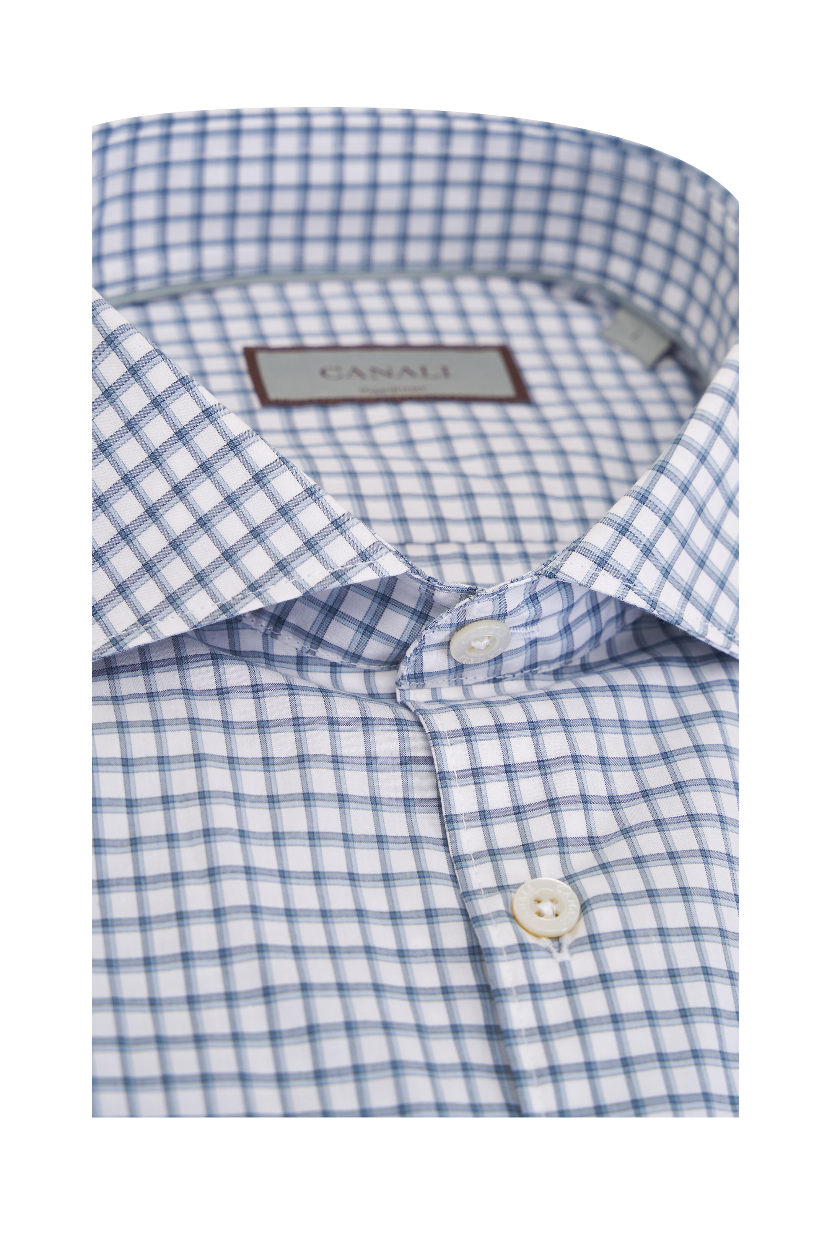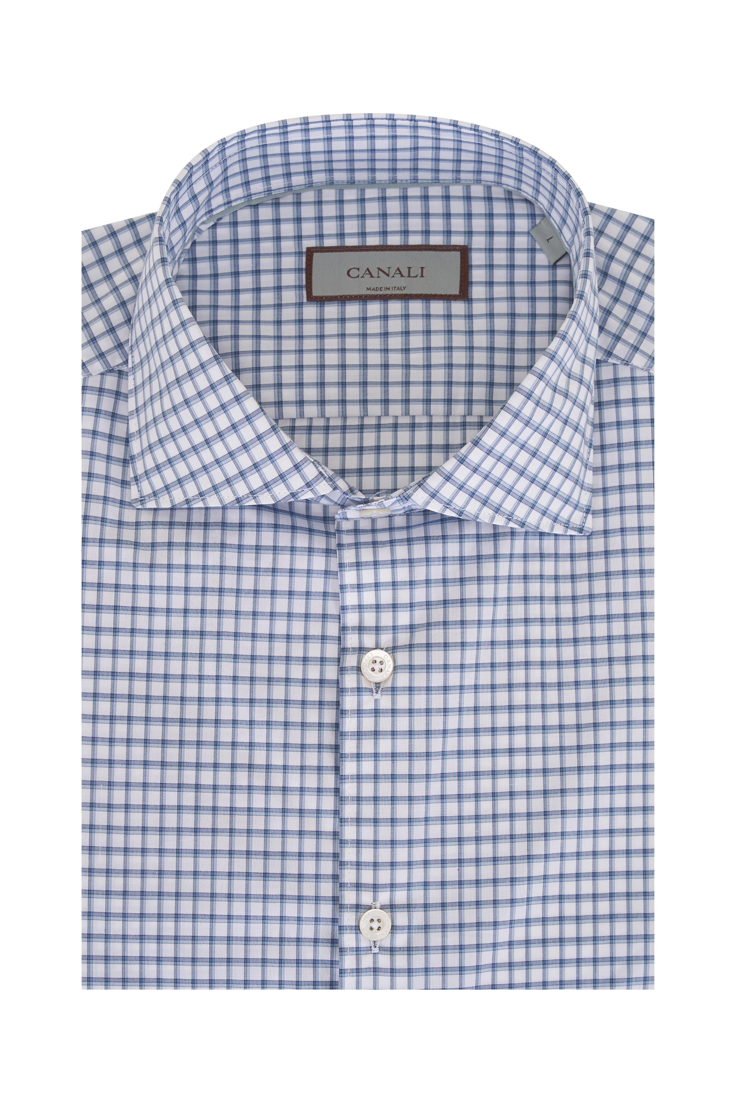 Spread collar. French placket. Single button barrel cuffs. Made in Italy. 100% cotton. Machine wash.