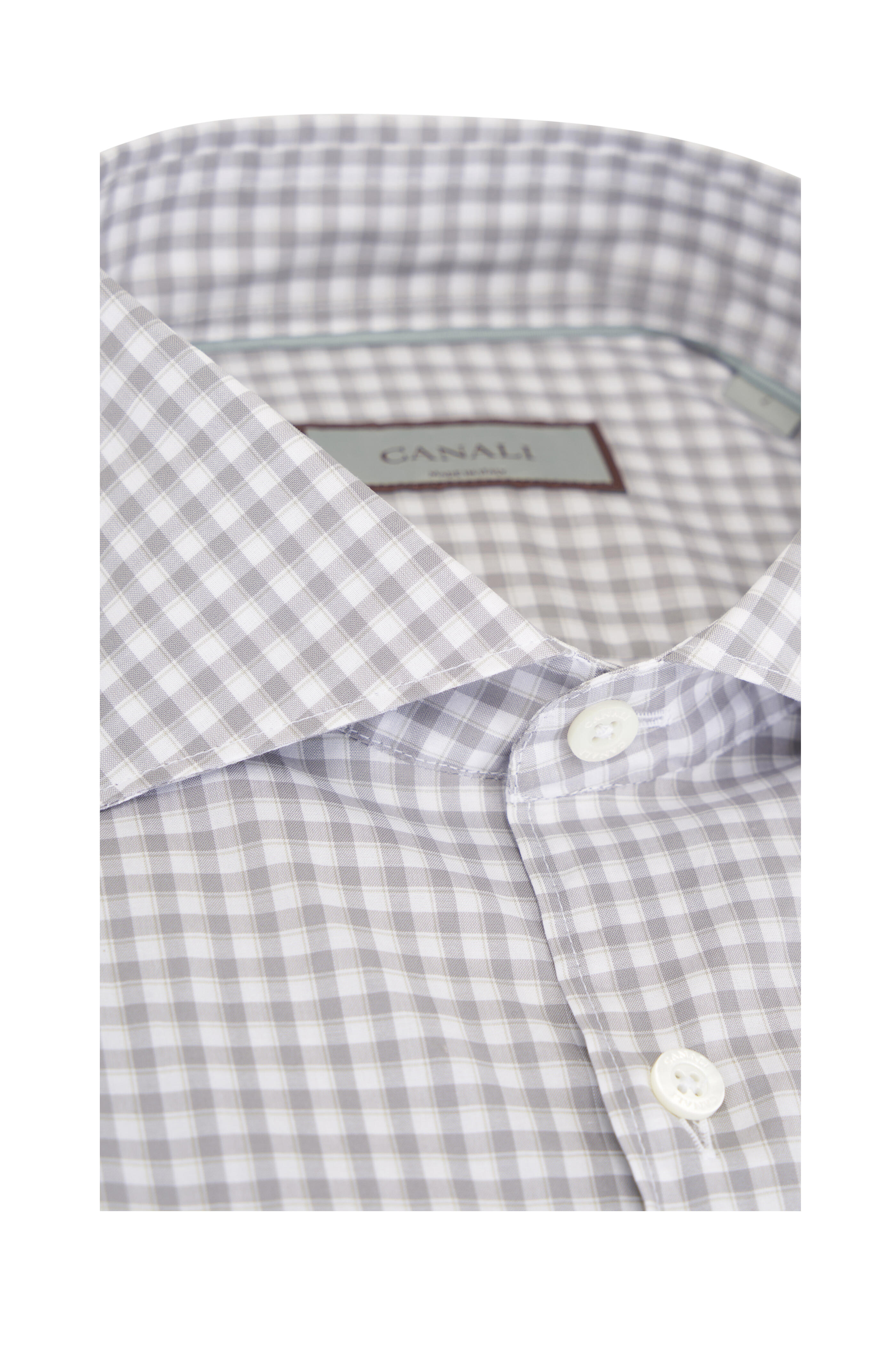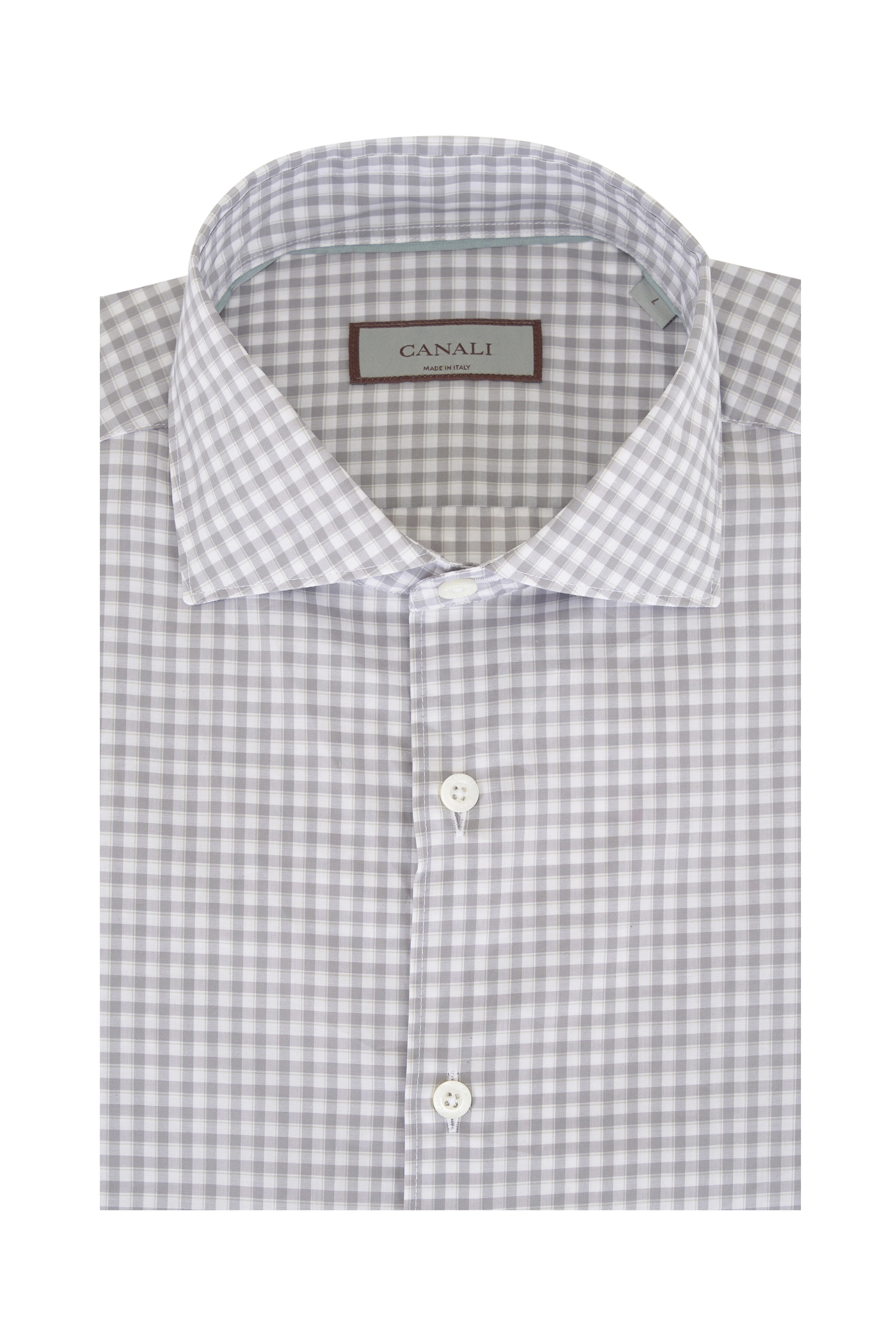 Spread collar. Front button placket. Single button barrel cuffs. Made in Italy. 100% Cotton. Machine wash.