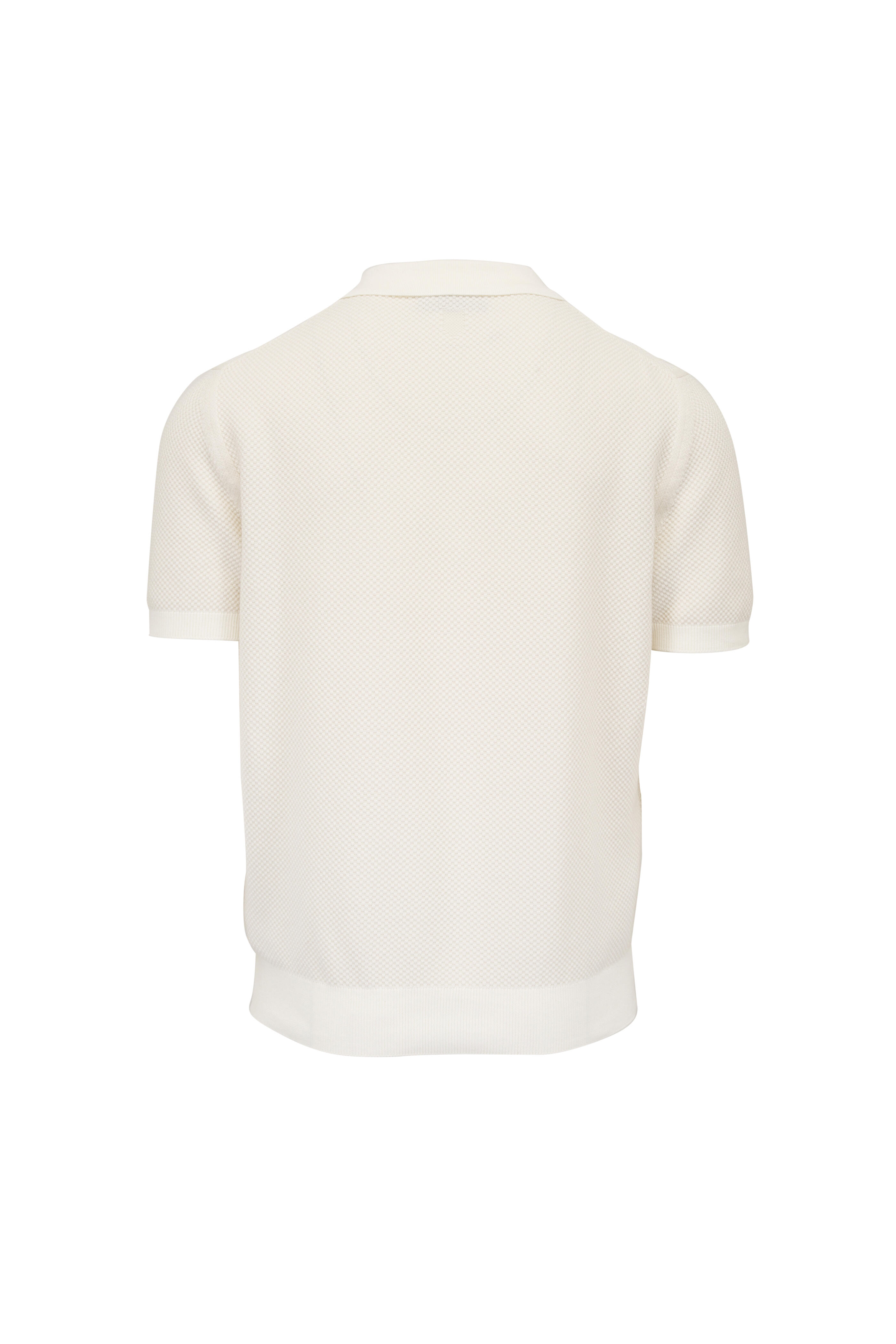 Spread collar. Three button placket. Ribbed trims. Made in Italy. 100% cotton. Machine wash.