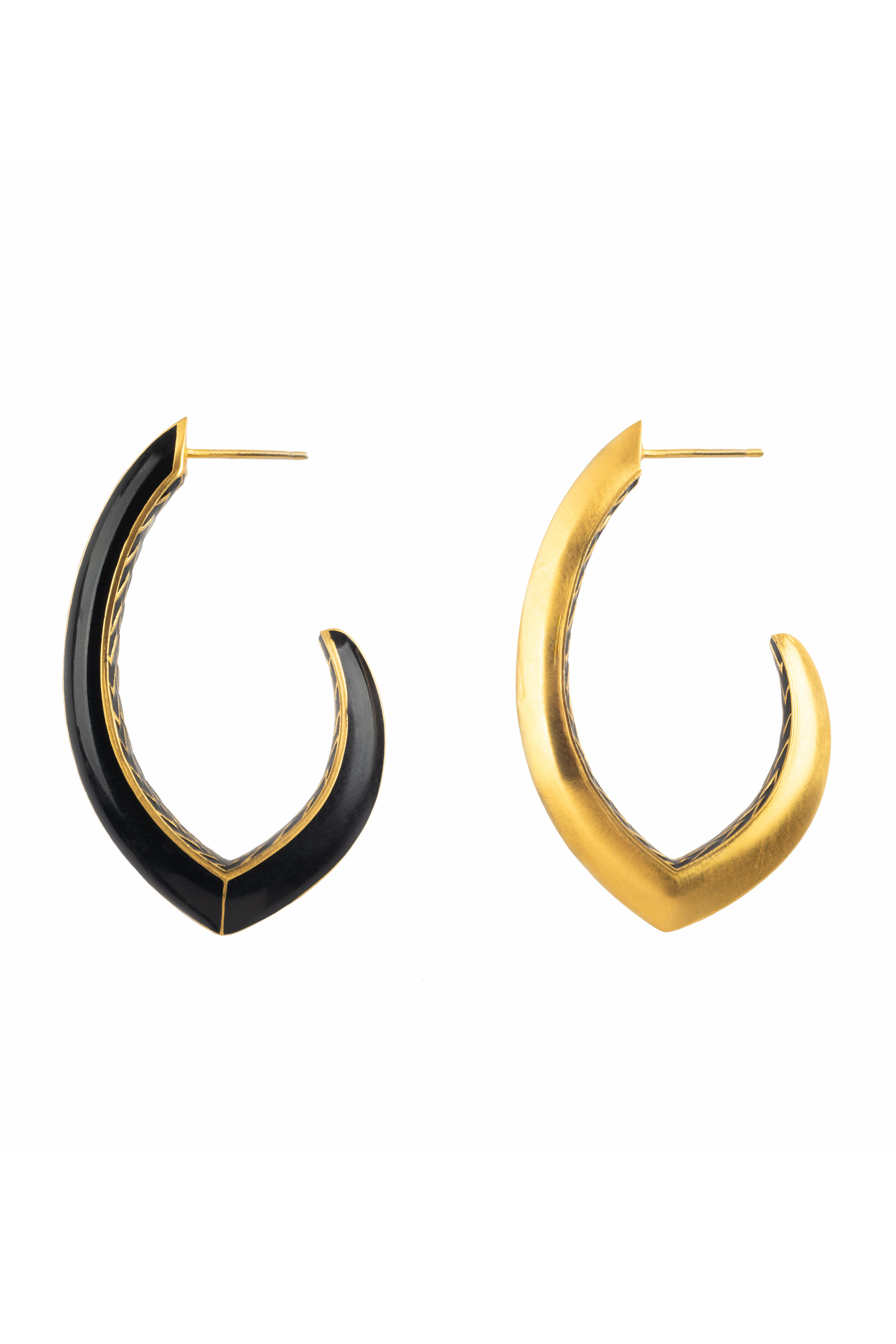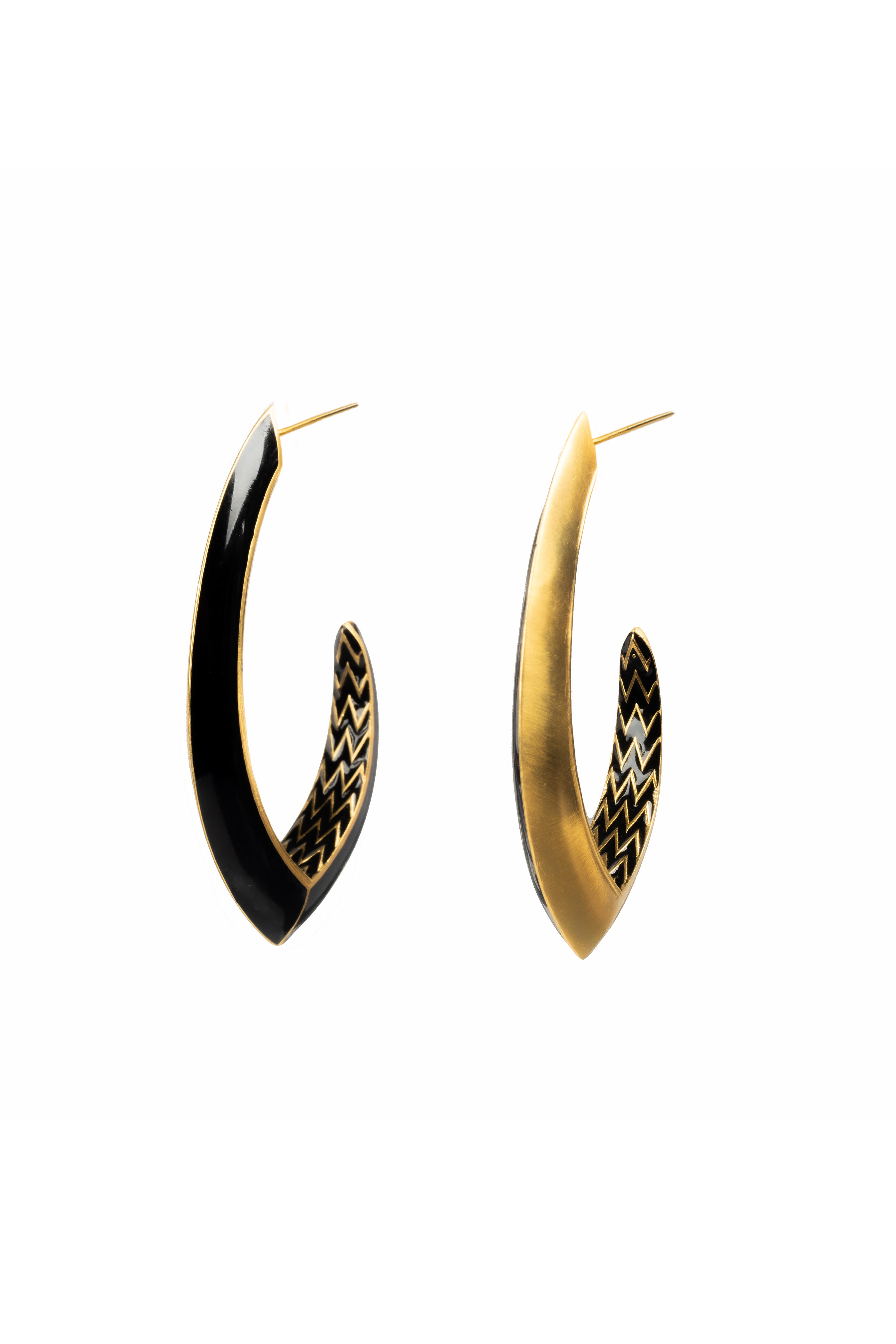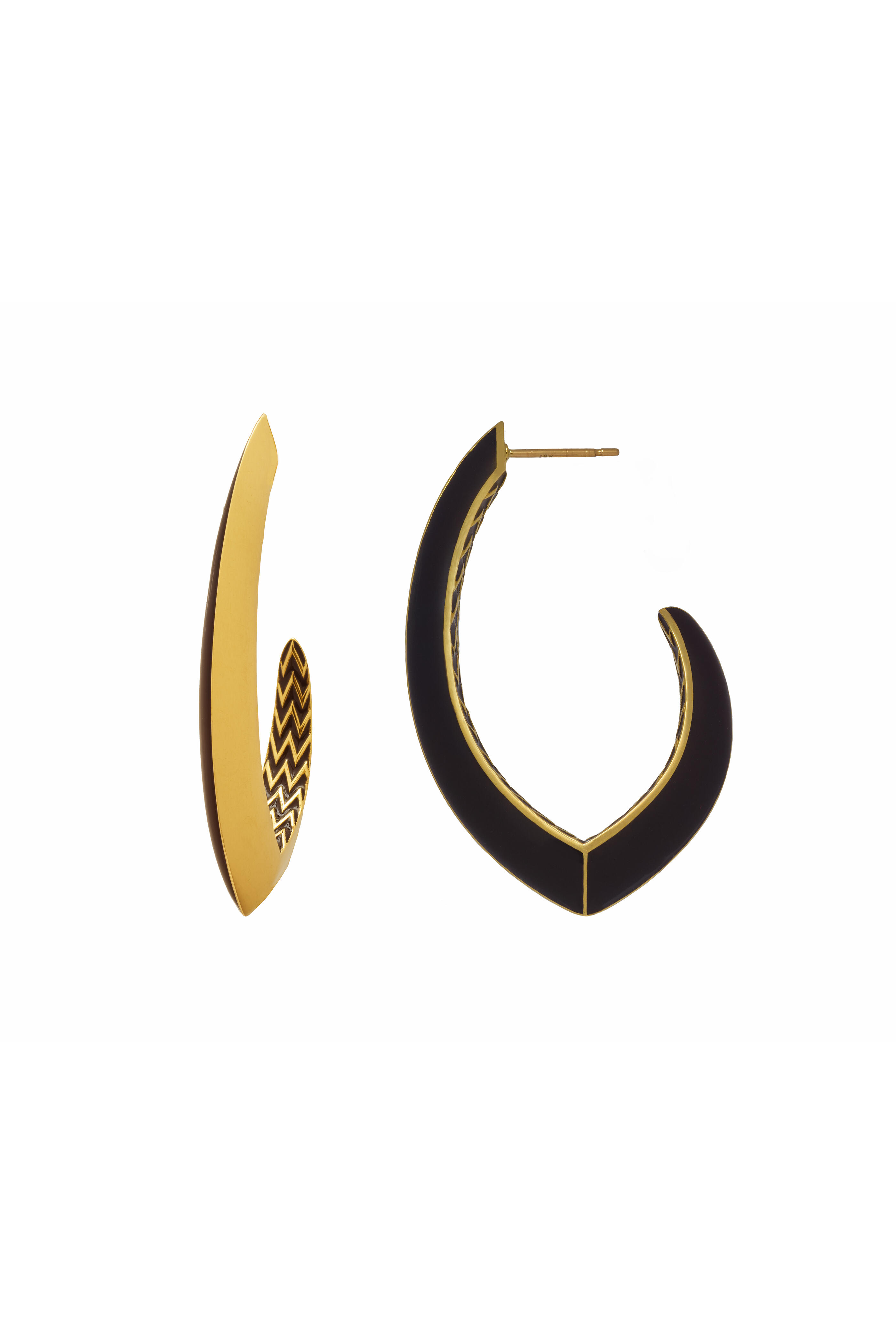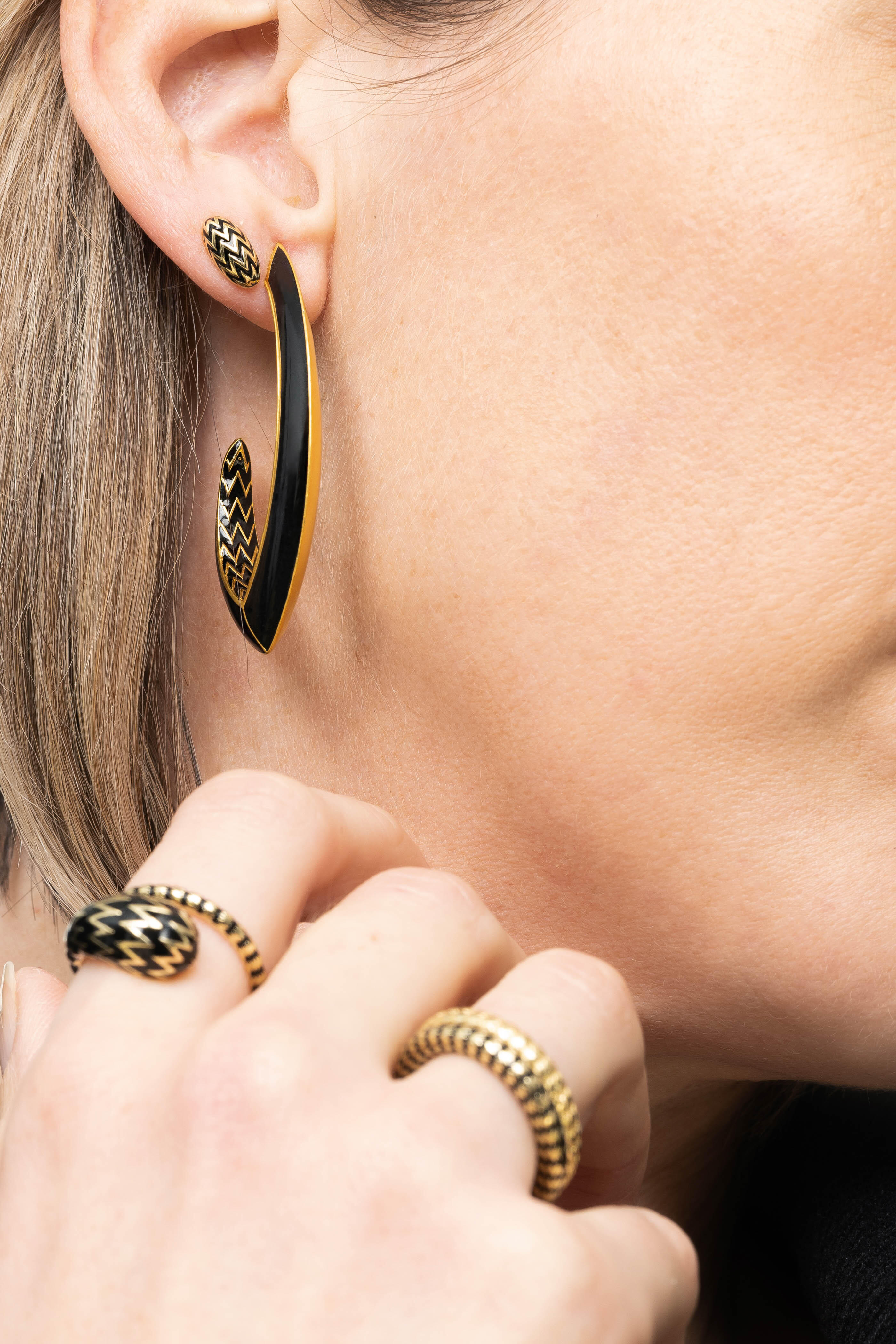 18k yellow gold. Black enamel. Chevron pattern design. Hoop style. Push back post. Handmade and designed in India.