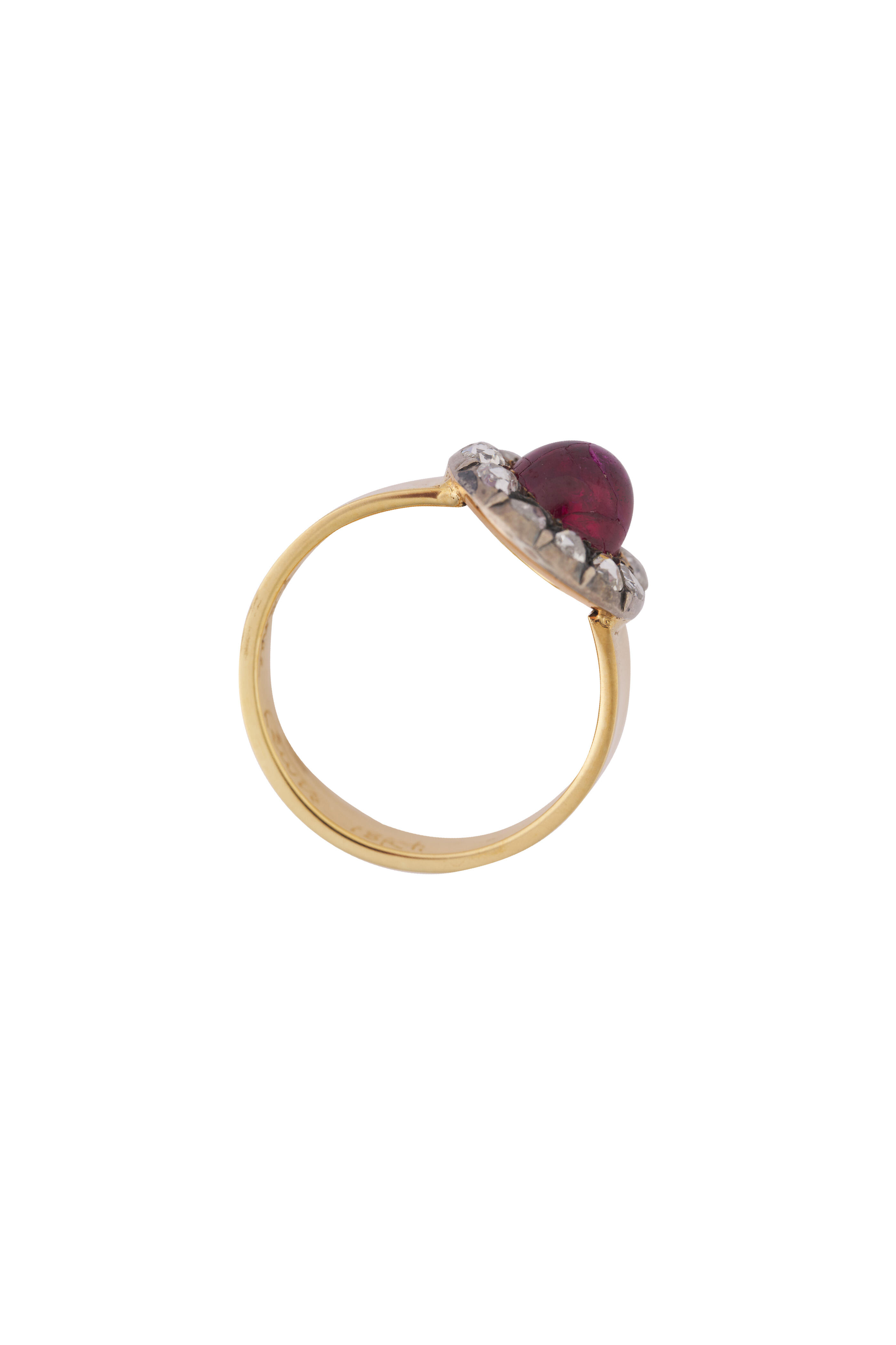 18k yellow gold. 18k white gold. Rosecut diamond. Natural ruby.