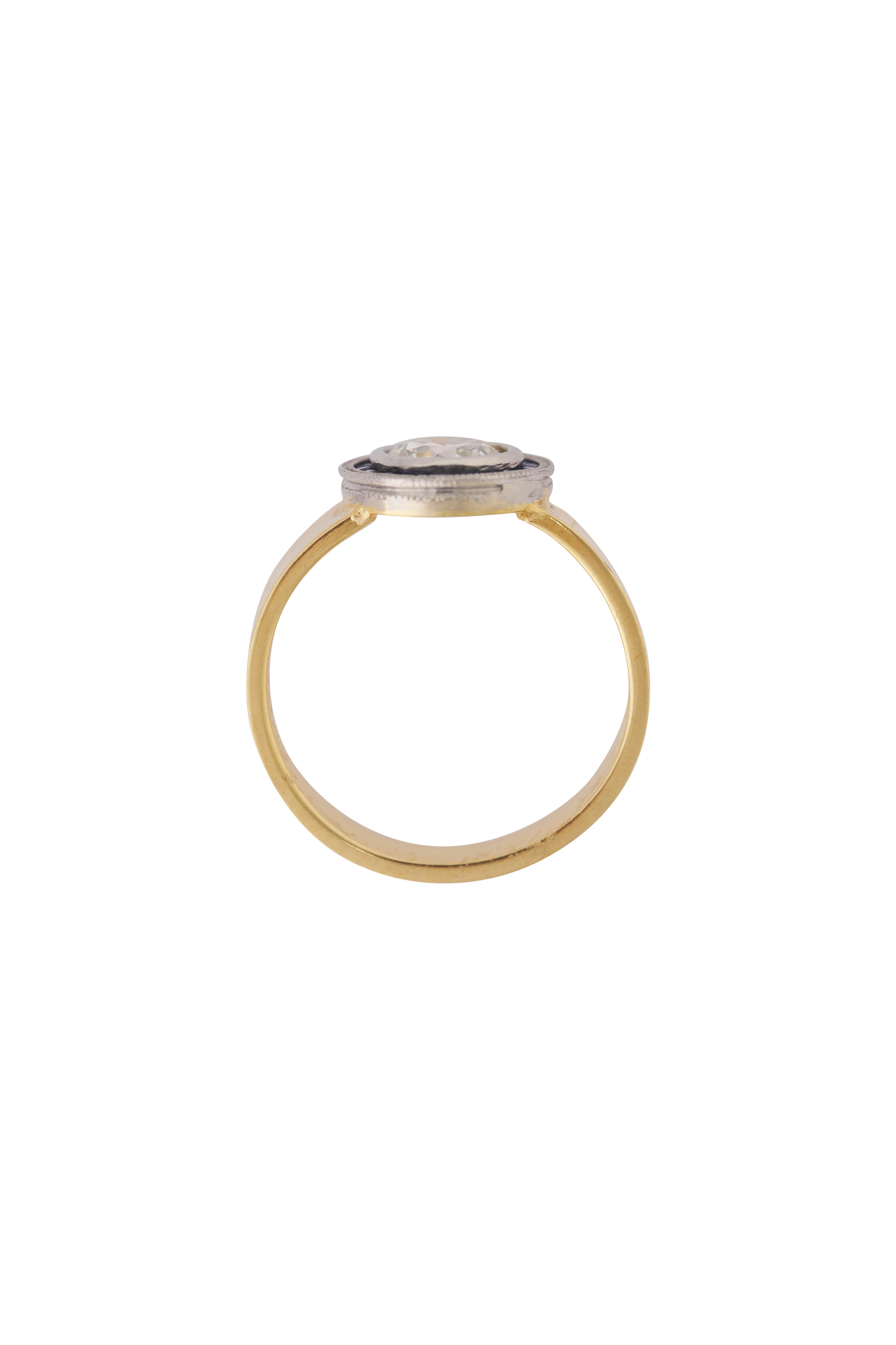18k yellow gold. Platinum. French cut sapphire. Diamond.